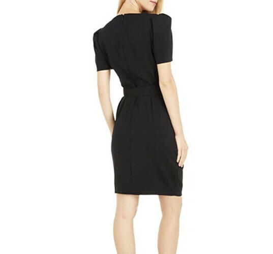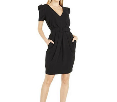 Make power moves in the Badgley Mischka Odessa Pleated Crepe Dress that features a sheath silhouette, belted waist, and a pleated crepe fabric. Short dress flaunts a V-neckline and short puff sleeves. Side hand pockets. Concealed zipper back closure. Straight hemline falls above the knees. 98% polyester, 2% spandex. Dry clean only. Imported
