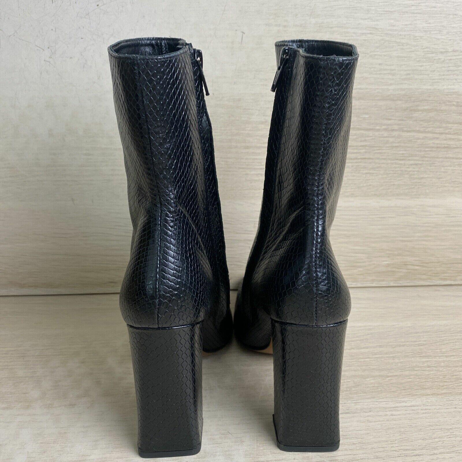 BY FAR Black Leather Snake Print Round Toe Side Zip Block Heel Boots, Women’s 40