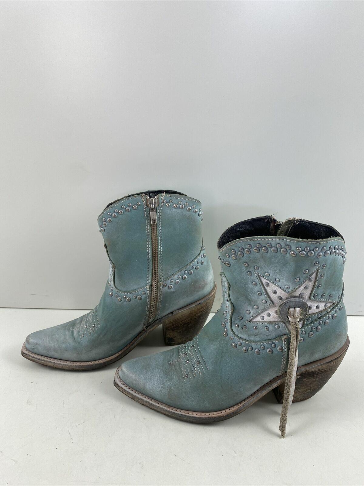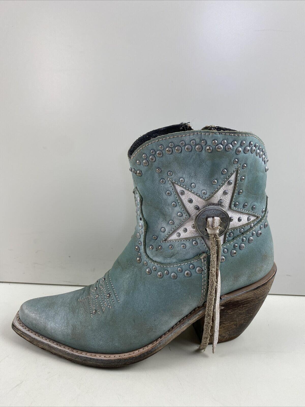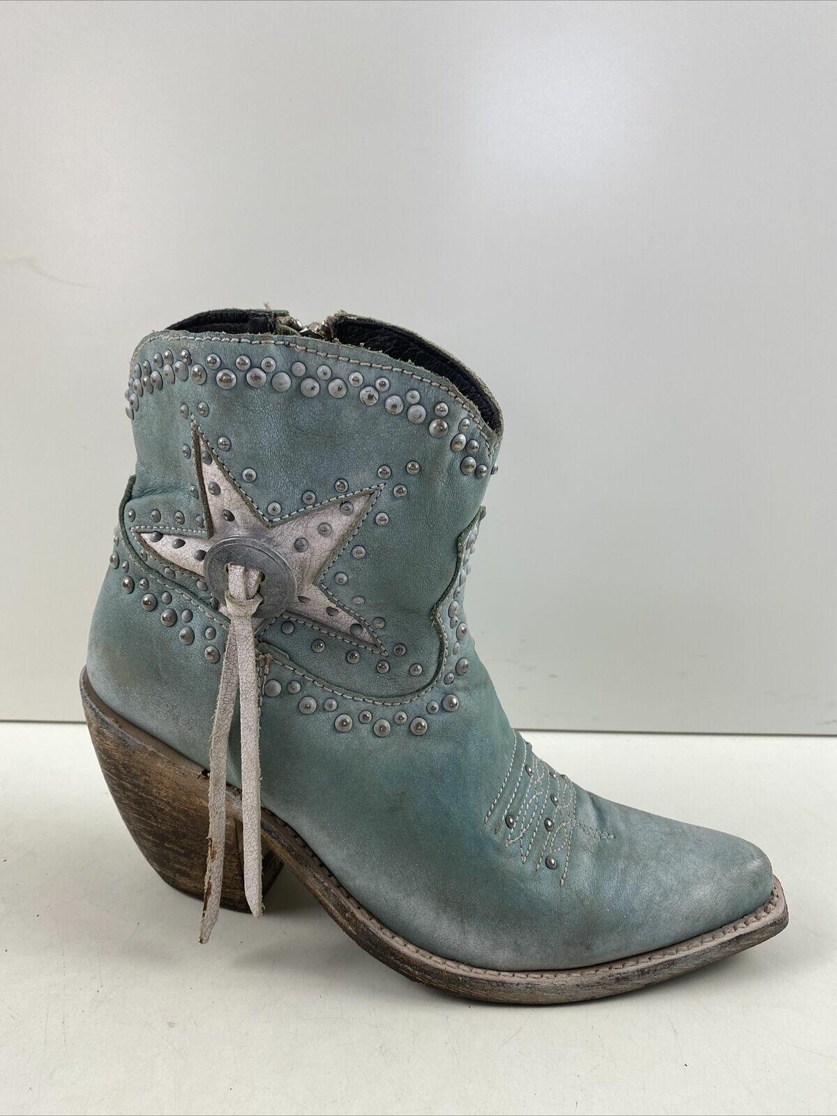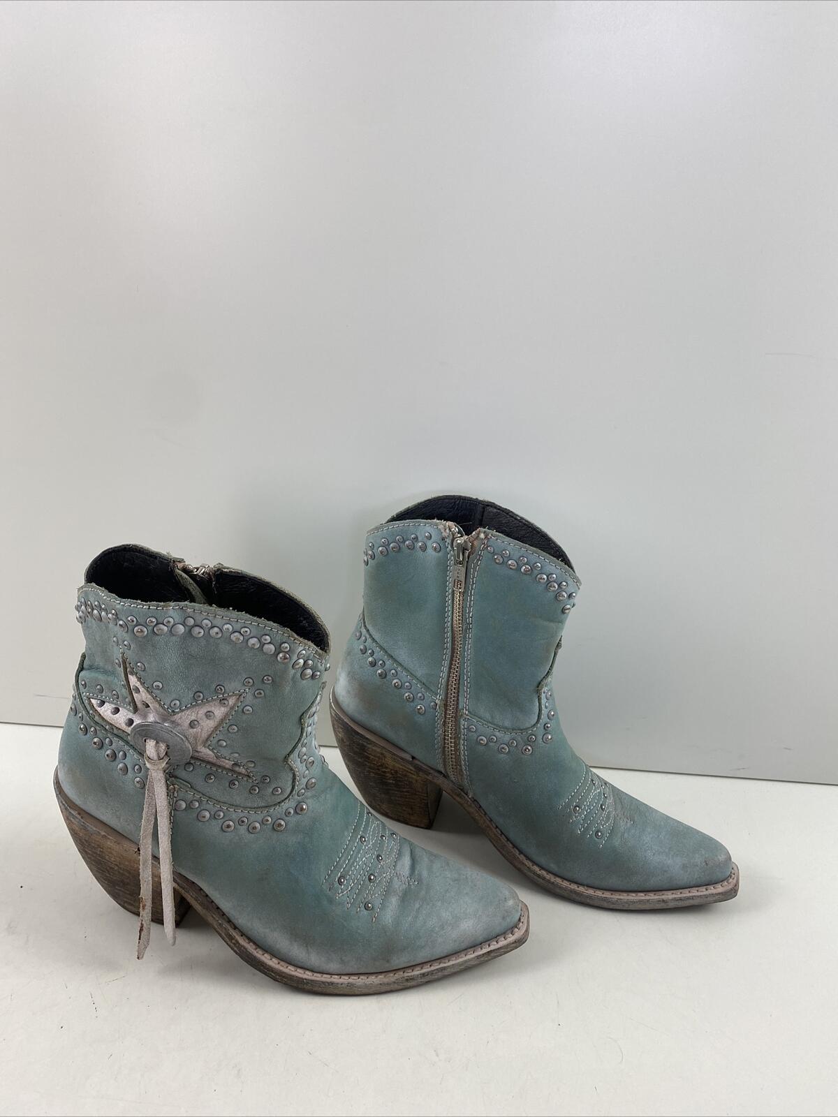 Liberty Black Studded Blue Leather Snip Toe Side Zip Western Booties Women’s 7
