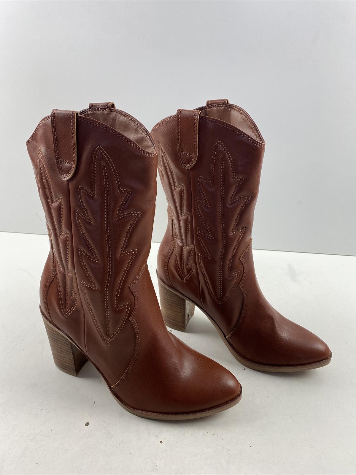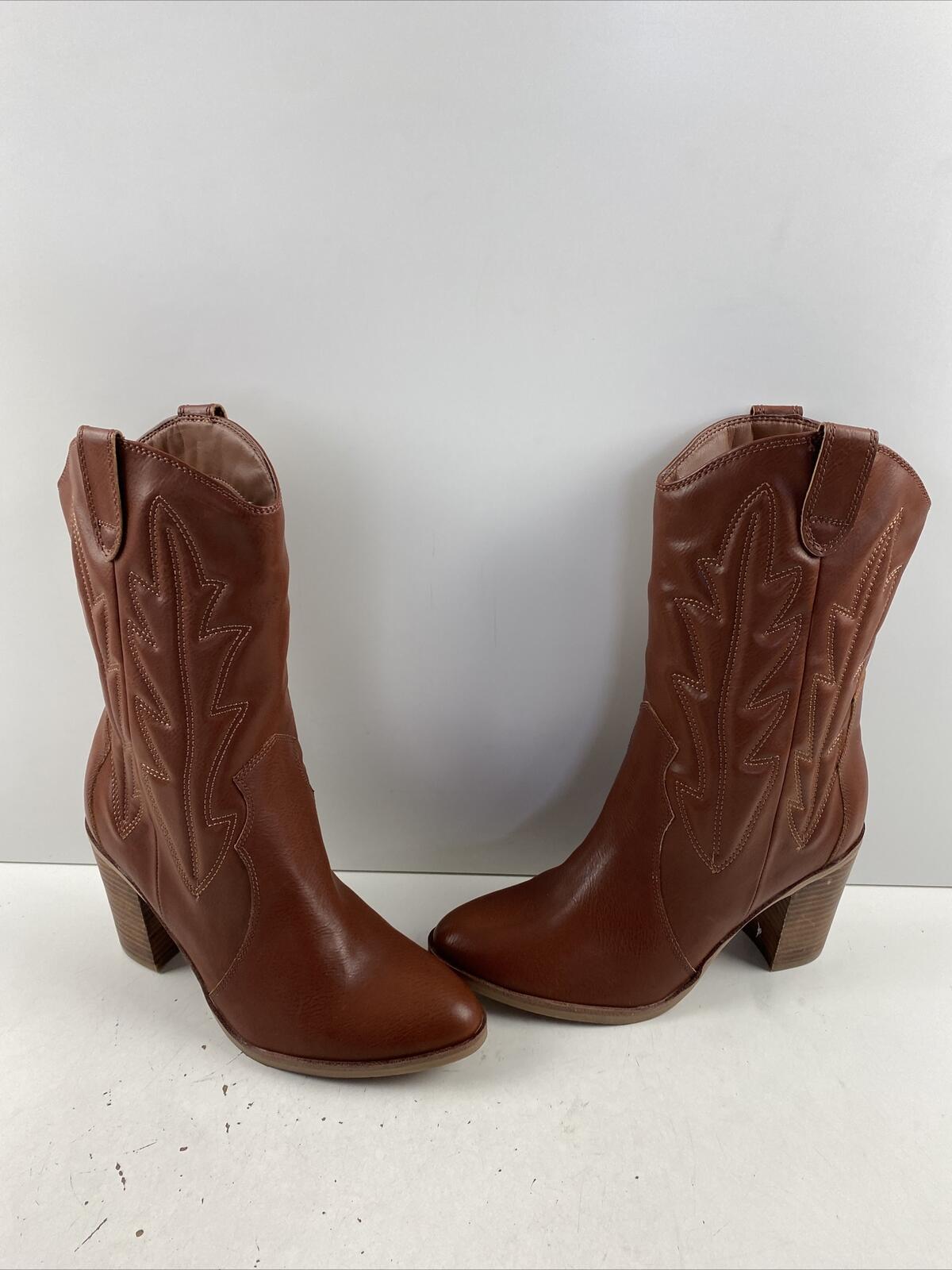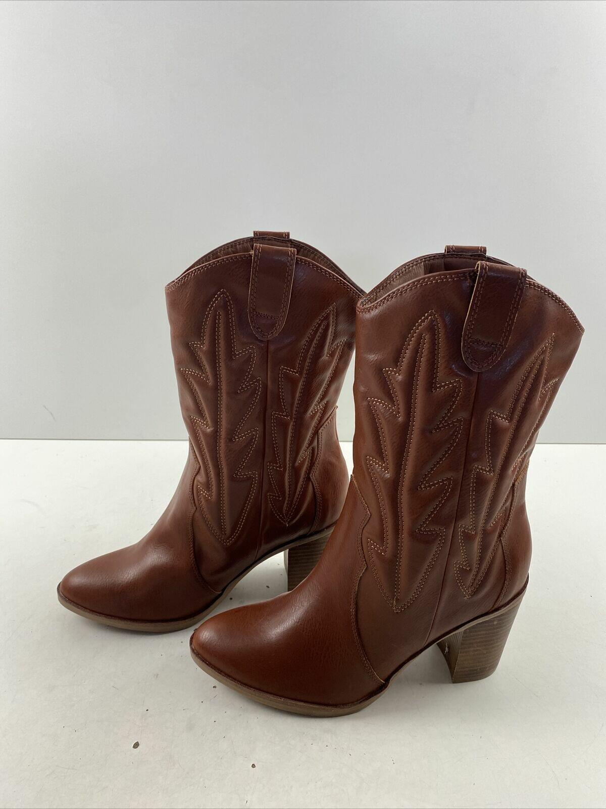 MIA ‘RAYLIN’ Brown Faux Leather Round Toe Pull On Block Heel Boots Women’s 7.5 M - Ufashion