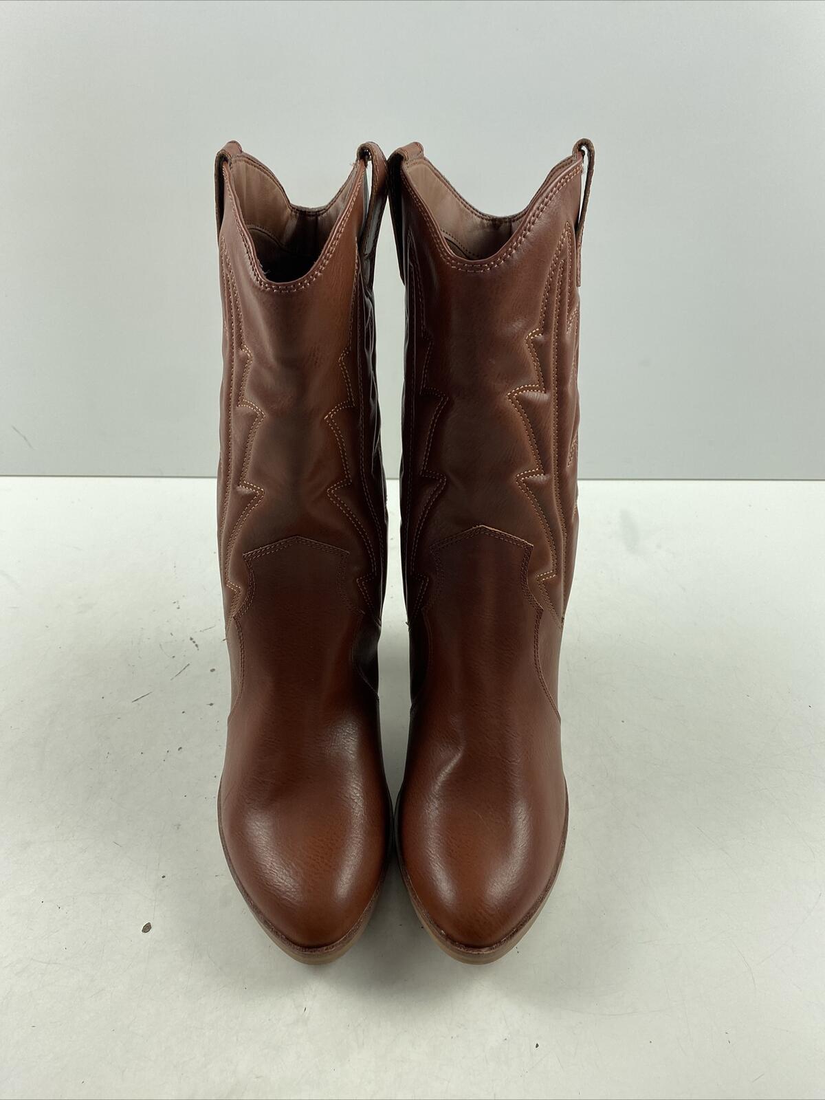 MIA RAYLIN Brown Faux Leather Round Toe Pull On Block Heel Boots Womens 7.5 M