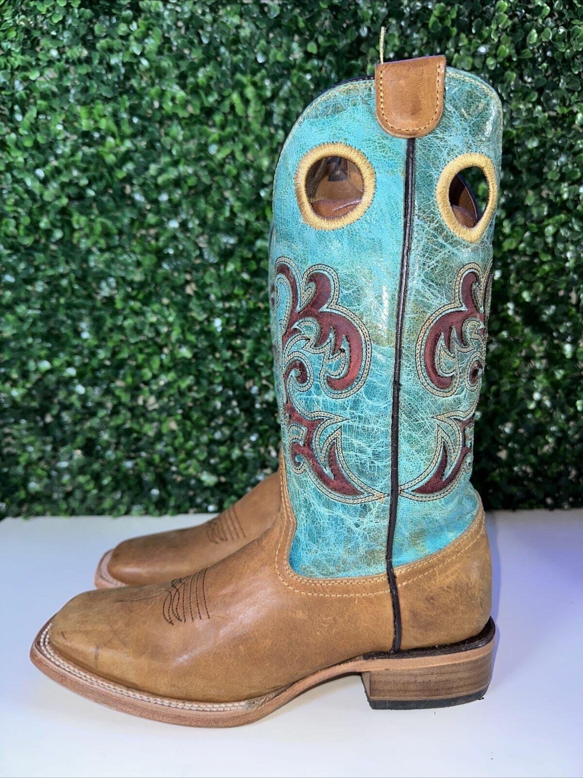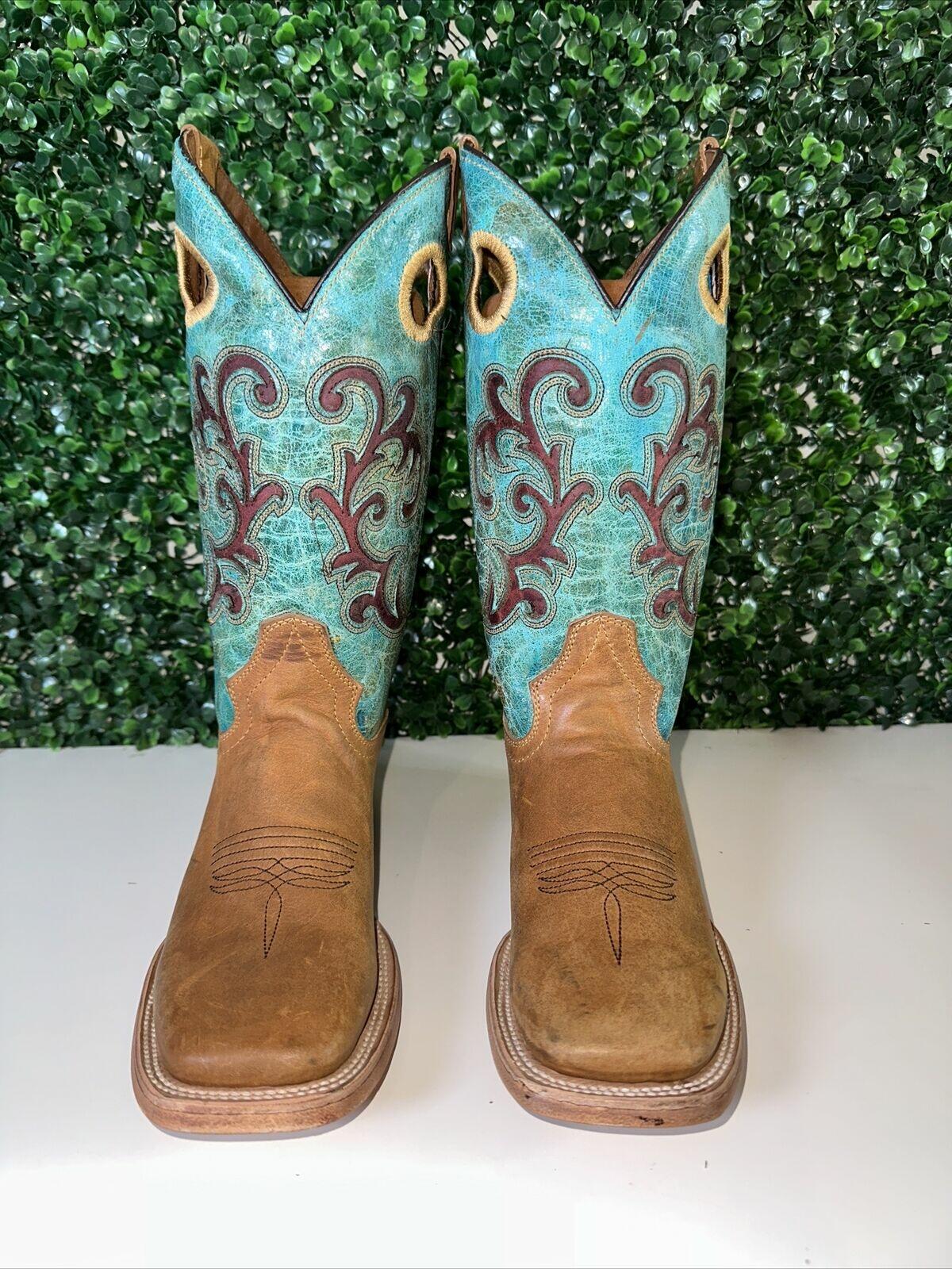 This is a beautiful pair of Circle G boots for women in size 7. The honey and turquoise inlay and embroidery add a stunning pop of color to the already stylish western design. The square toe and wide calf width make these boots comfortable for all-day wear. The upper material is made of high-quality leather, ensuring these boots will last for years to come. Perfect for any occasion, these boots will make a great addition to any wardrobe.