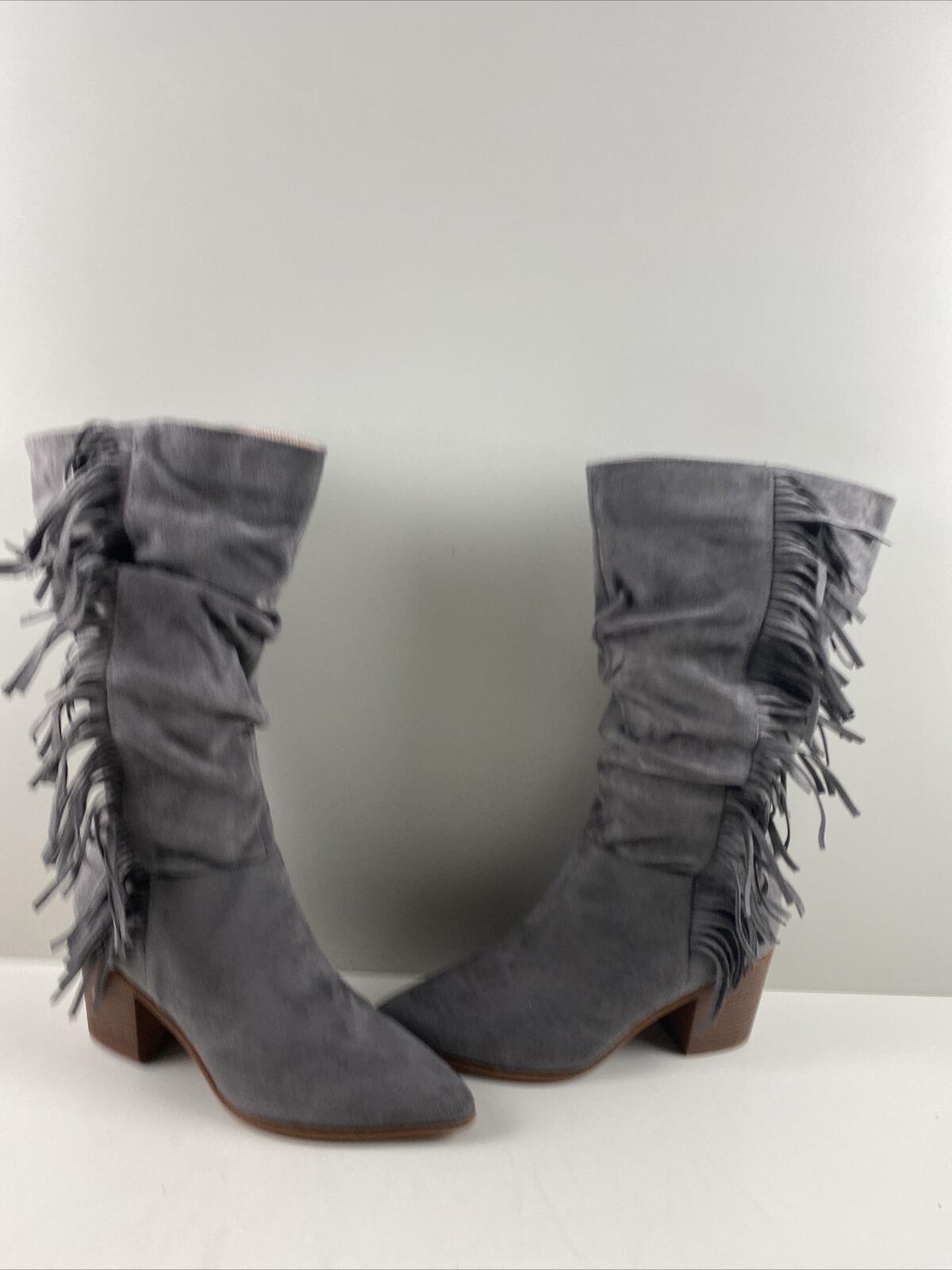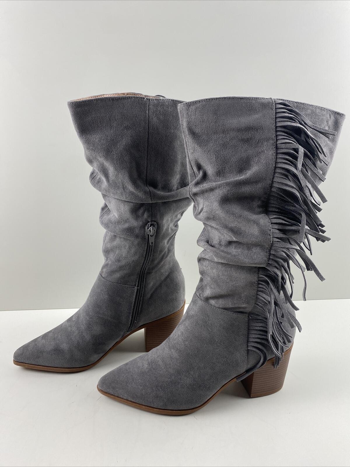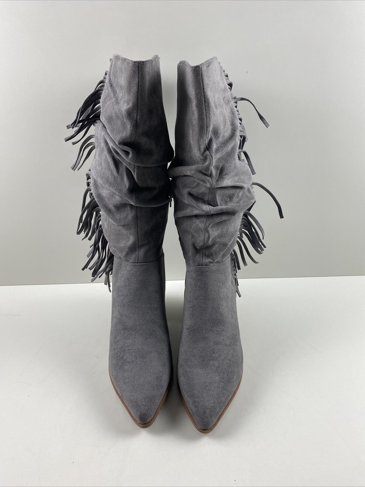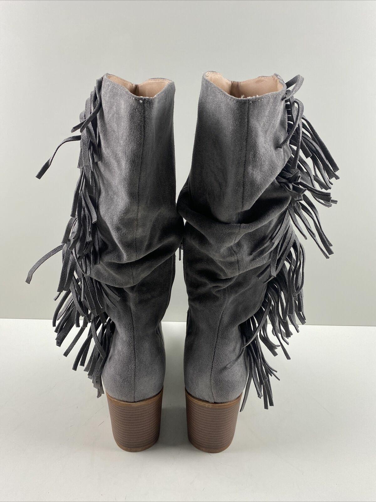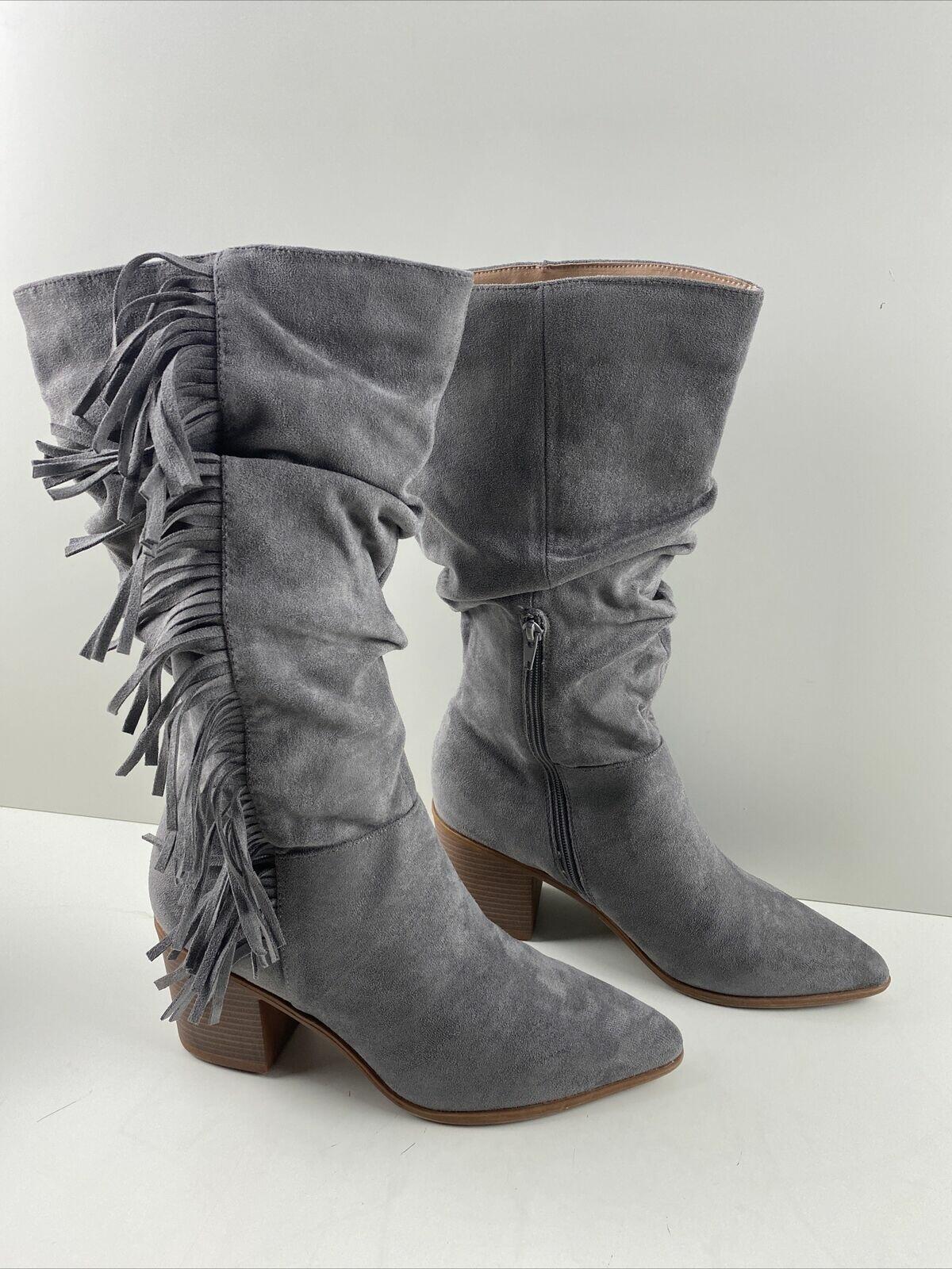 NWOB Journee Collection HARTLY Grey Fabric Pointy Toe Block Heel Fringe Boots 11 - Like New