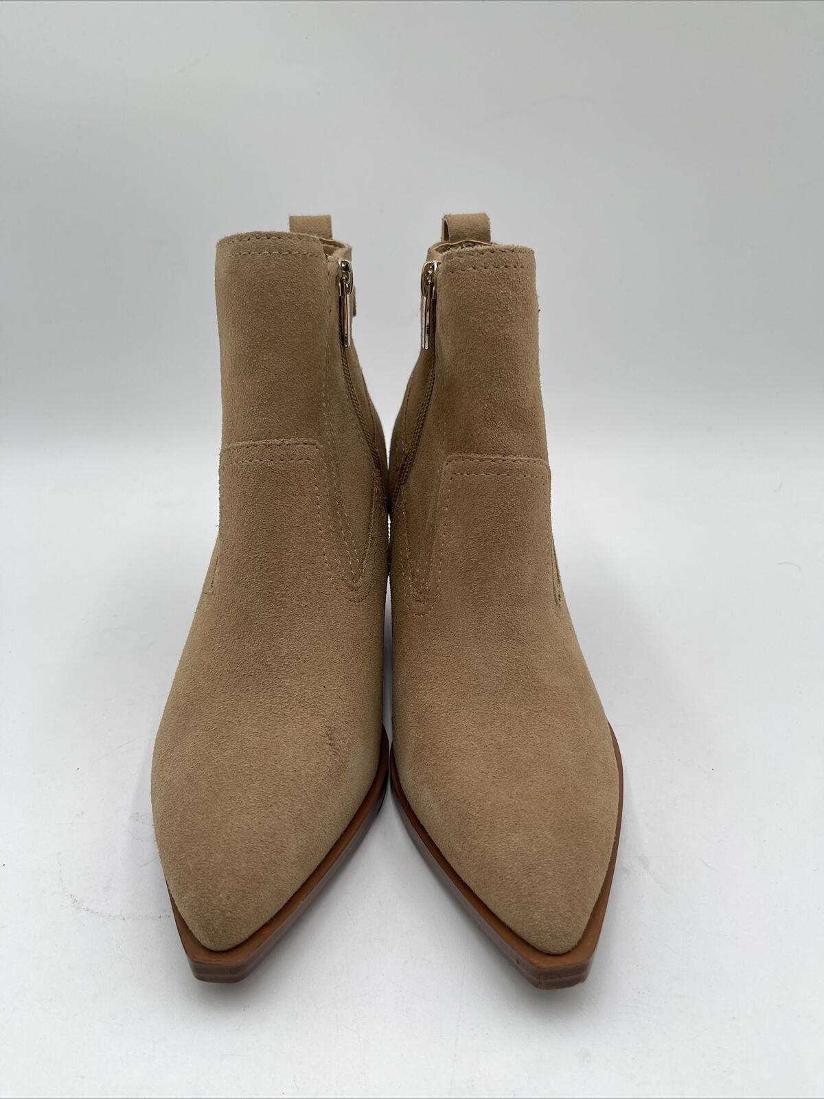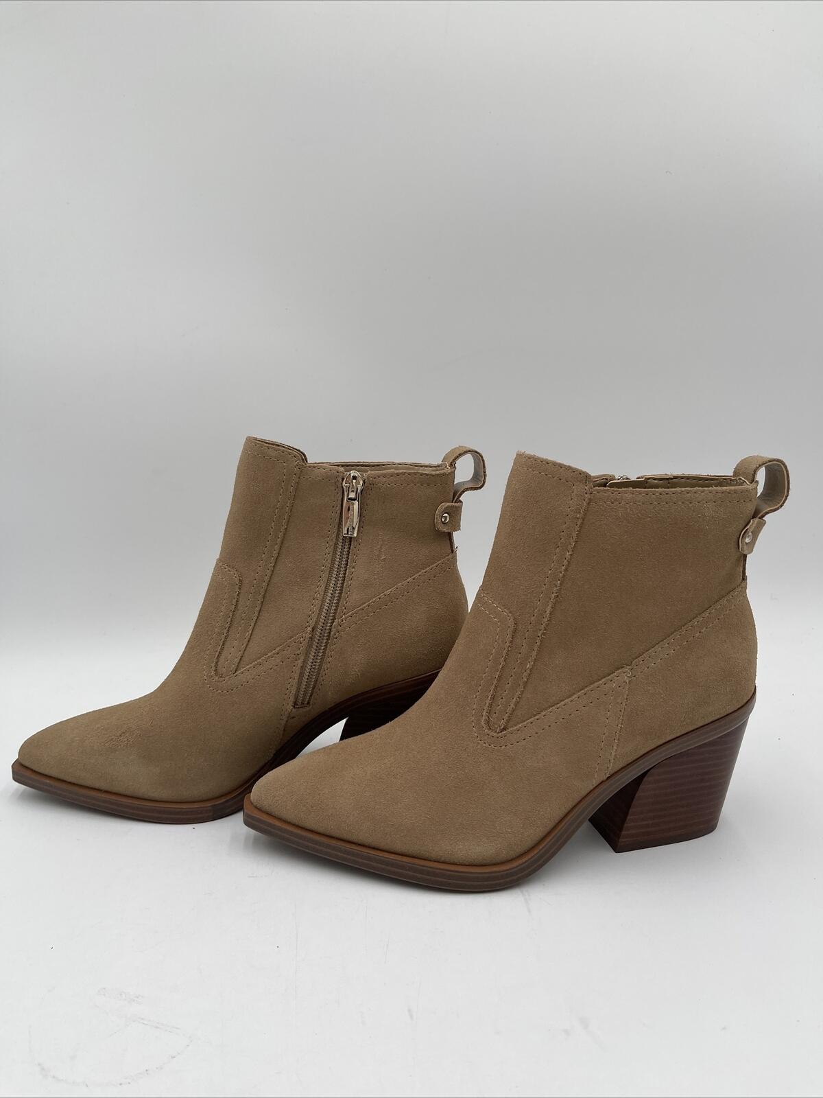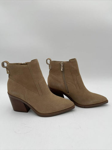 Elevate your style with these stunning Vince Camuto Briyeonda Western Booties in a beautiful beige color. These booties have a pointed toe and a high block heel, adding a touch of sophistication to any outfit. They are made of high-quality suede material and come in size 6M/36.5 with pull-on tabs for easy wear. Perfect for casual occasions, these booties are a must-have addition to any woman's shoe collection. The Vince Camuto brand is known for its quality and style, making these booties a great choice for any fashion-forward woman.D1