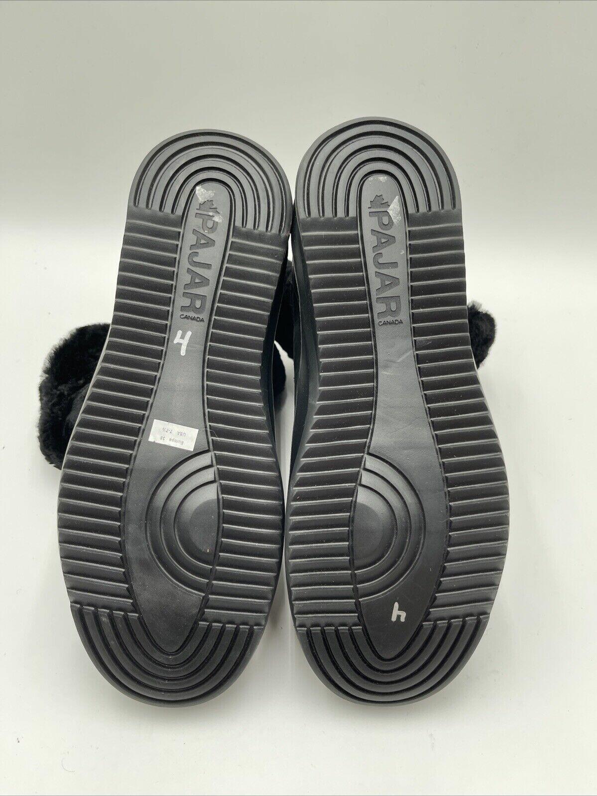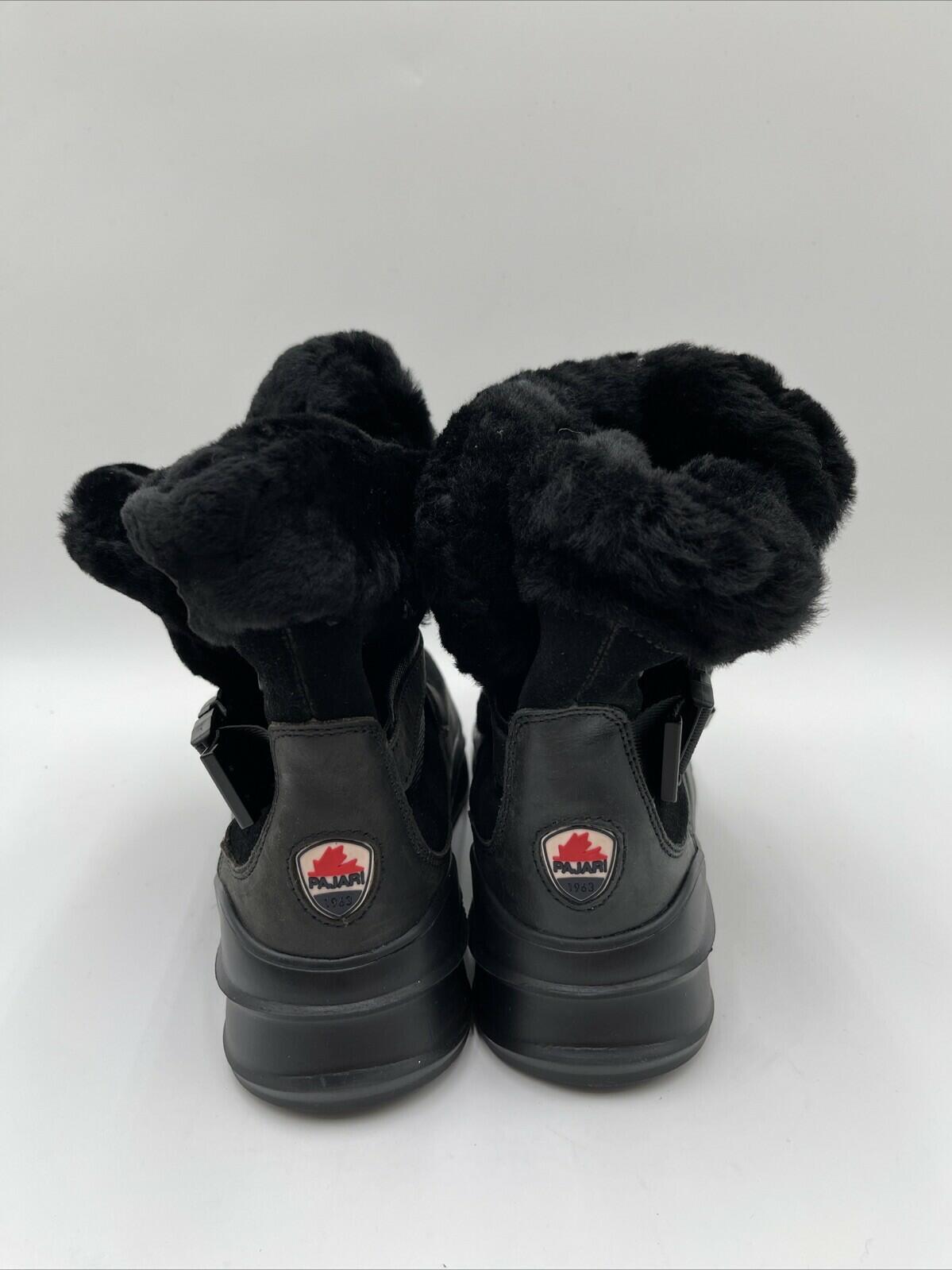 -Stains and sticker residue on bottomsElevate your winter wardrobe with these stylish Pajar Avi ankle boots. Featuring a round toe and low flat heel, these boots provide both comfort and style. The black leather upper is accented with shearling trim, suede detailing, and leather lining. The durable leather outsole ensures a long-lasting wear.