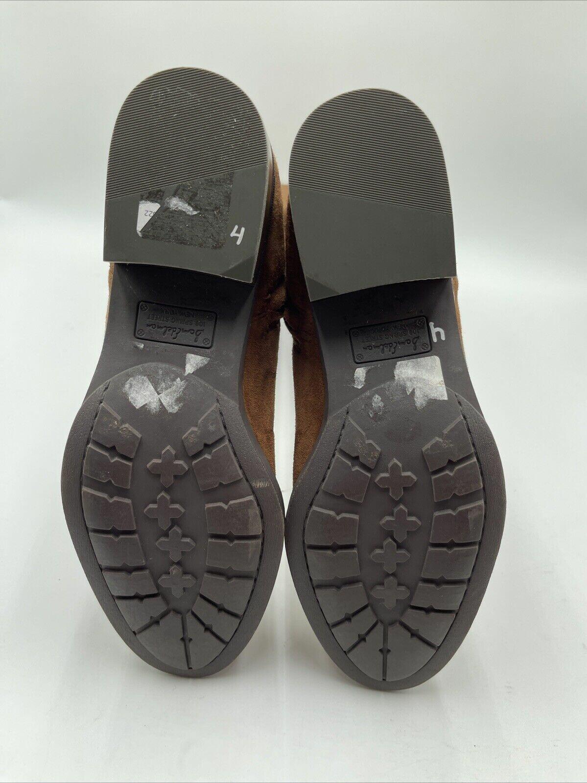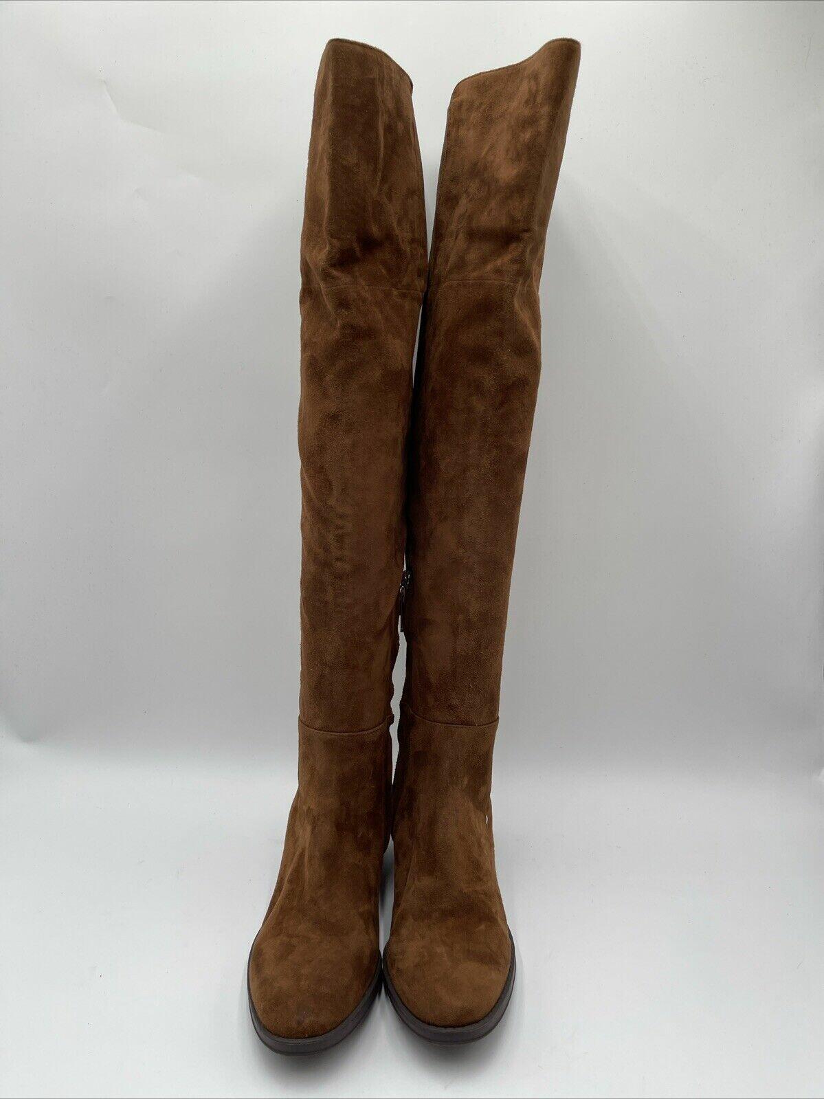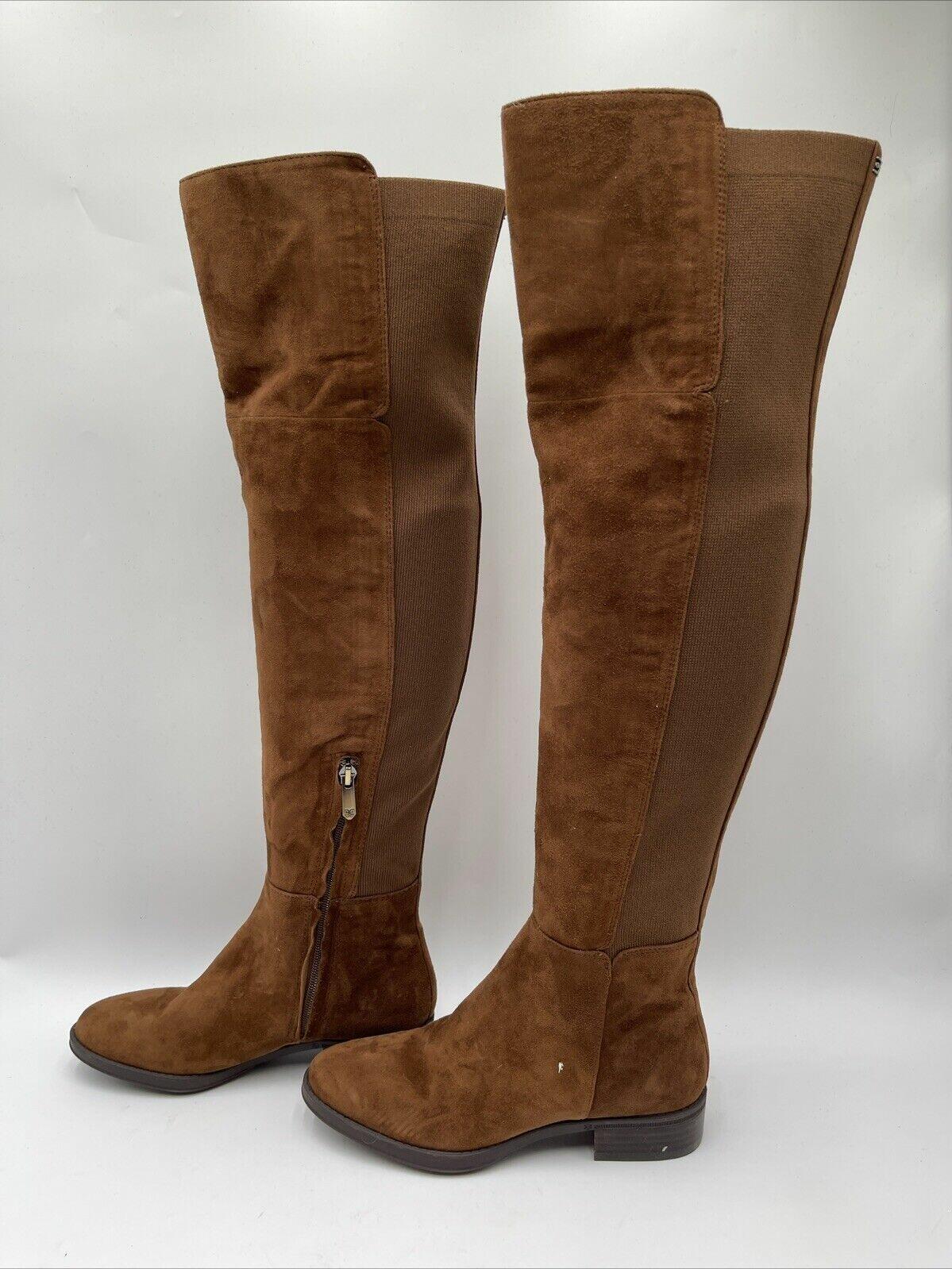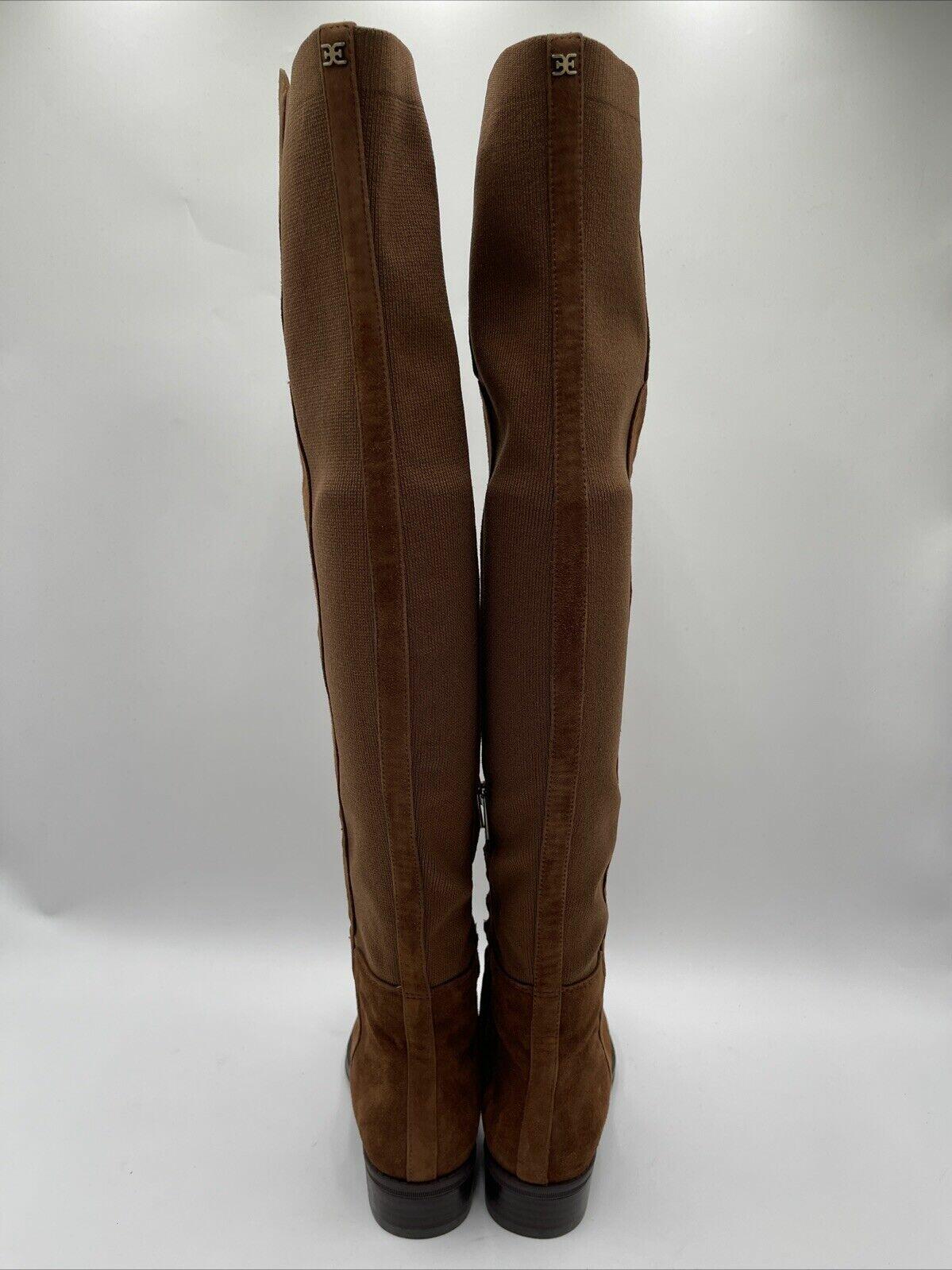 -Stains and sticker residue on bottomsStep up your fashion game with these Sam Edelman Pam boots. These over-the-knee riding boots come in a stylish brown color and feature a round toe shape. The boots are made with a suede upper material and a knit fabric type, accented with a zipper for added flair. The low block heel style is perfect for both casual and party/cocktail occasions.