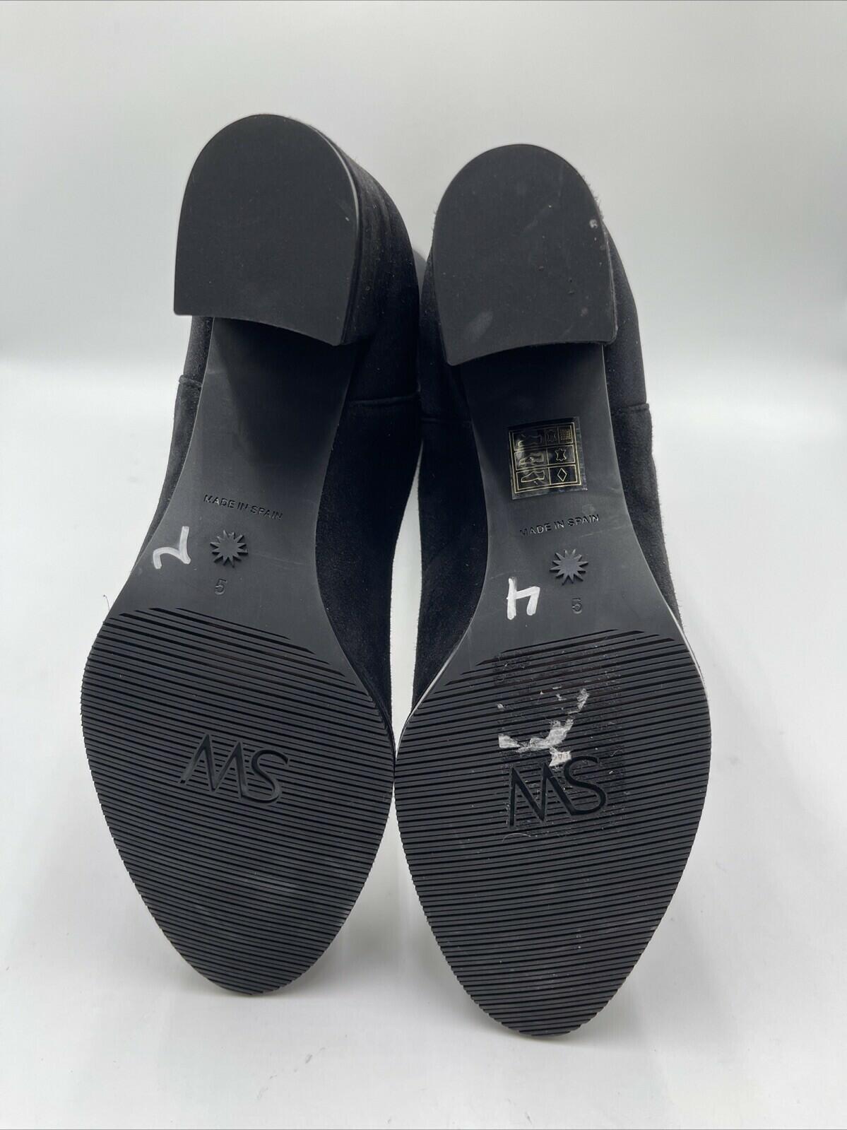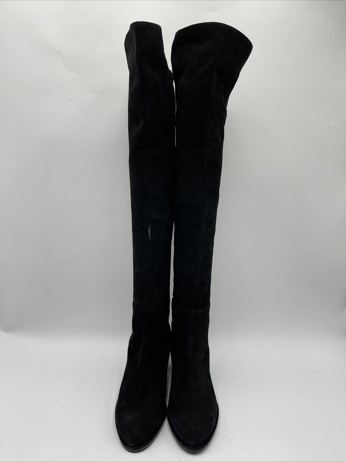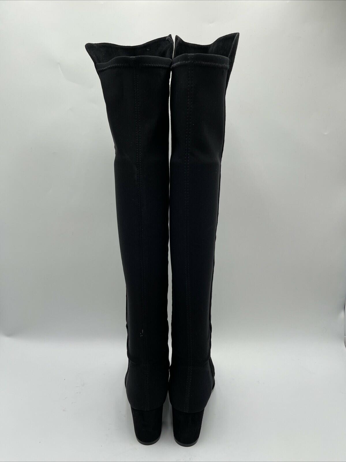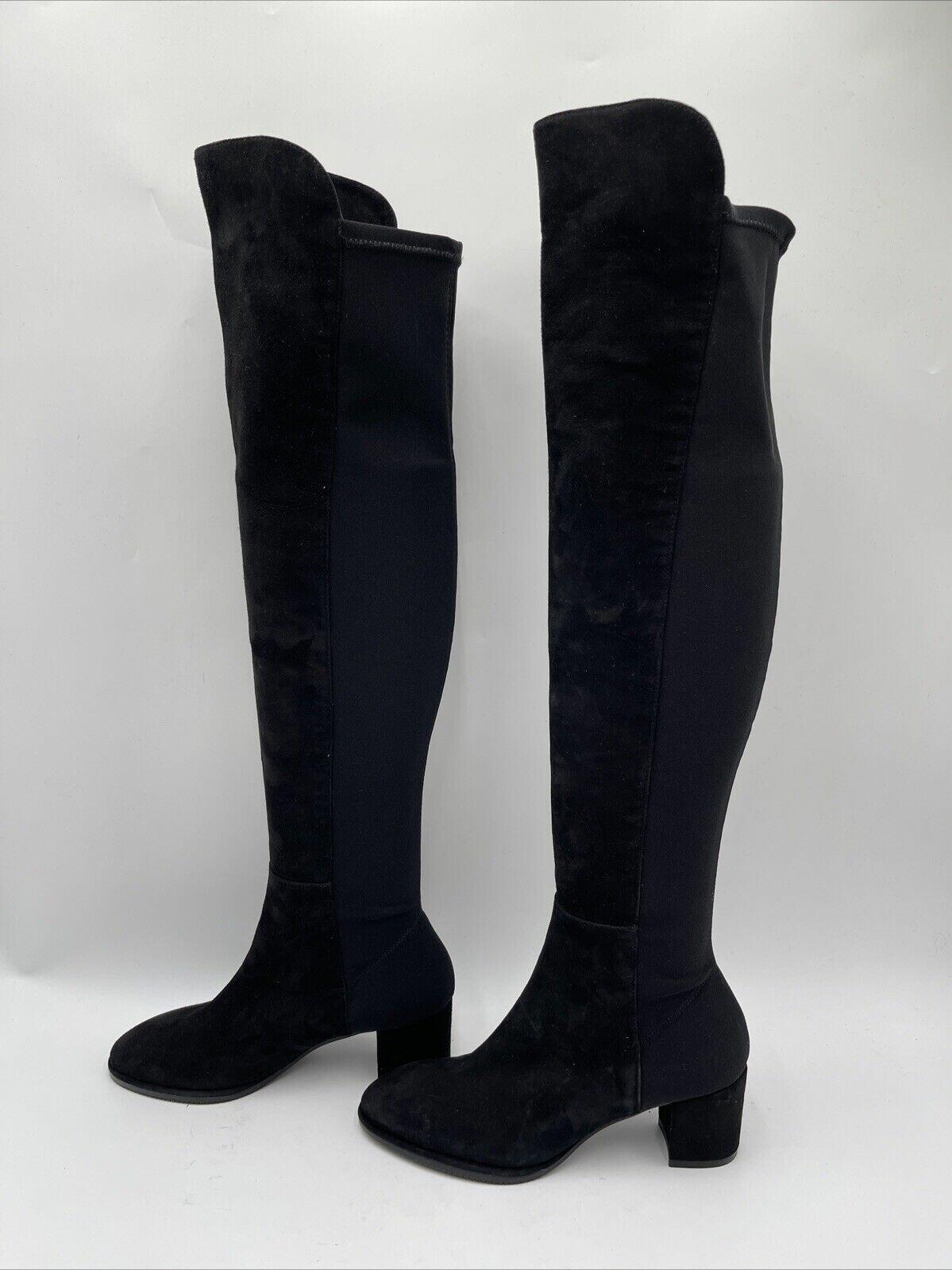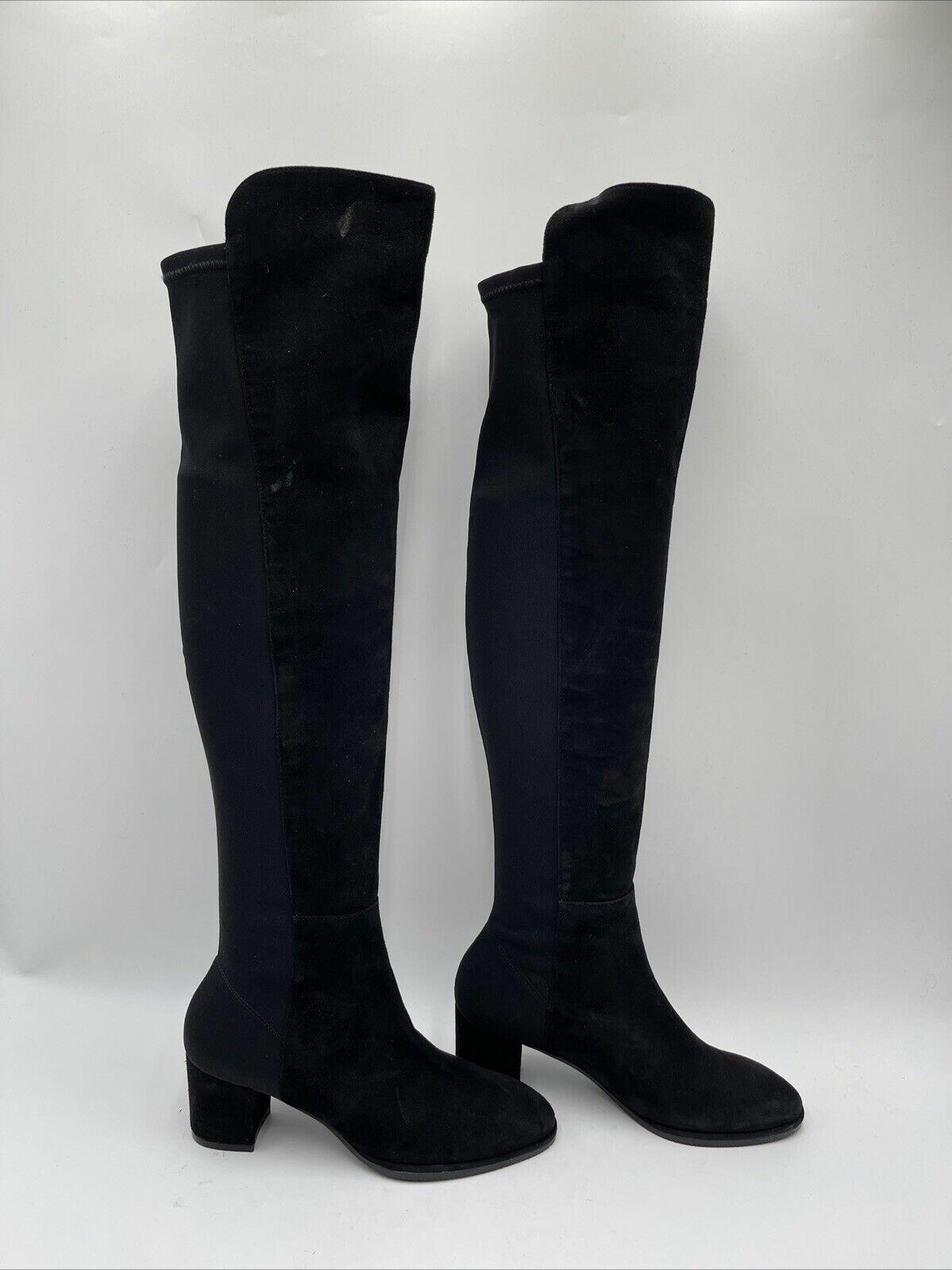 Stuart Weitzman Black Suede/Fabric Pull On Block Heel Knee High Boots Women 5 - Very Good