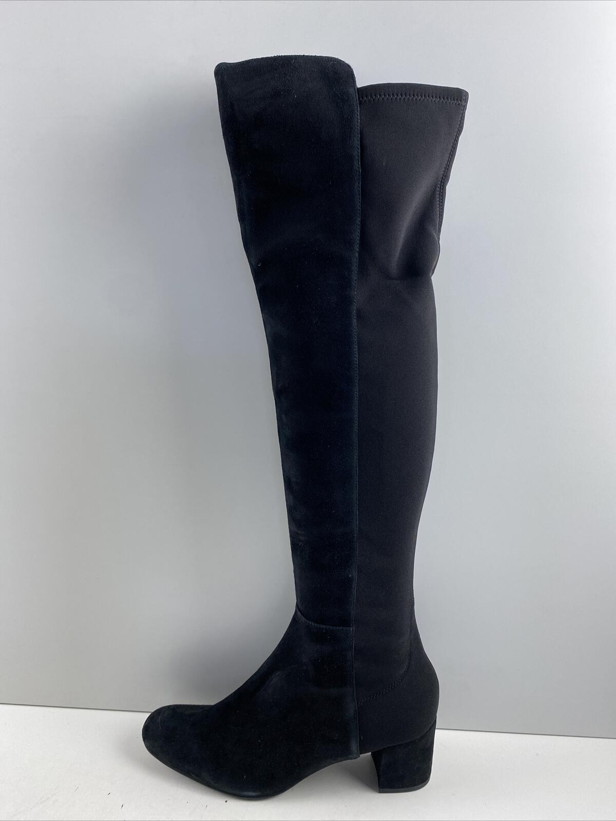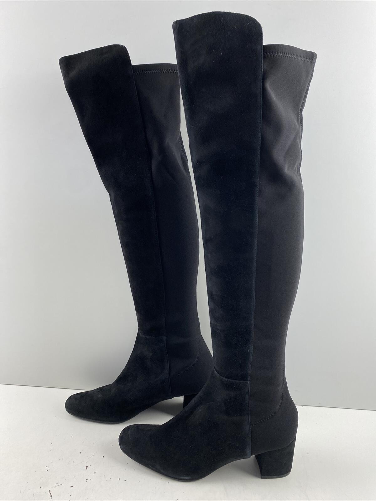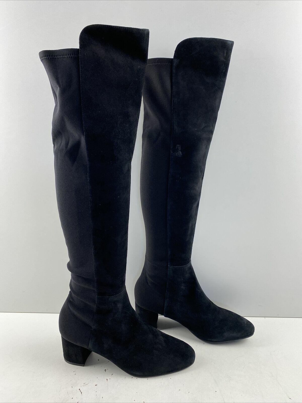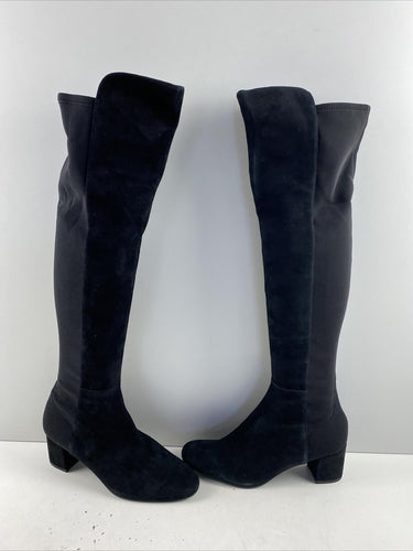 Stuart Weitzman Black Suede/Fabric Pull On Block Heel Knee High Boots Womens 8.5 - Very Good