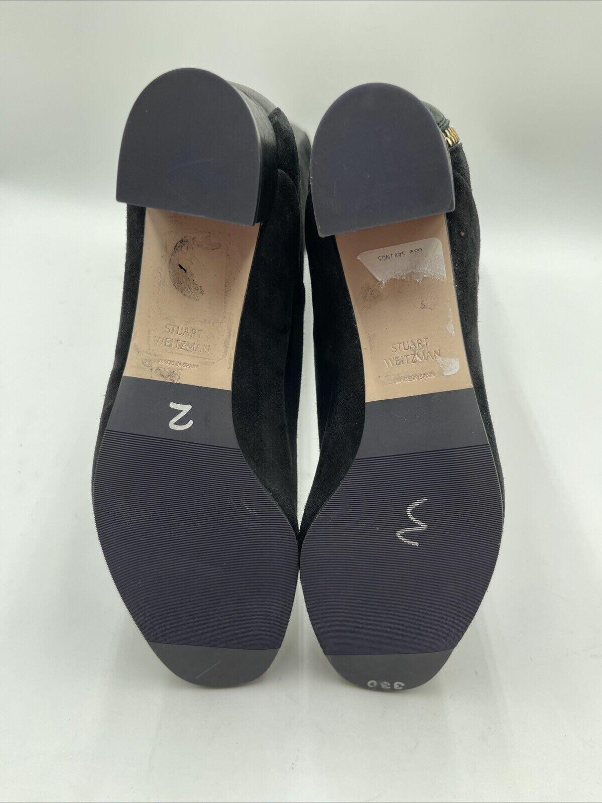 -Sticker residue and stained bottomsElevate your shoe game with these Stuart Weitzman Shrimpton knee boots in classic black. Perfect for any occasion, these boots feature a square toe and mid-height block heel, providing both style and comfort. The suede upper material is complemented by a leather lining, adding to the durability and quality of the boot.