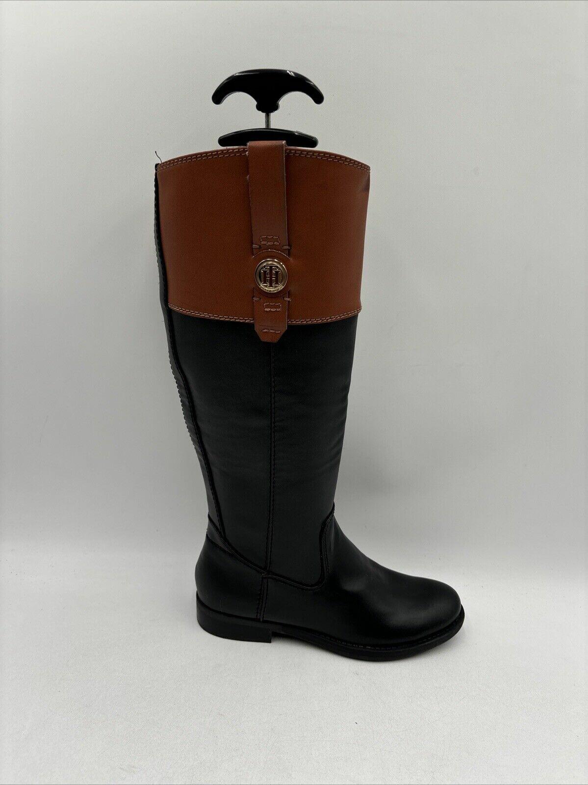 Elevate your equestrian style with these Tommy Hilfiger SHANO riding boots. The black faux leather upper, with an almond toe shape and side zip closure, is perfect for casual occasions. The knee-high shaft style and block heel design provide both comfort and style, while the rubber outsole ensures durability.These boots are perfect for women who want to add a touch of elegance to their wardrobe. The fabric lining and synthetic insole material make them even more comfortable to wear. These boots are available in size 6.5 and are suitable for any equestrian-themed event or casual outing.