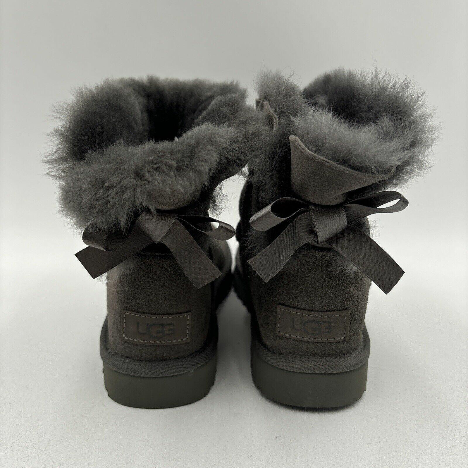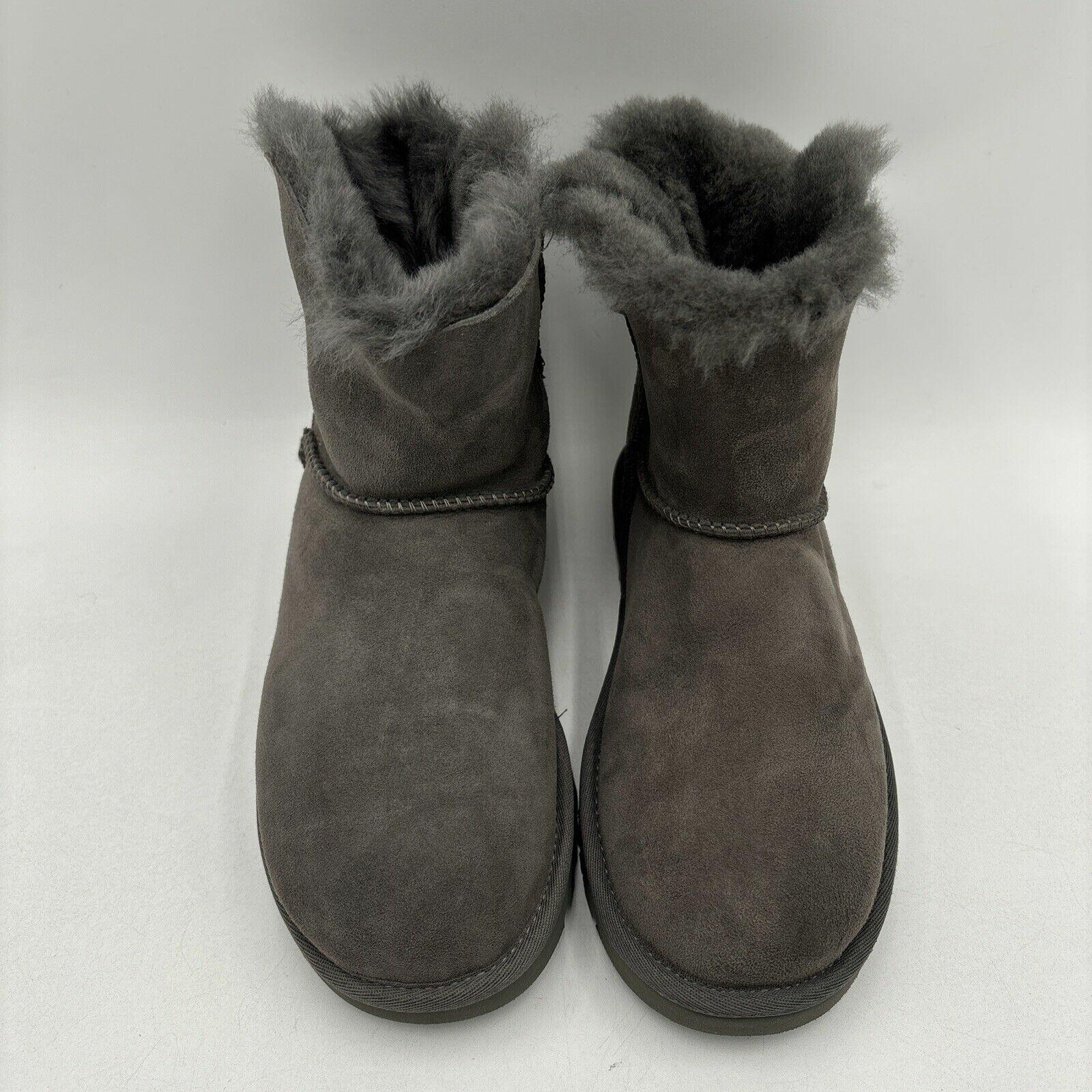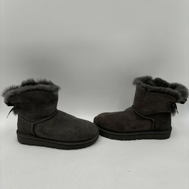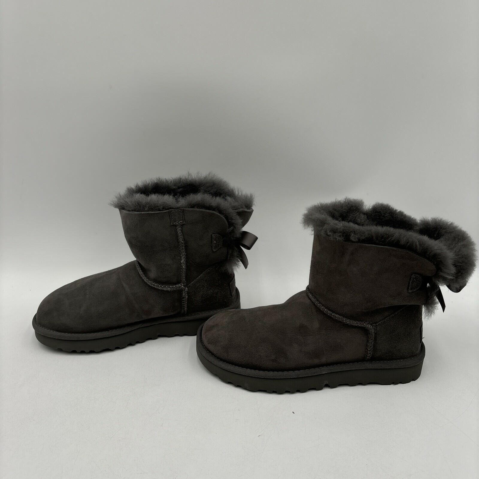 UGG Mini Bailey Bow Grey Suede Sheepskin Lined Ankle Boots, Women’s Size 5 - Very Good