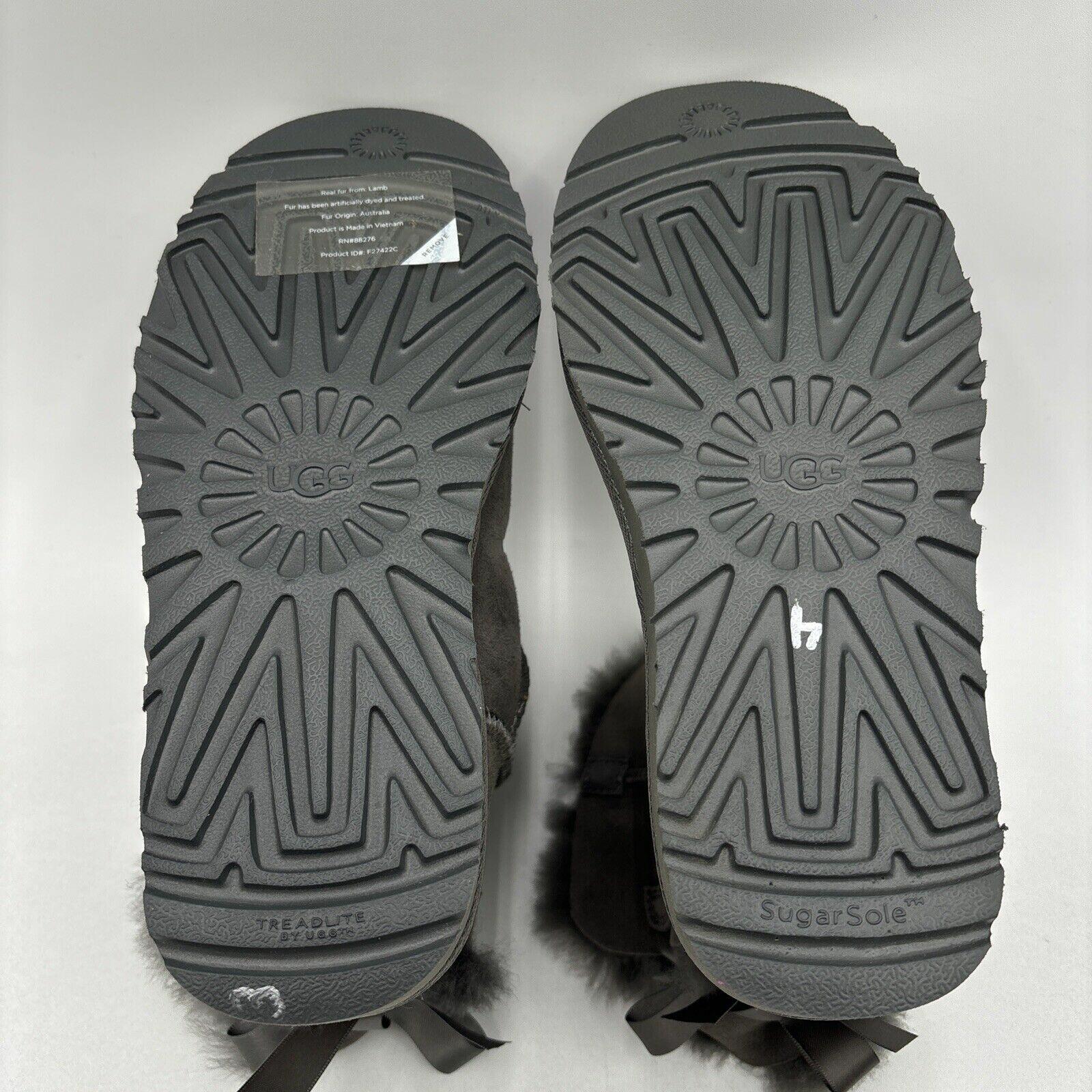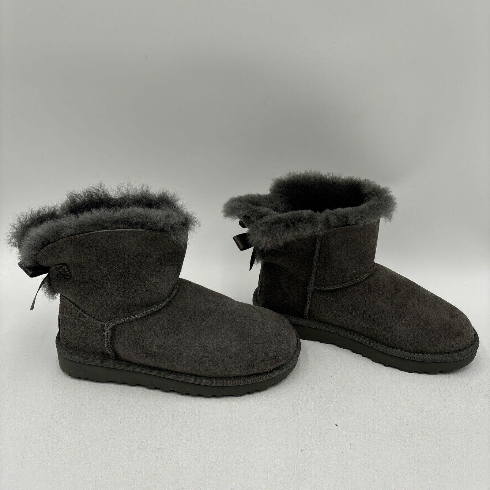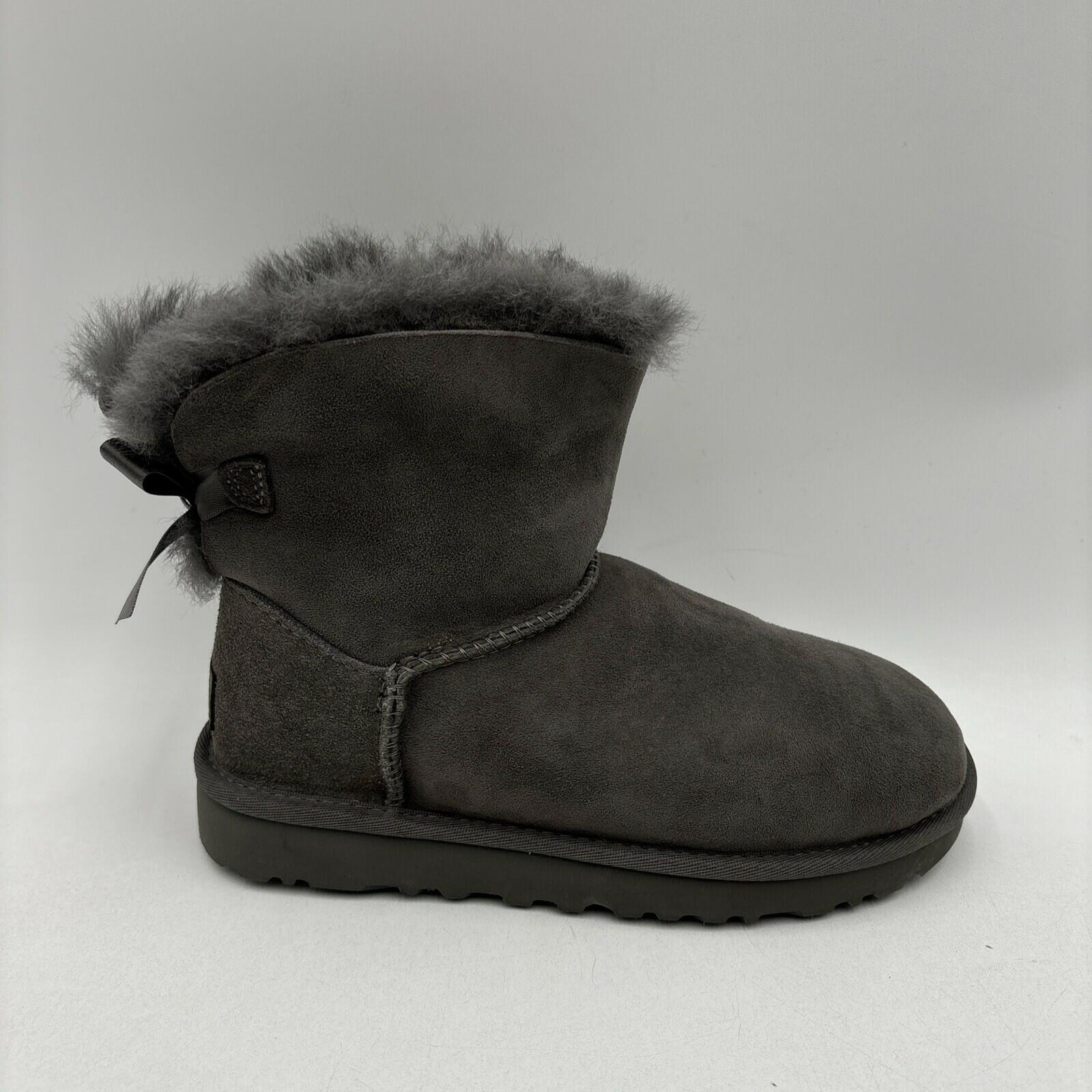 UGG Mini Bailey Bow Grey Suede Sheepskin Lined Ankle Boots, Women’s Size 5 - Very Good