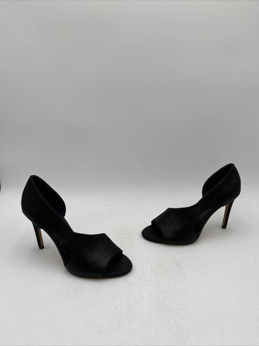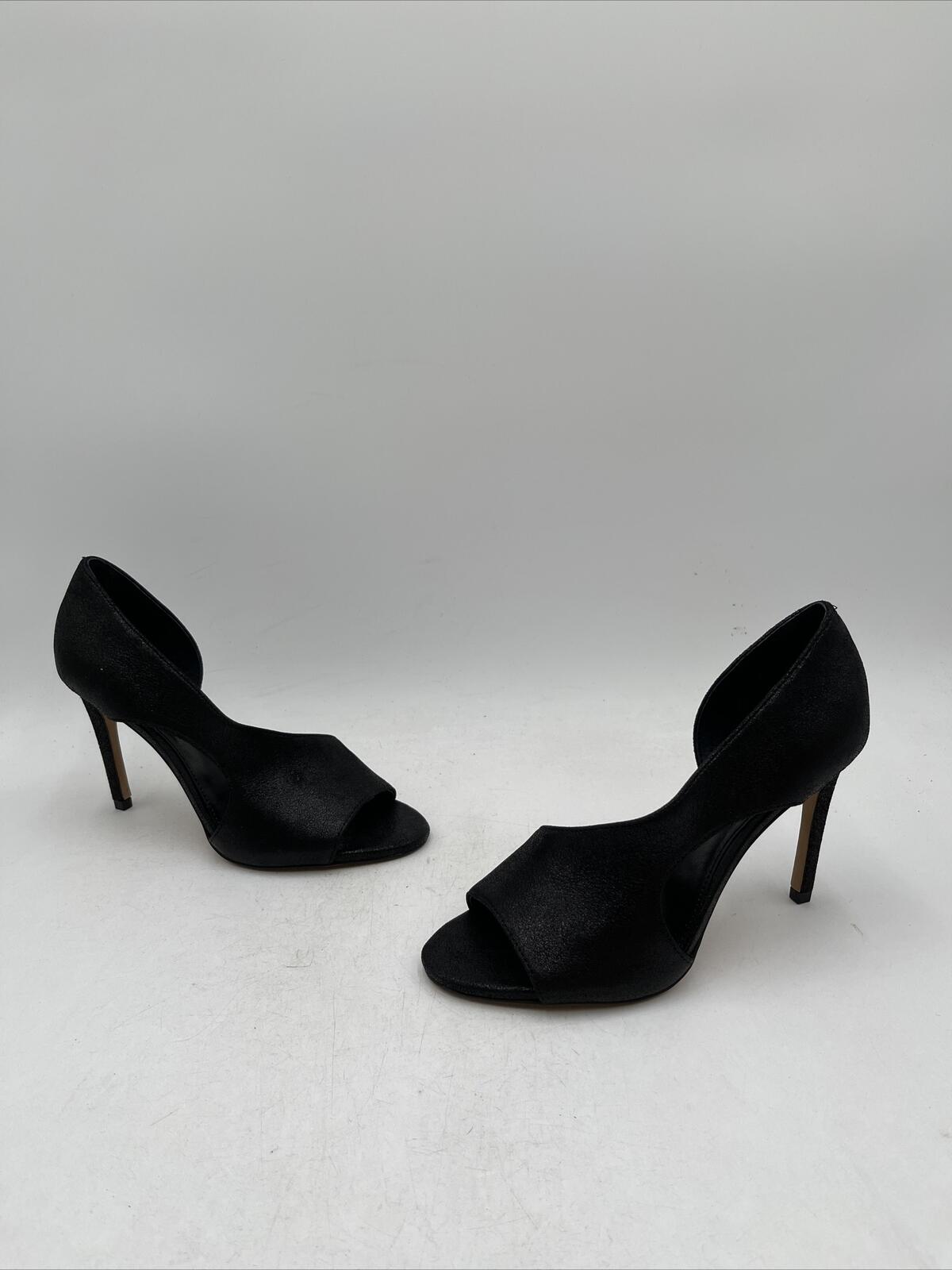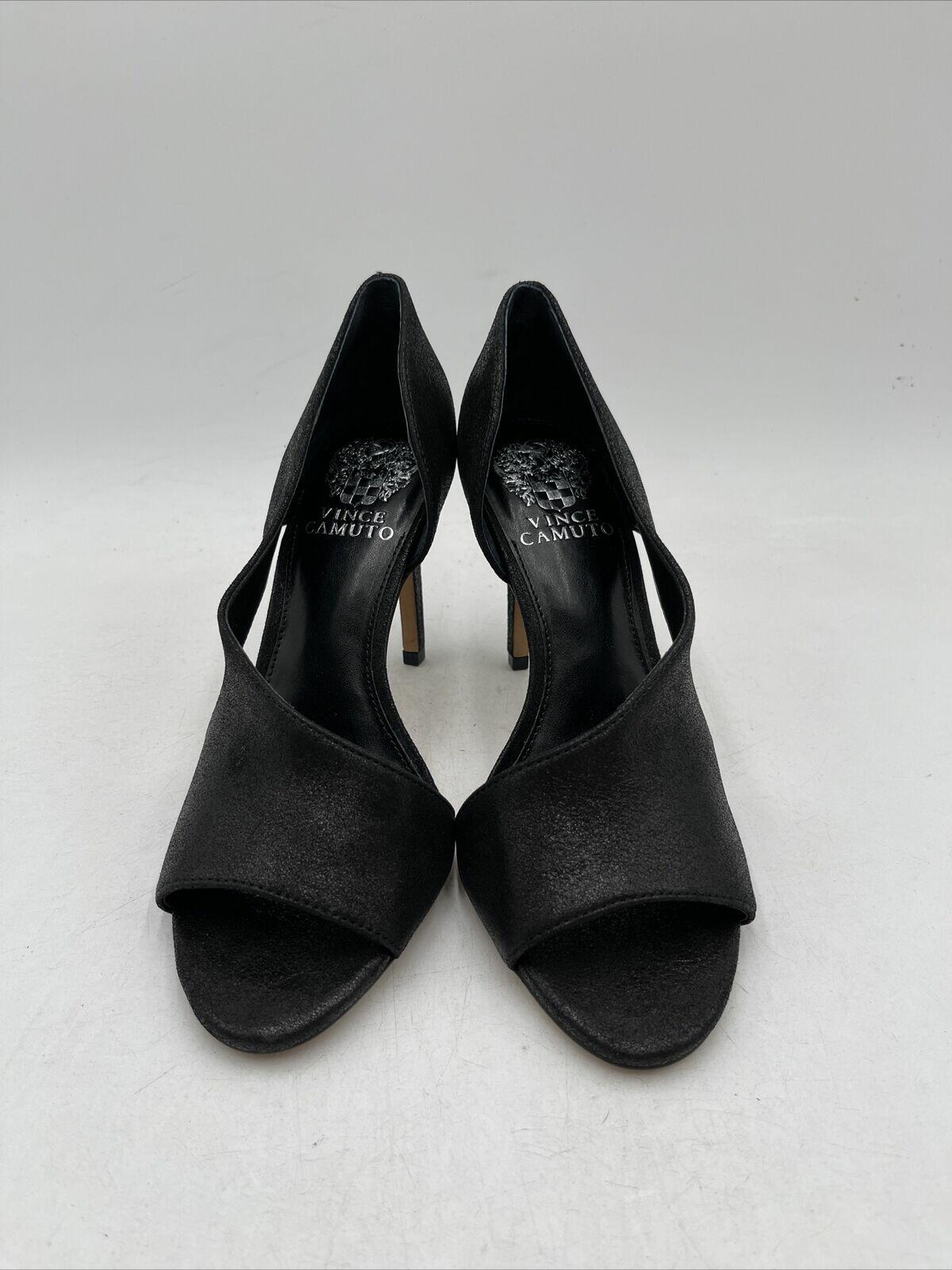 Elevate your style with these stunning black heels from Vince Camuto. These pumps feature an open toe design with a sleek stiletto heel for a chic and timeless look. The synthetic upper material is durable and easy to maintain, ensuring you can wear these heels for years to come. The solid pattern and black color create a versatile style that can be dressed up or down for any occasion. These women's shoes are perfect for any fashion-forward individual looking to add a touch of sophistication to their wardrobe.