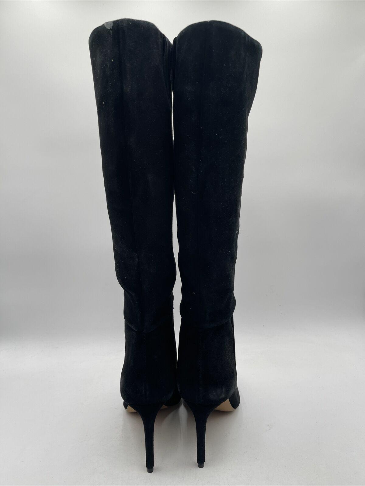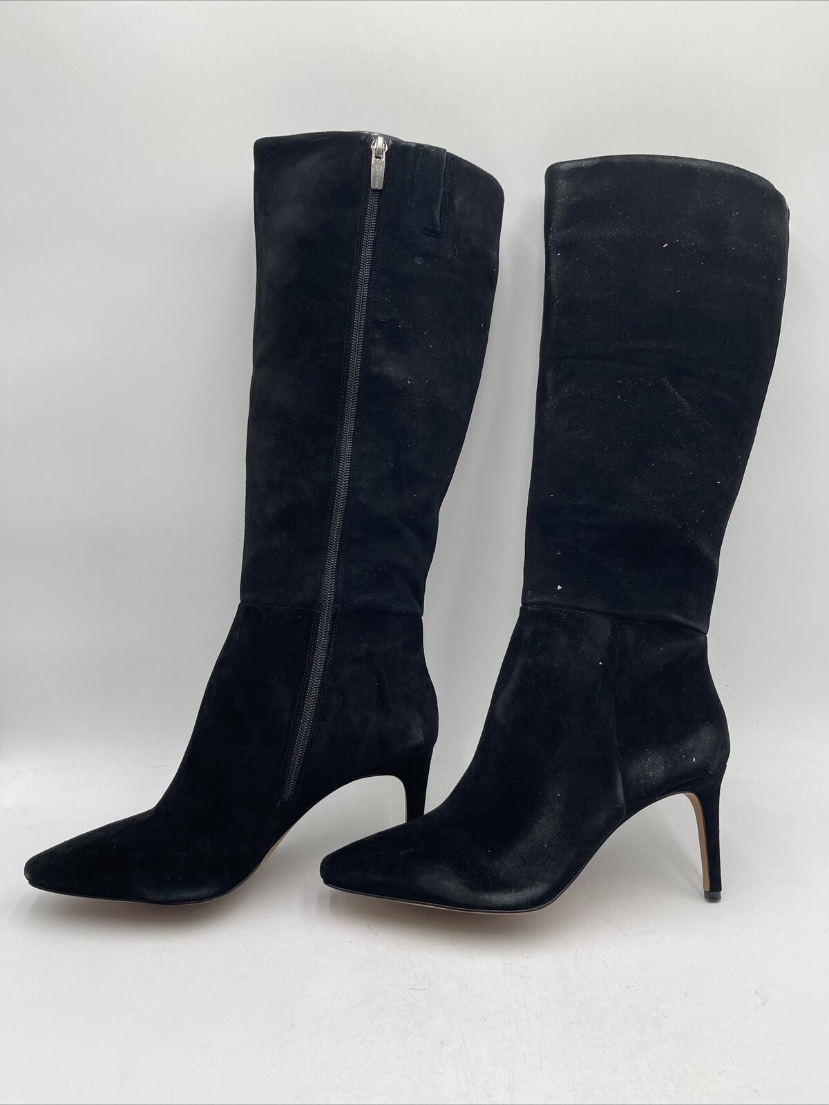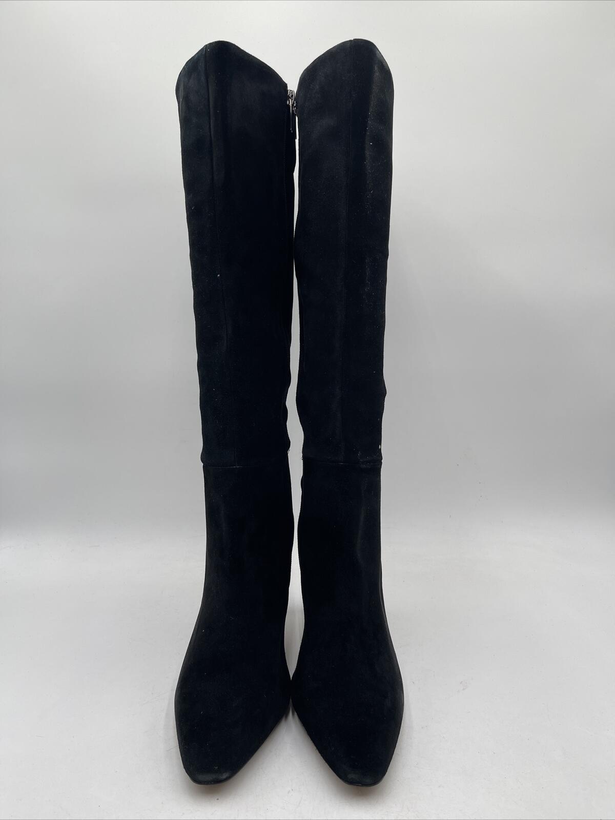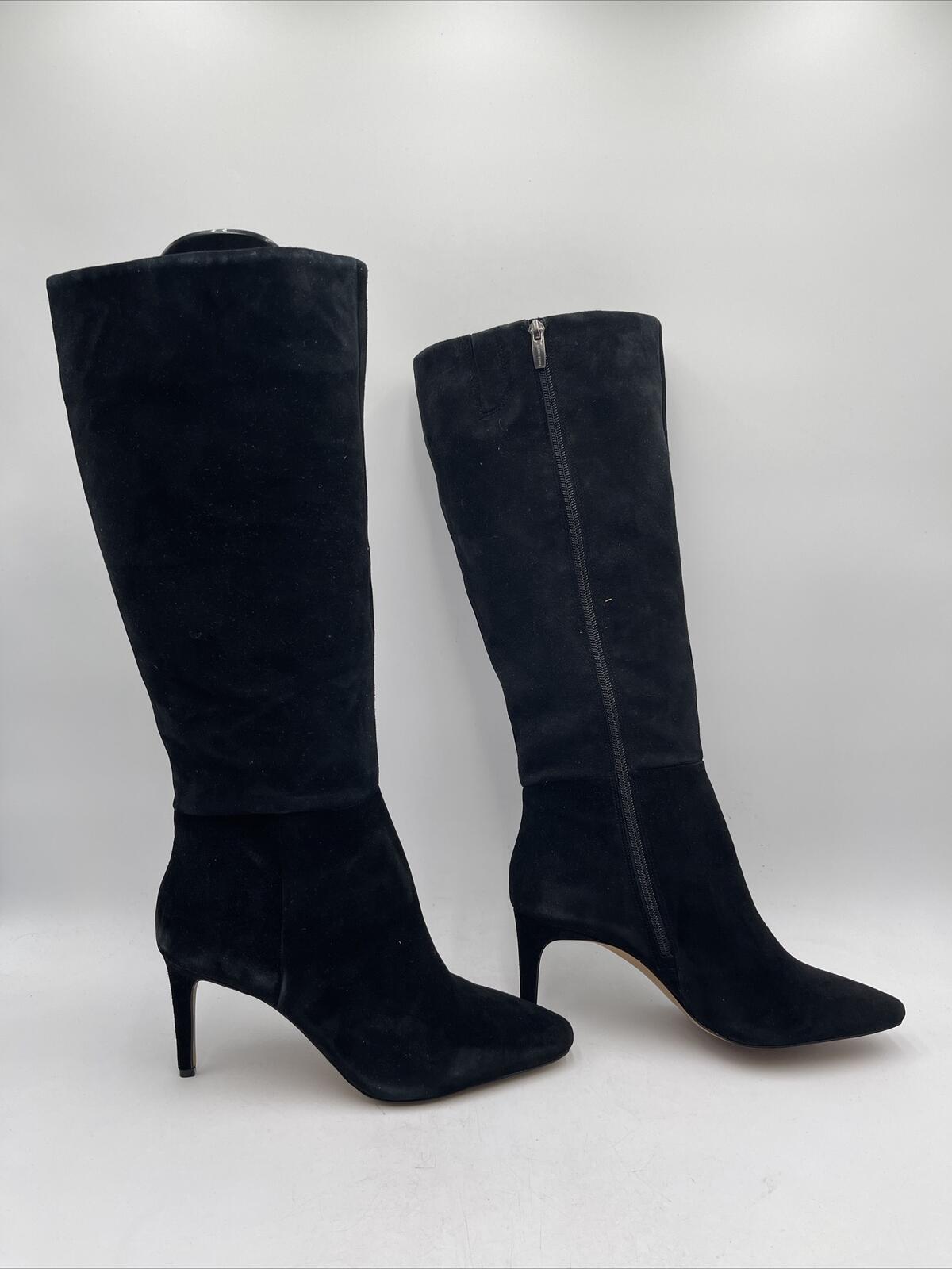 -Bottoms are barely wornElevate your style with these stunning knee-high boots from Vince Camuto. Crafted from high-quality suede in a sleek black color, these boots feature a stiletto heel with a height of 3-3.9 inches, perfect for any party or cocktail occasion. The Arendie model boasts a timeless design that is both fashionable and comfortable for any woman.