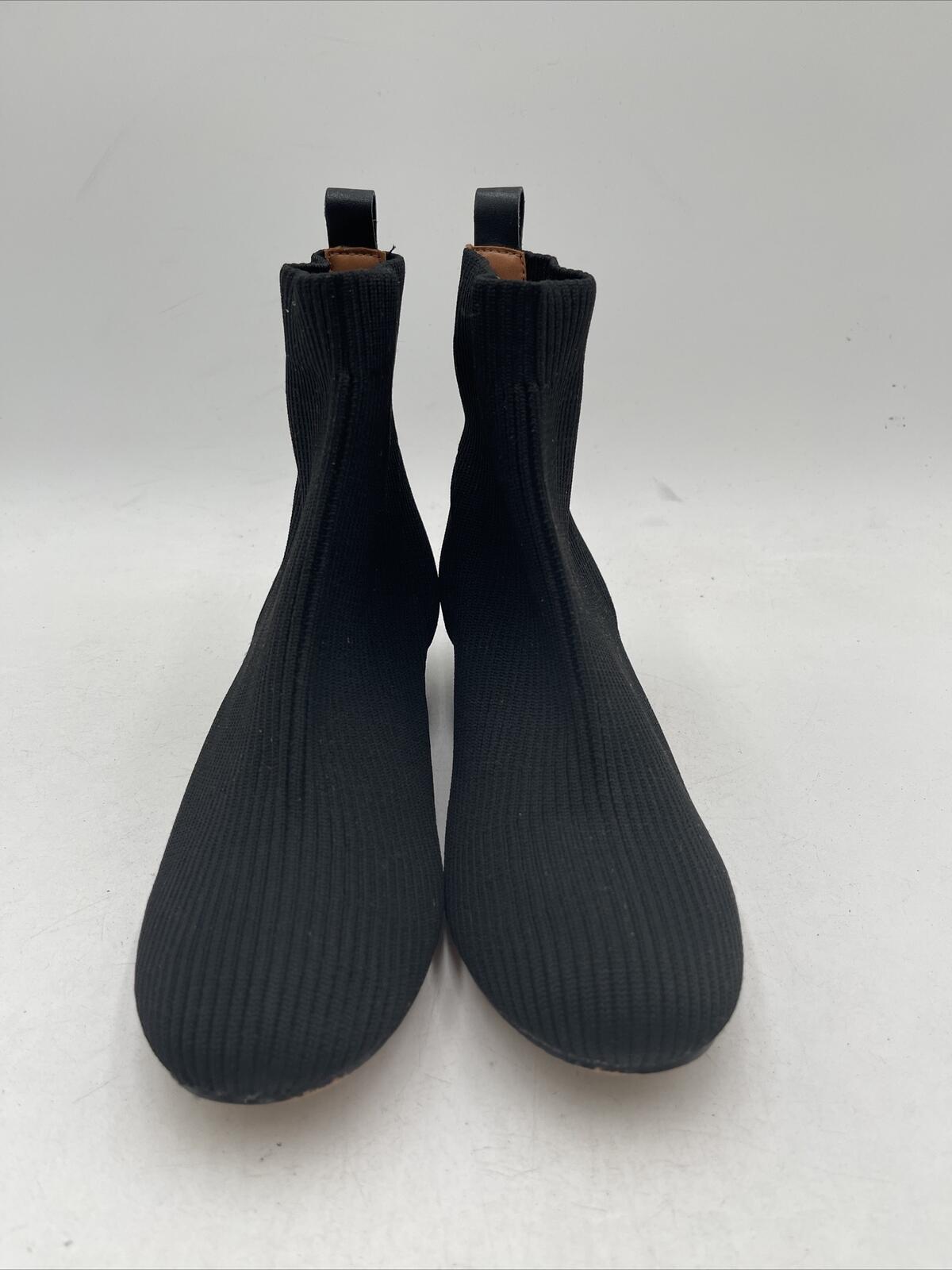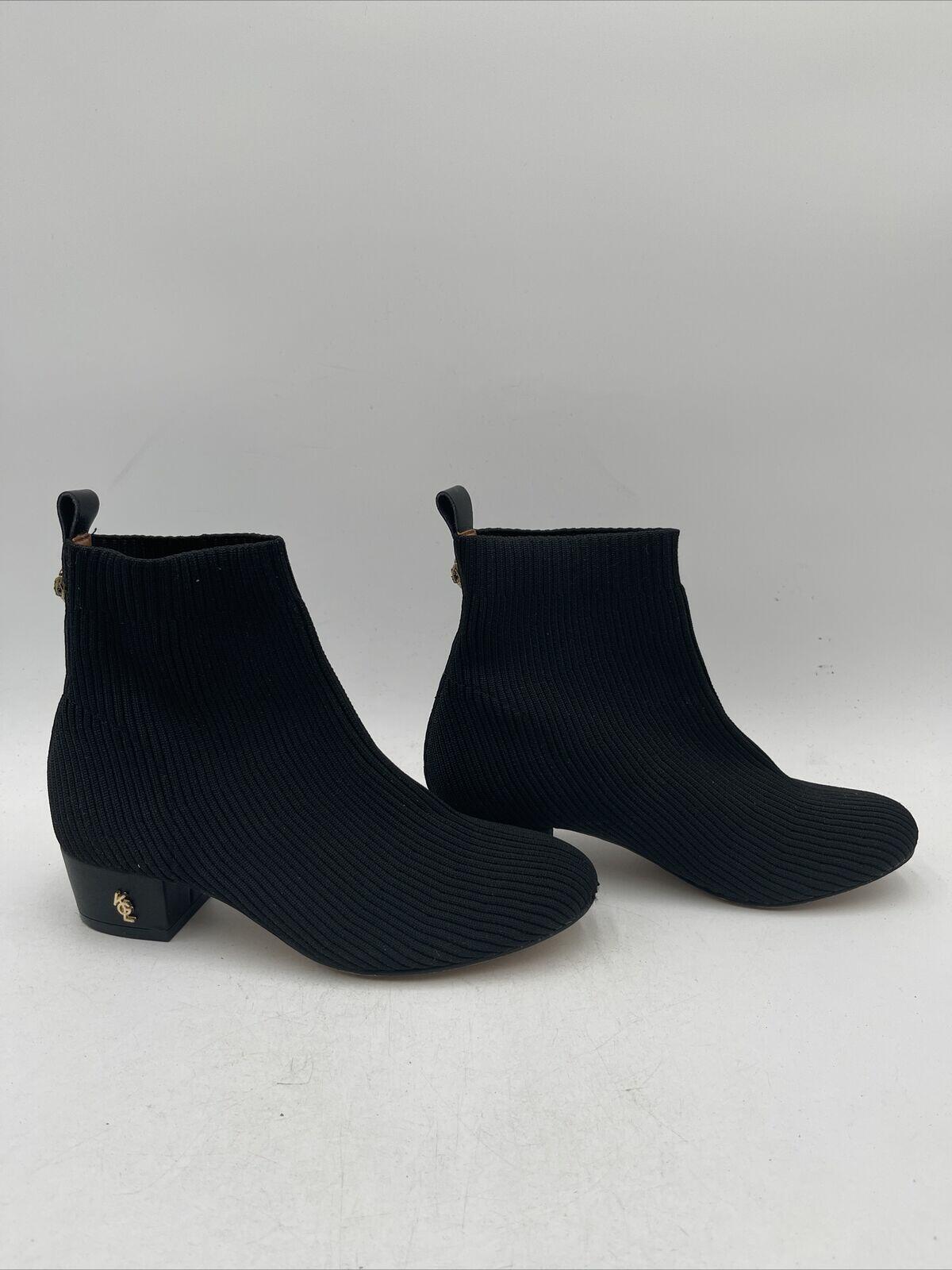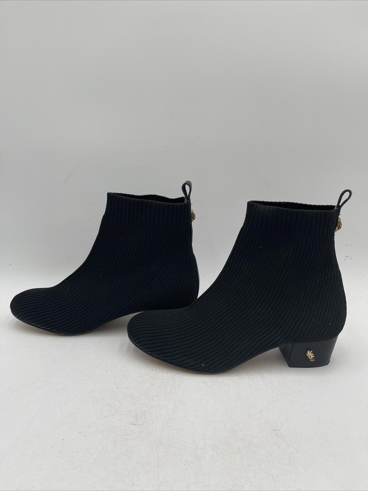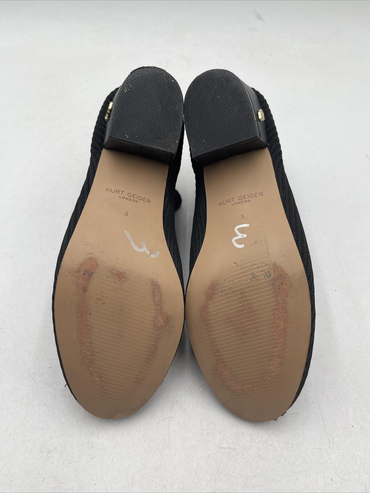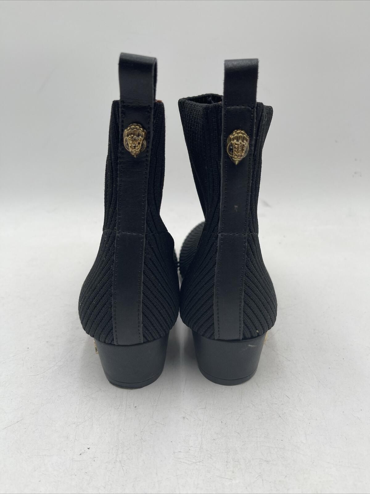 -Bottoms are lightly wornElevate your shoe collection with these black Kurt Geiger London Junior Mini Elmer boots. These ankle boots feature a round toe, block heel, and a low (1-1.9 in) heel height. The boots are designed for women and are perfect for any occasion. The upper material is made of fabric and it has a black color.