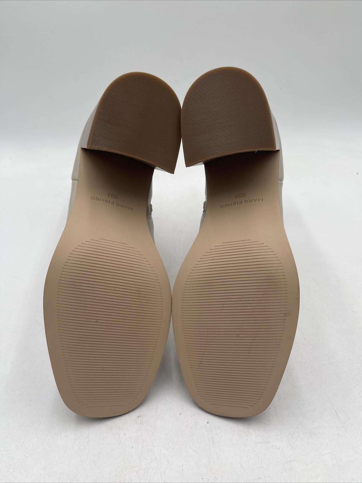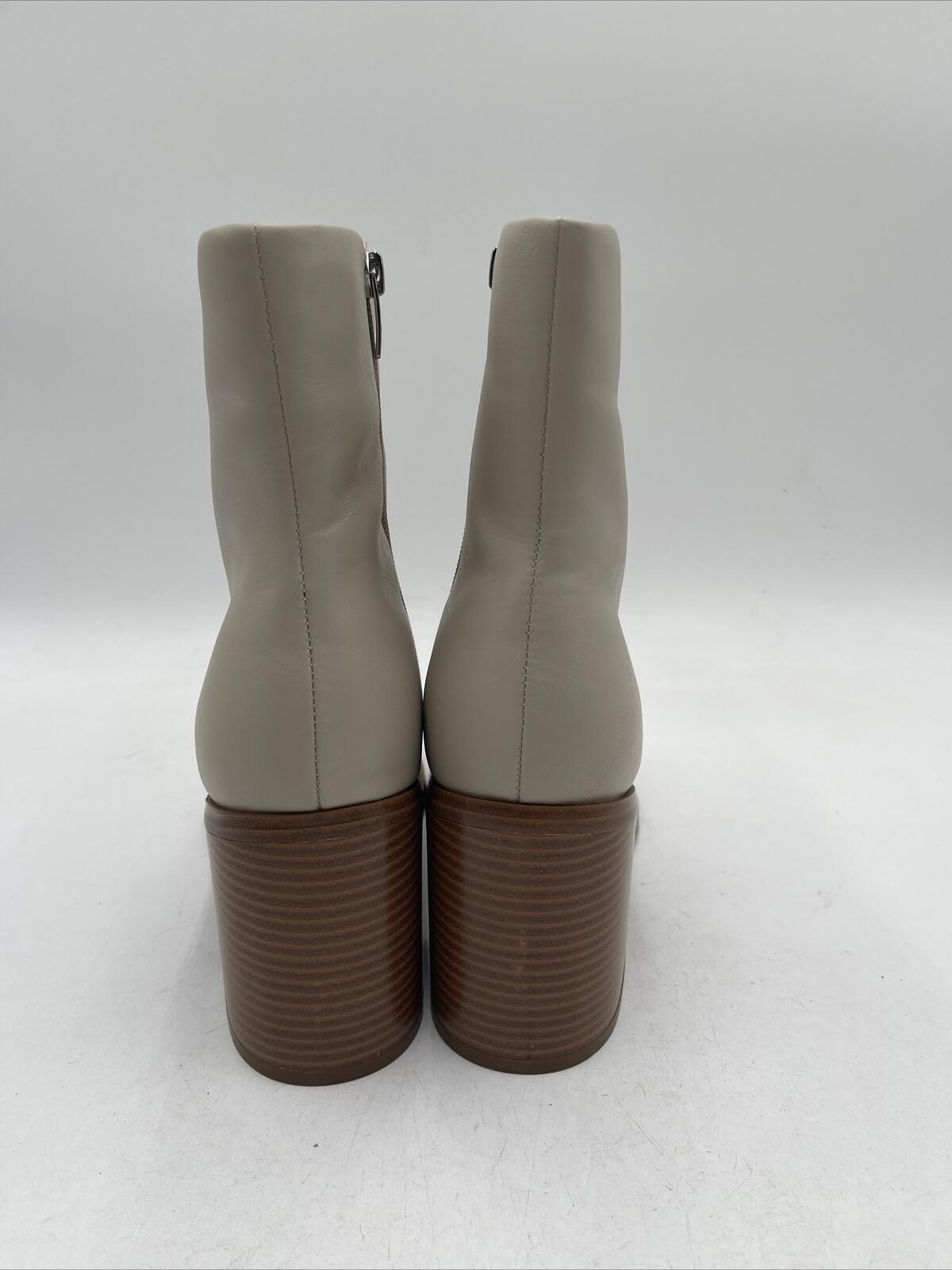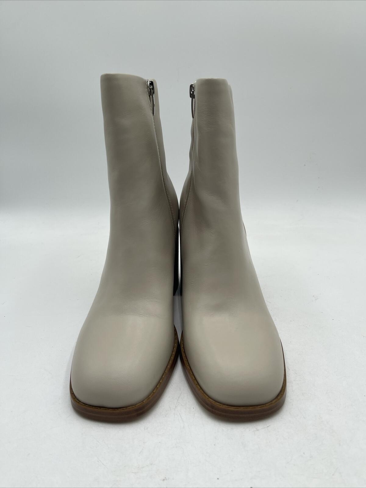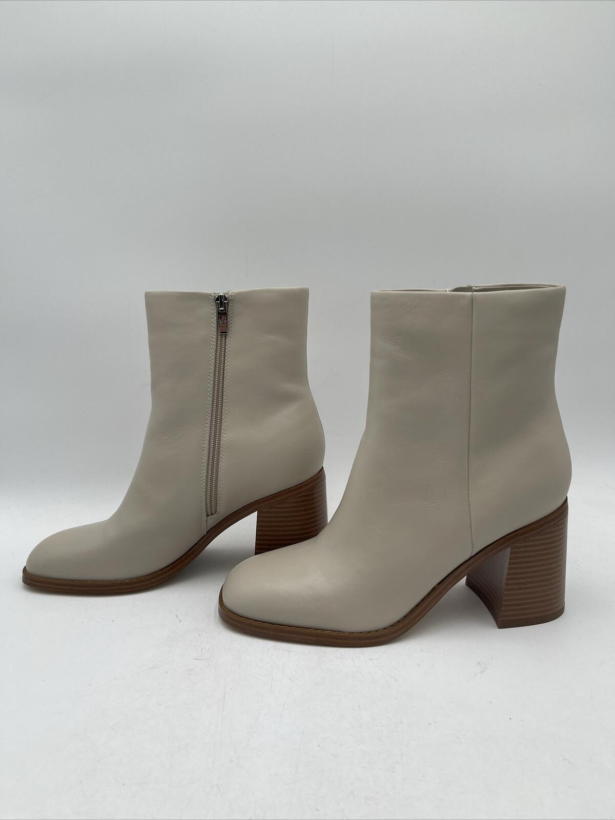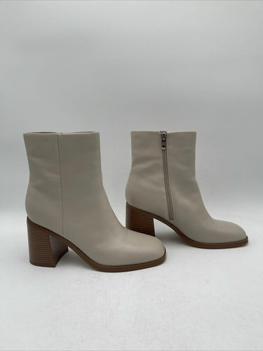 -Bottoms are lightly wornThe Vince Camuto Eshera Bootie is a women's high-heeled boot made of beige leather. It has a block heel style and a light natural color. The bootie is designed with a nature theme and is not vintage. It is a size 10M and is not customized. The model is Vince Camuto Eshera.