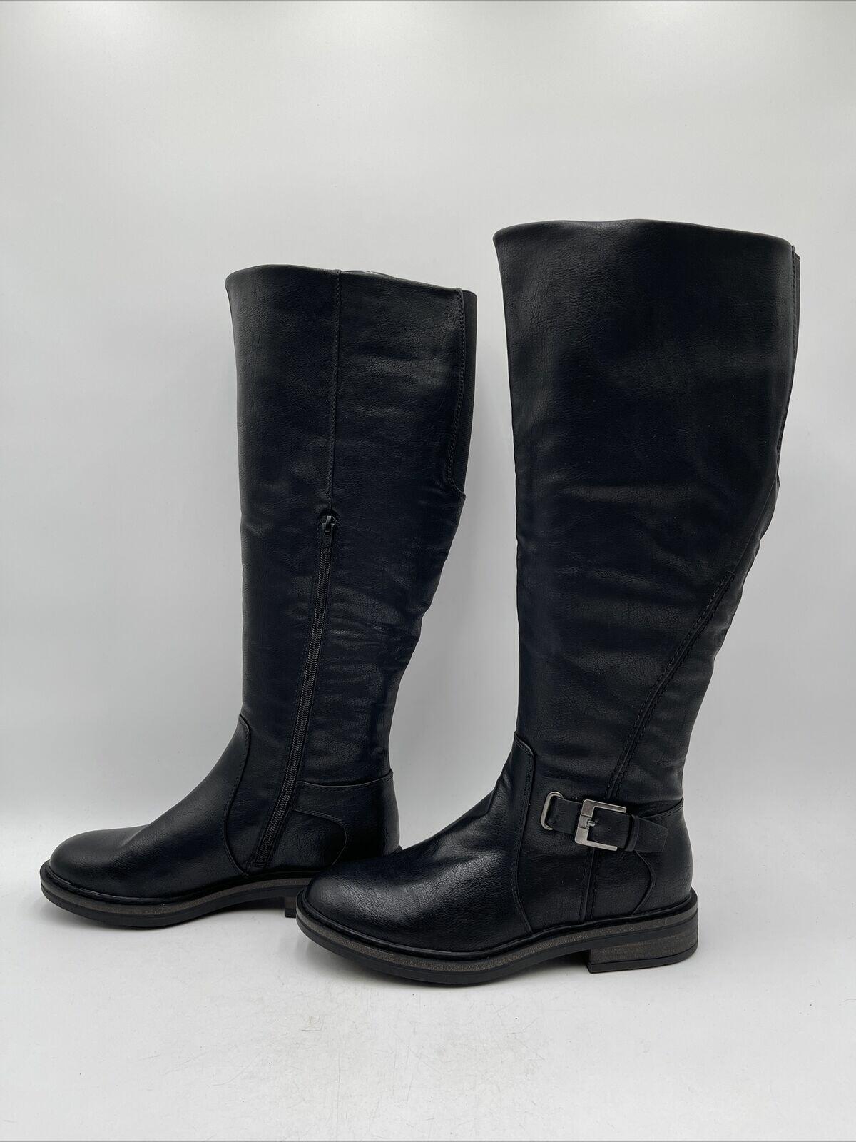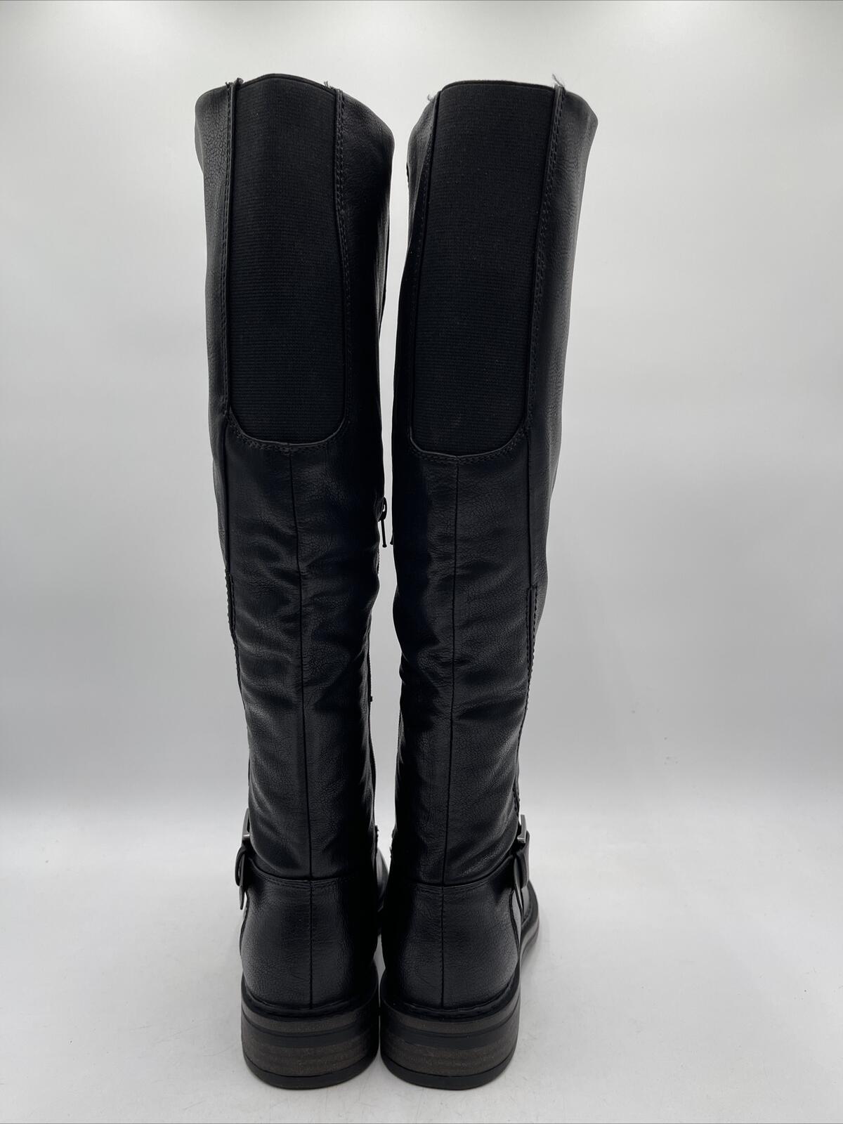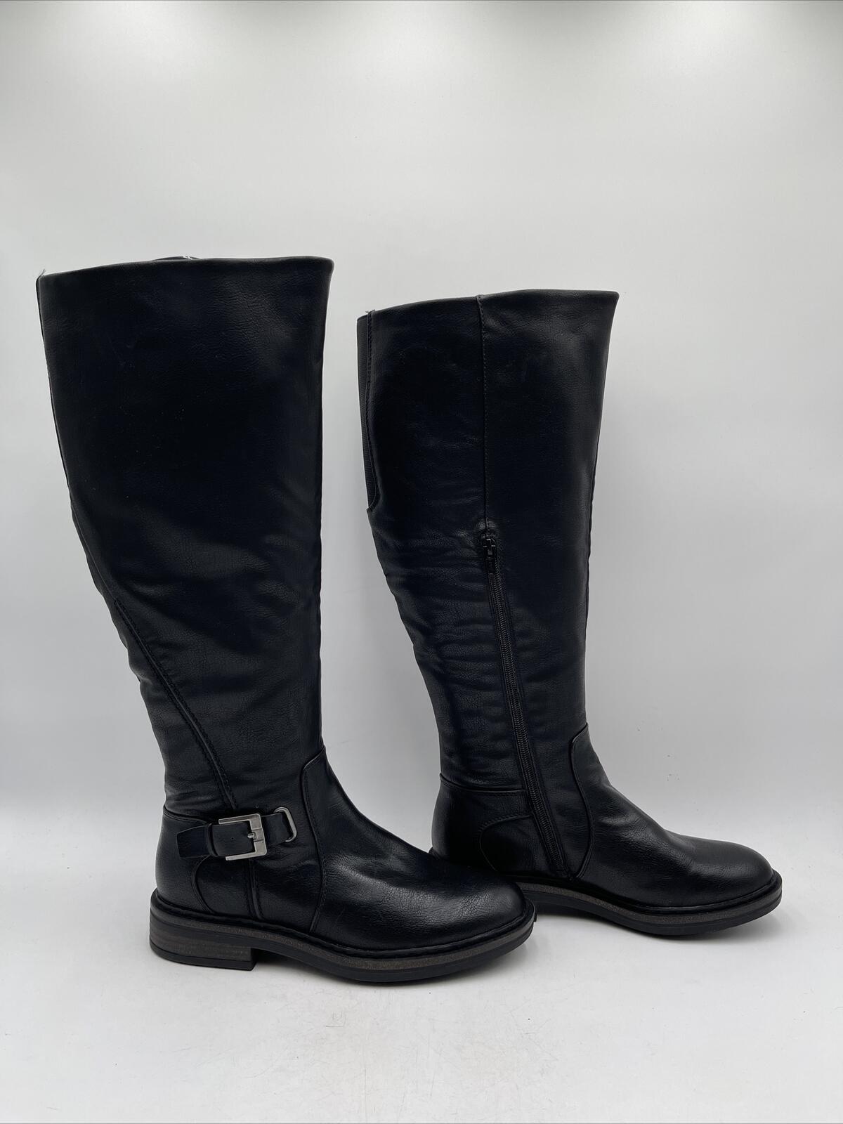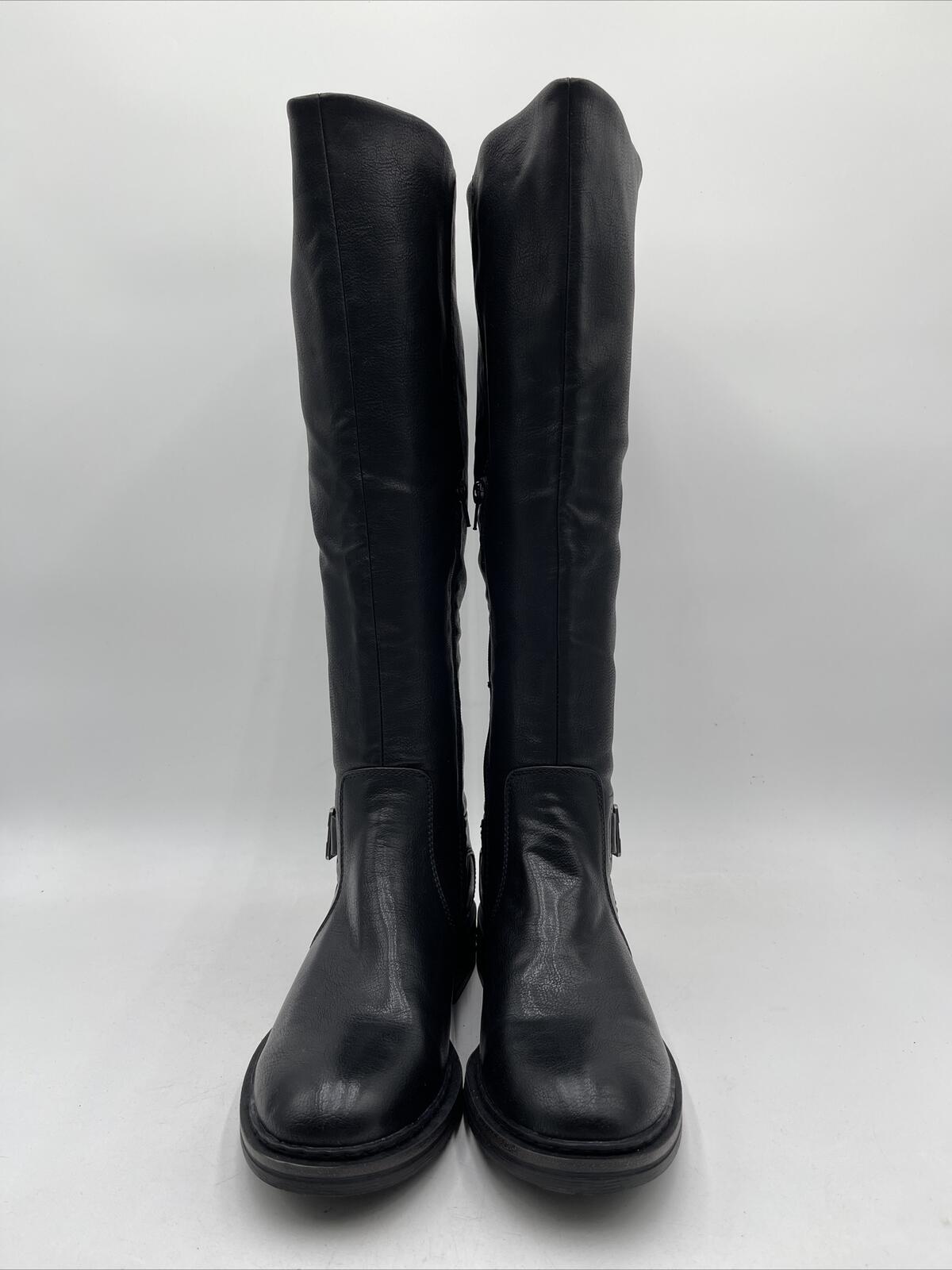 -Bottoms are lightly wornStep out in style this autumn with these beautiful Baretraps riding boots. Crafted with a synthetic upper material, these knee-high boots feature a low heel height of 1-1.9 inches, making them perfect for both casual and business occasions. The boots come in a stunning black color with a zipper accent, adding a touch of elegance to your outfit.