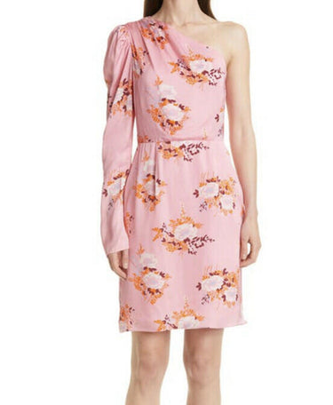 NWT Les Reveries ONE-SLEEVE FLORAL-PRINT MATTE-SATIN MINI DRESS IN PINK Size 2
