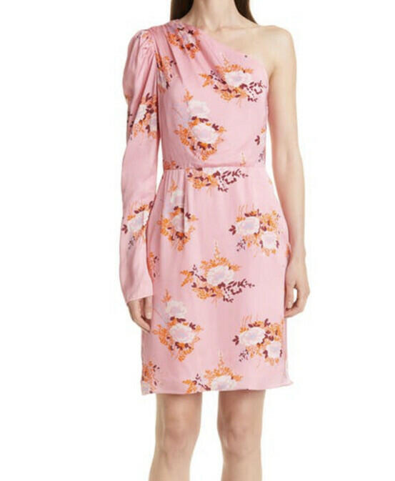 NWT Les Reveries ONE-SLEEVE FLORAL-PRINT MATTE-SATIN MINI DRESS IN PINK Size 8 - Ufashion