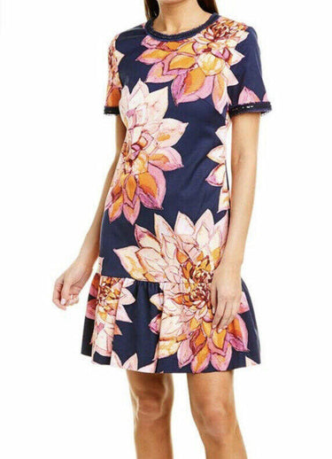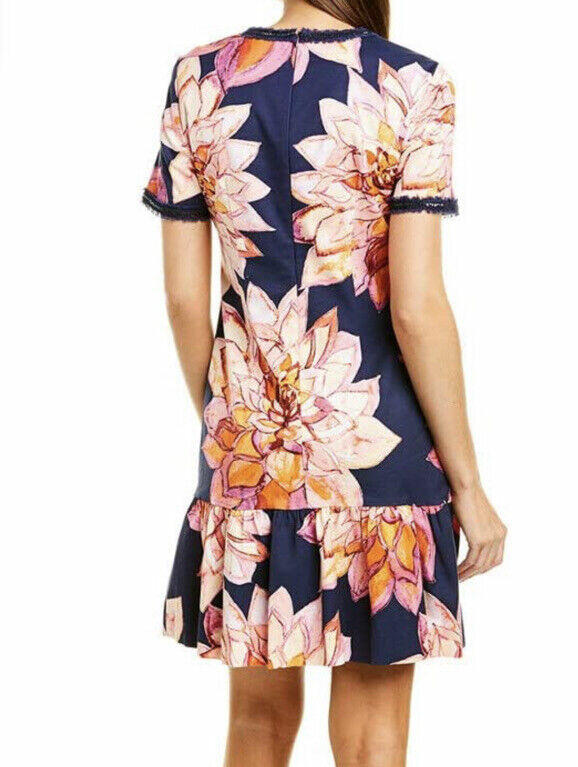 NWT Trina Turk Coast Floral-Print Short-Sleeve Ruffle-Hem Dress Navy Size 0