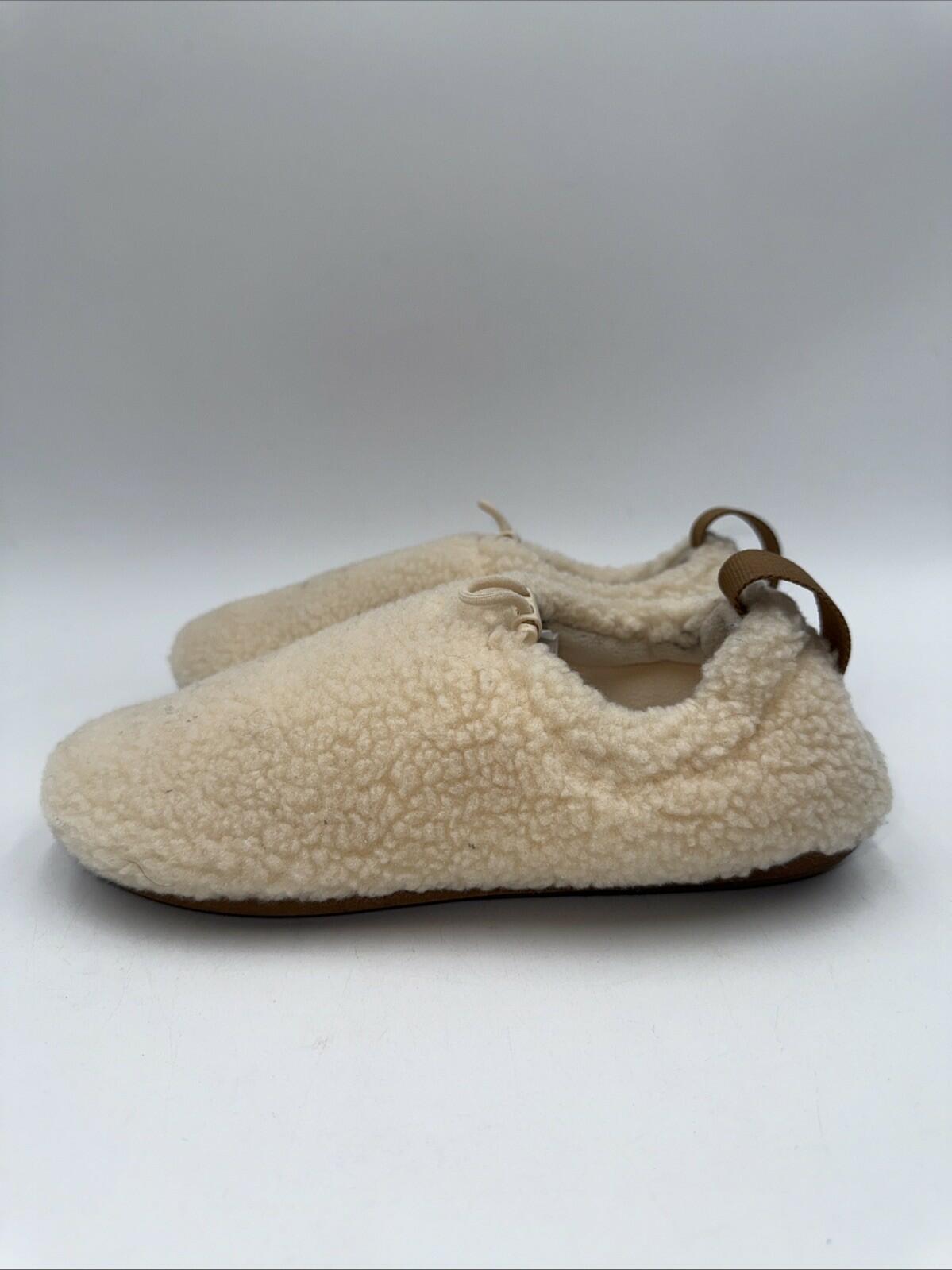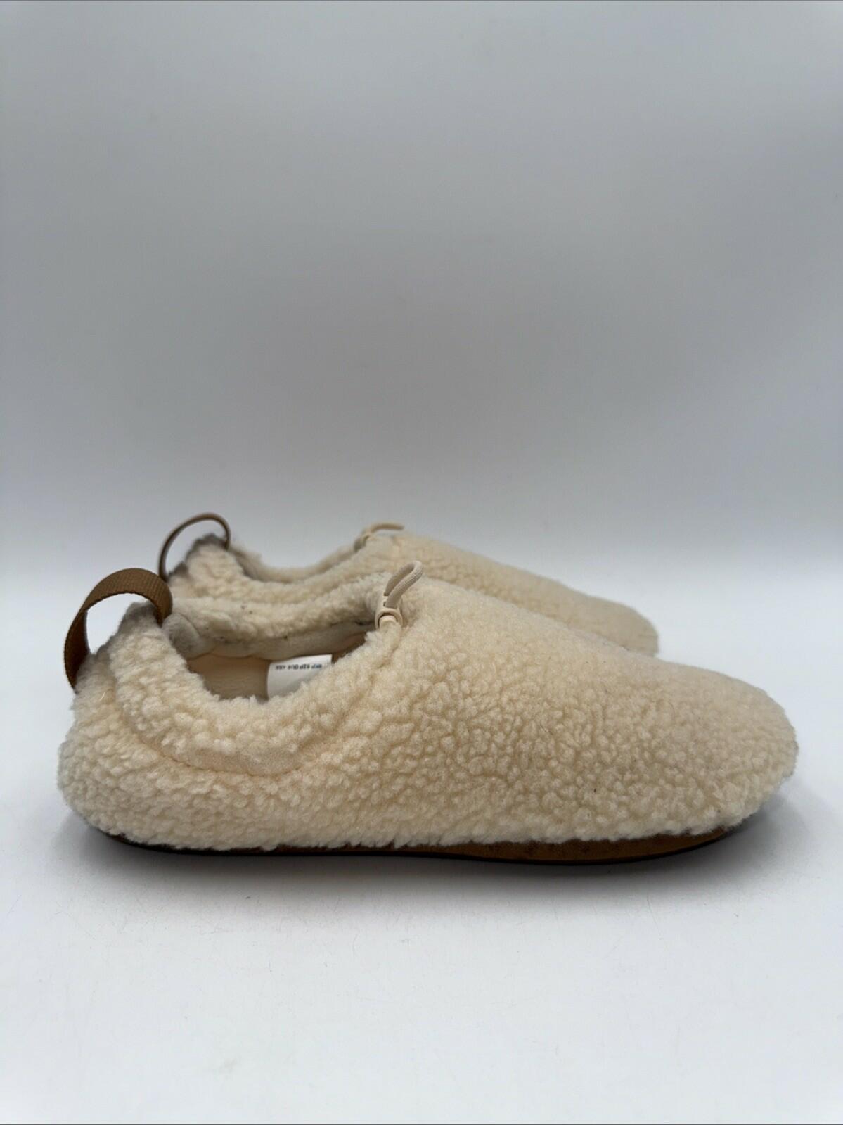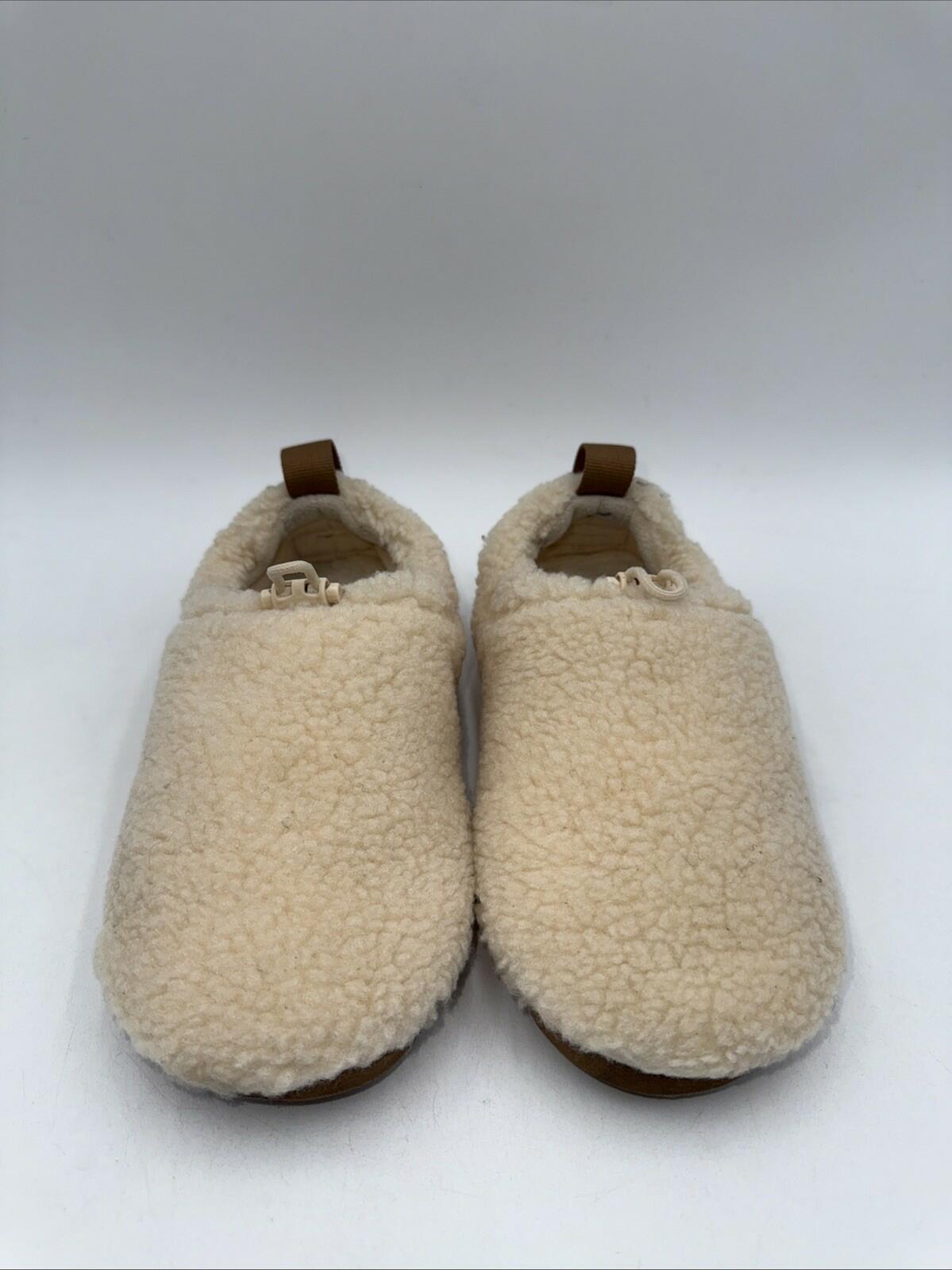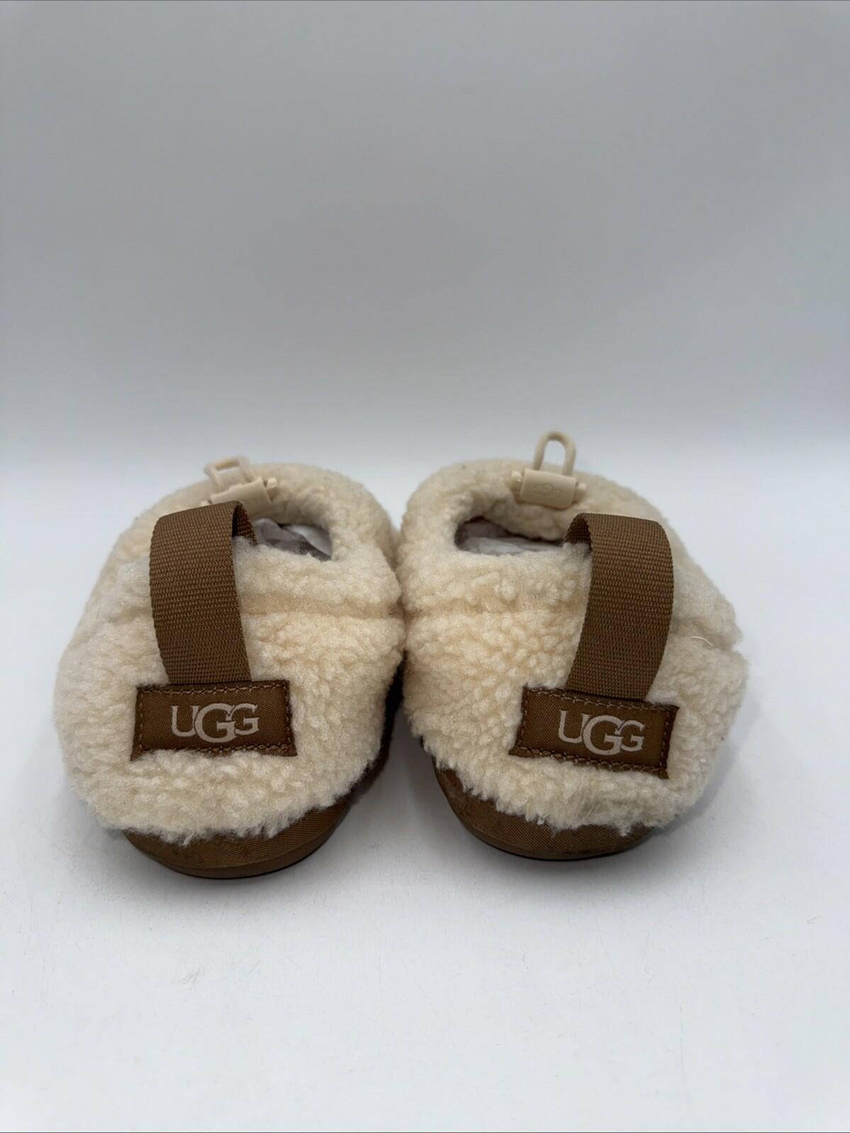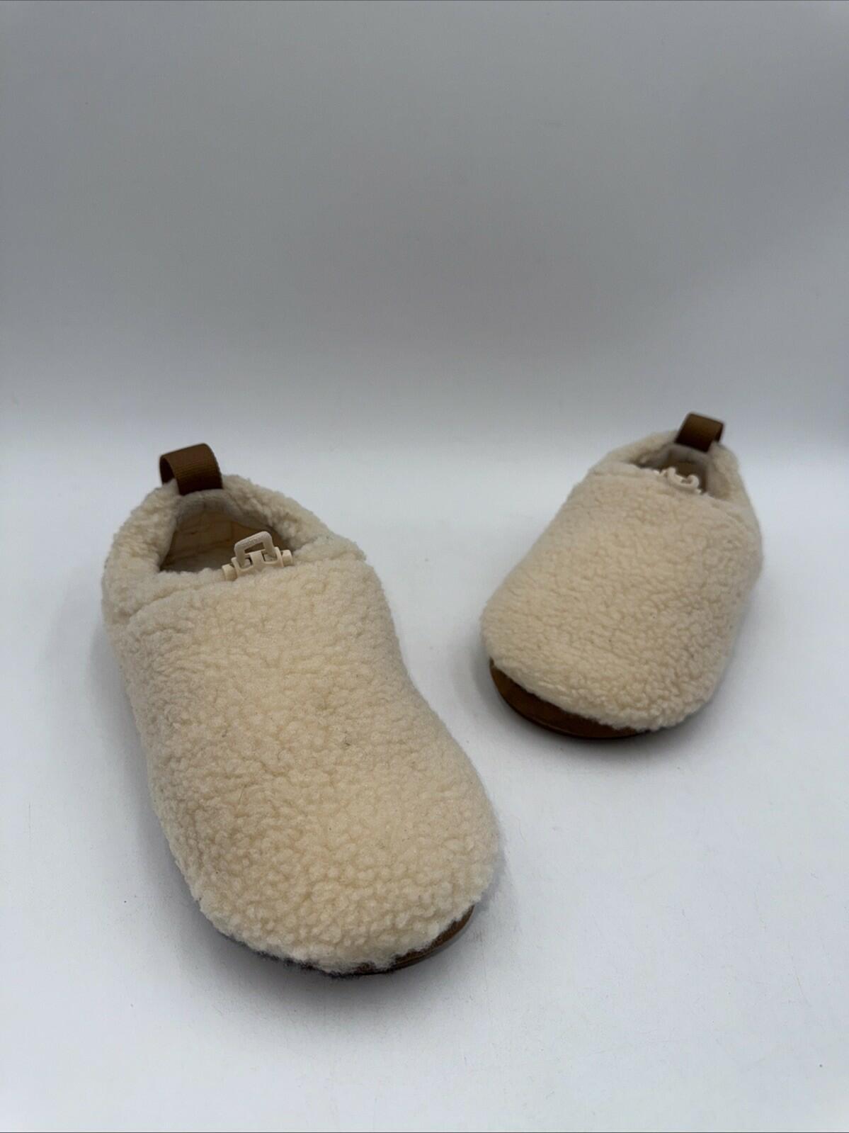 The UGG Women's Plushy Slipper Shoes in size 4 feature a round toe shape, pull-on closure, and a faux shearling rubber outsole for ultimate comfort and warmth. These slippers are lined with wool and cushioned for added cushioning and support, making them perfect for travel, casual wear, or lounging at home. The beige color, adjustable accents, and UGG logo add a touch of style to these classic and cozy slipper shoes, perfect for any season. Made by UGG Australia, these slippers are a designer quality product that exudes both comfort and style.- bottom soles are slightly worn Scratches