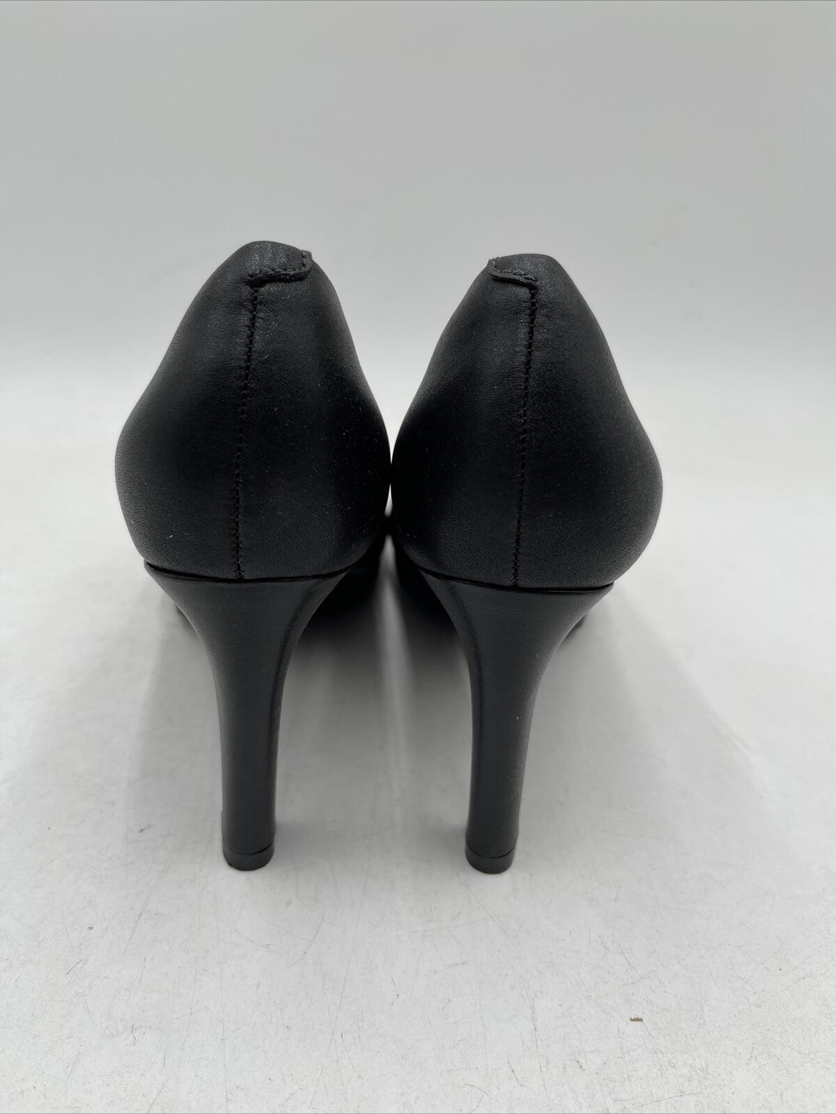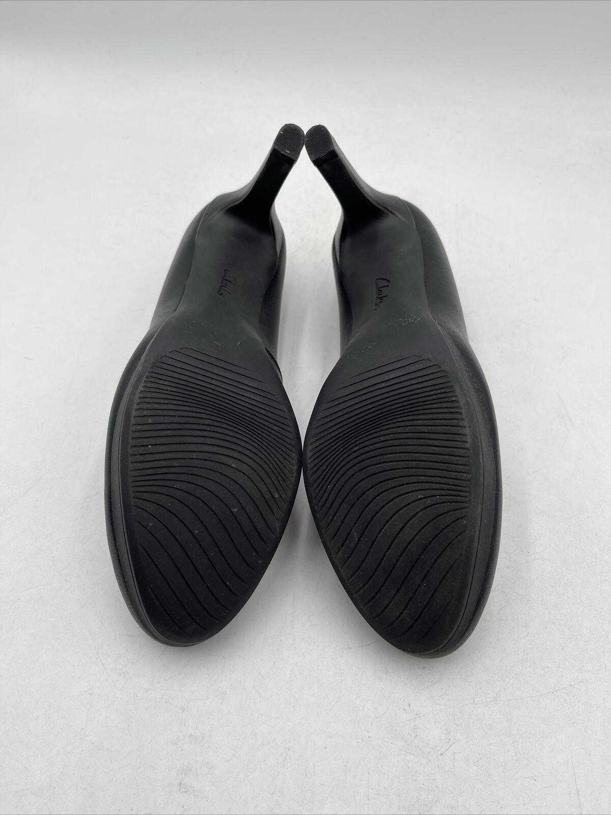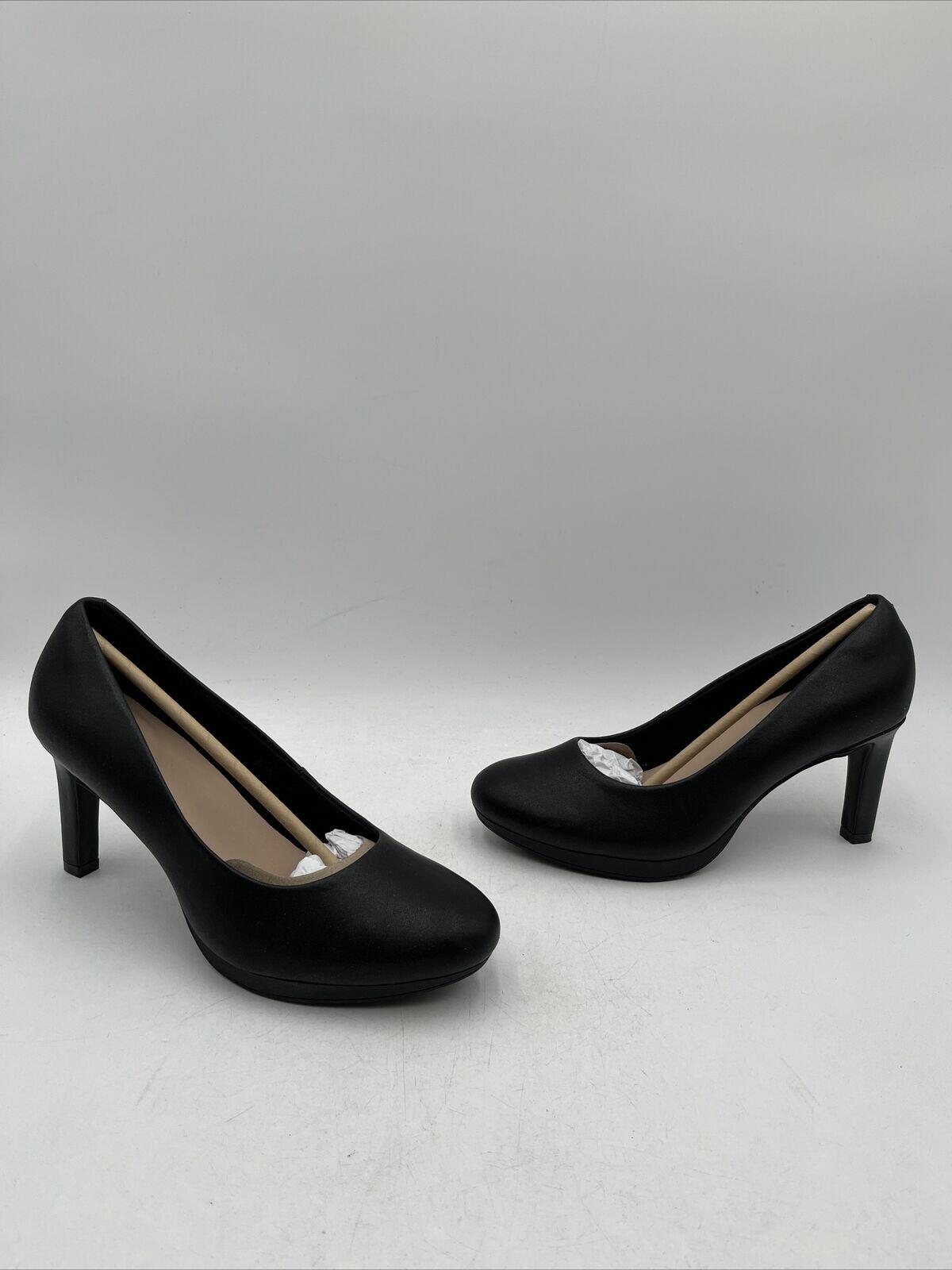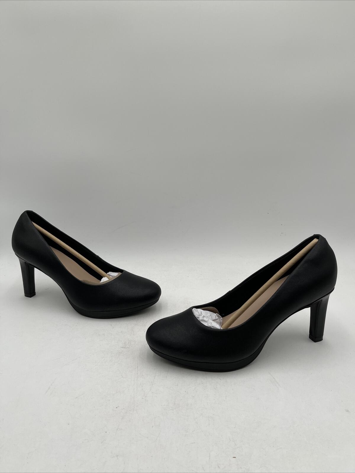 Elevate your style with these stunning Clarks Women's Ambyr Joy Black pumps. Crafted with genuine leather, these slip-on heels feature a sleek stiletto heel and a comfortable fit, making them perfect for a night out on the town or a day at the office. The high heel height of 3-3.9 inches provides the perfect amount of lift, while the M shoe width ensures a great fit. These pumps are perfect for adding a touch of sophistication to any outfit. The black color complements any wardrobe and the pump style is timeless.D2
