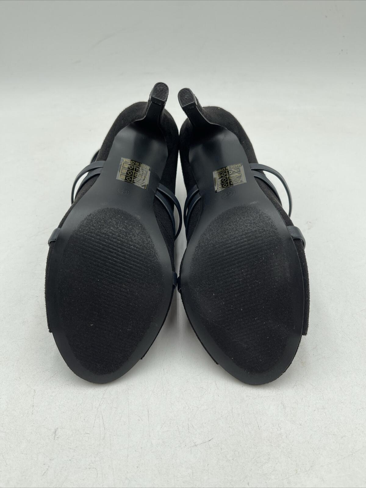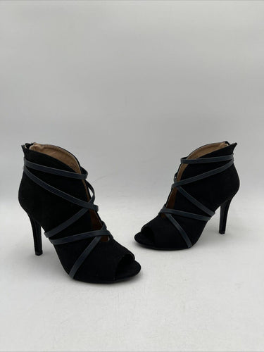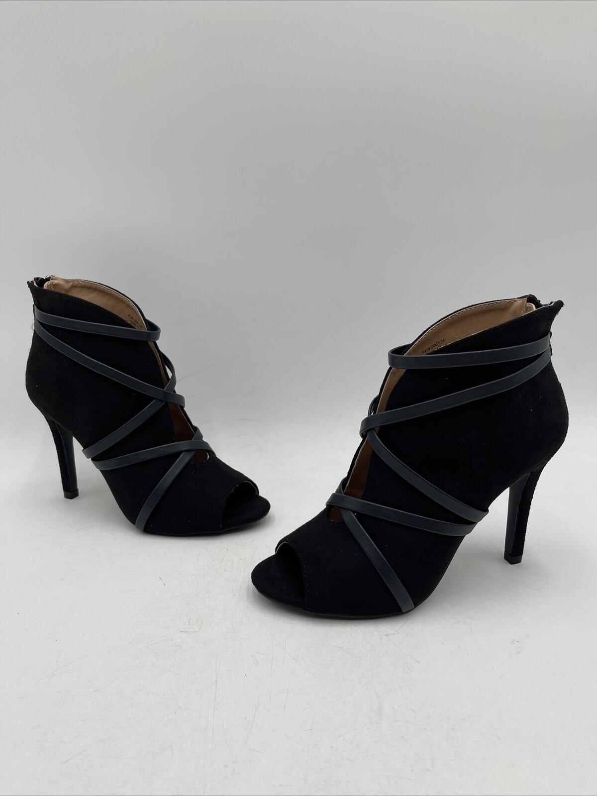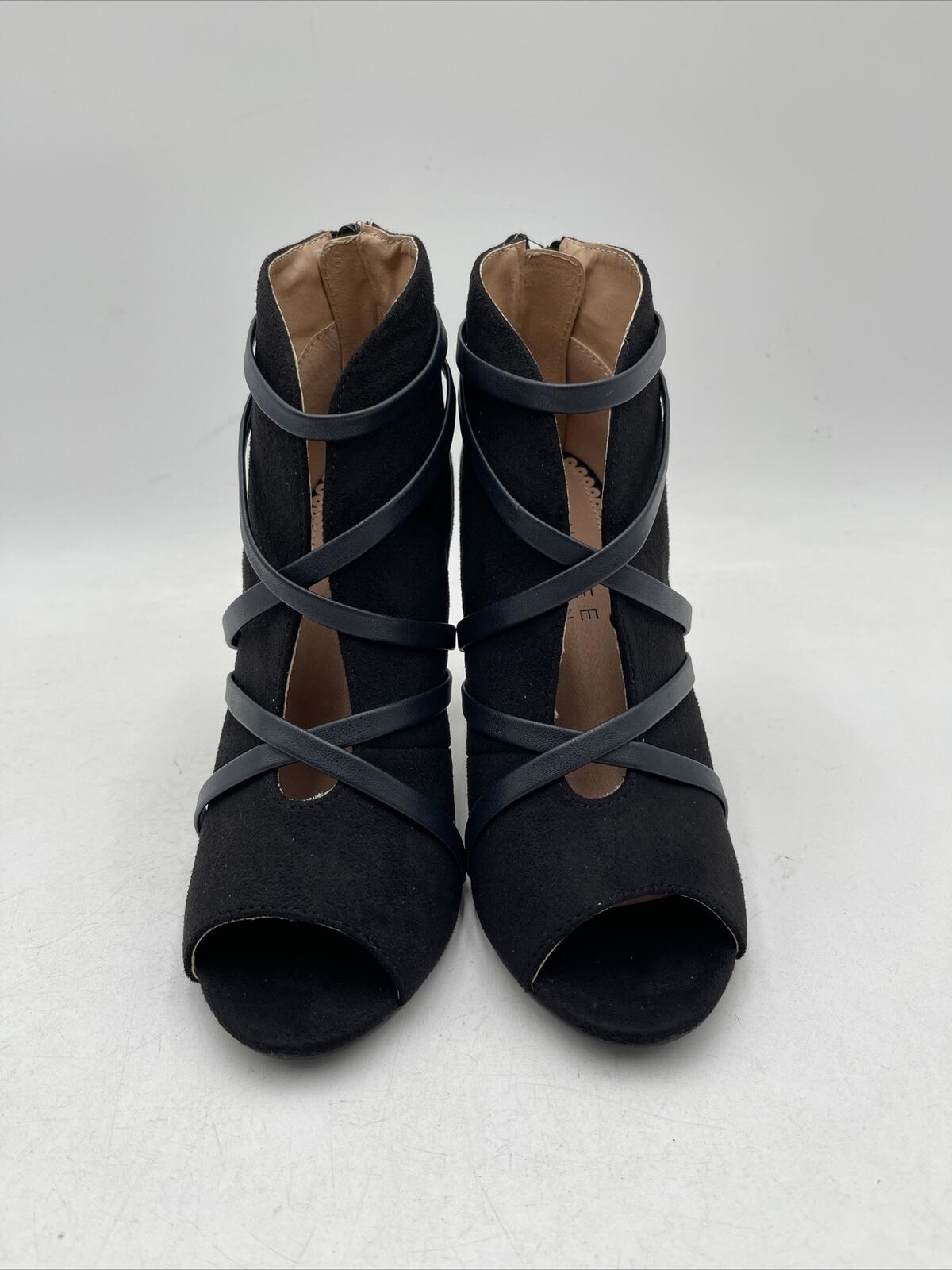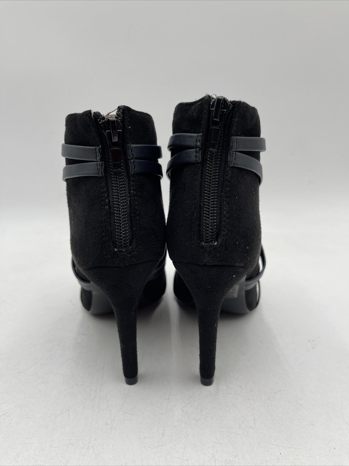 Women's Journee Collection Samara sandals in black suede with a high stiletto heel of 3-3.9 inches and a zip closure. The size is 5.5 and the brand is Journee Collection. These sandals are not vintage and not customized.D2