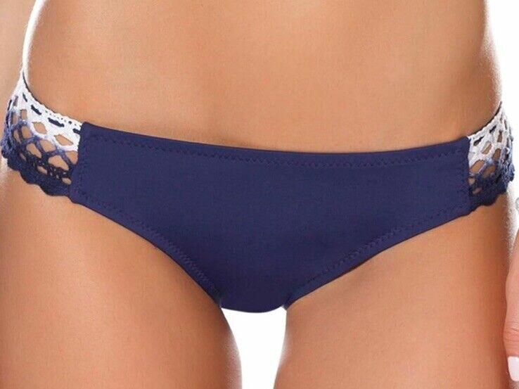 Elevate your beach look with this stunning Becca by Rebecca Virtue Women's Sunrise & Midnight Tab American Bottom. This piece features a solid pattern in a beautiful blue color, accented with the brand's logo. The bikini style swim bottom is made of a blend of polyester, spandex, and nylon, providing both comfort and durability.