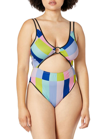 Bikini Lab Women's High Leg Cut Out One Piece Swimsuit, Pink//Prism Stripe, L