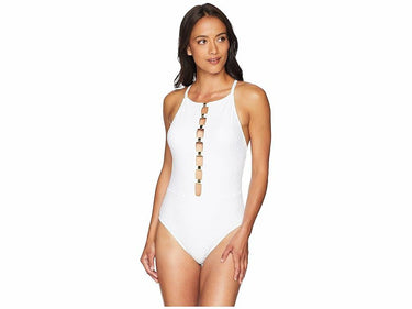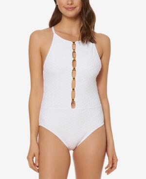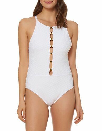 Gold-tone hardware accents sleek cutouts and textured fabric lending sophistication to this one-piece swimsuit from Bleu by Rod Beattie. A high neckline and crisscross back keep the look current. Removable soft cups. Moderate bottom coverage. Pull-on styling; adjustable over-the-shoulder straps cross at back. High neckline with cutout gold-tone hardware