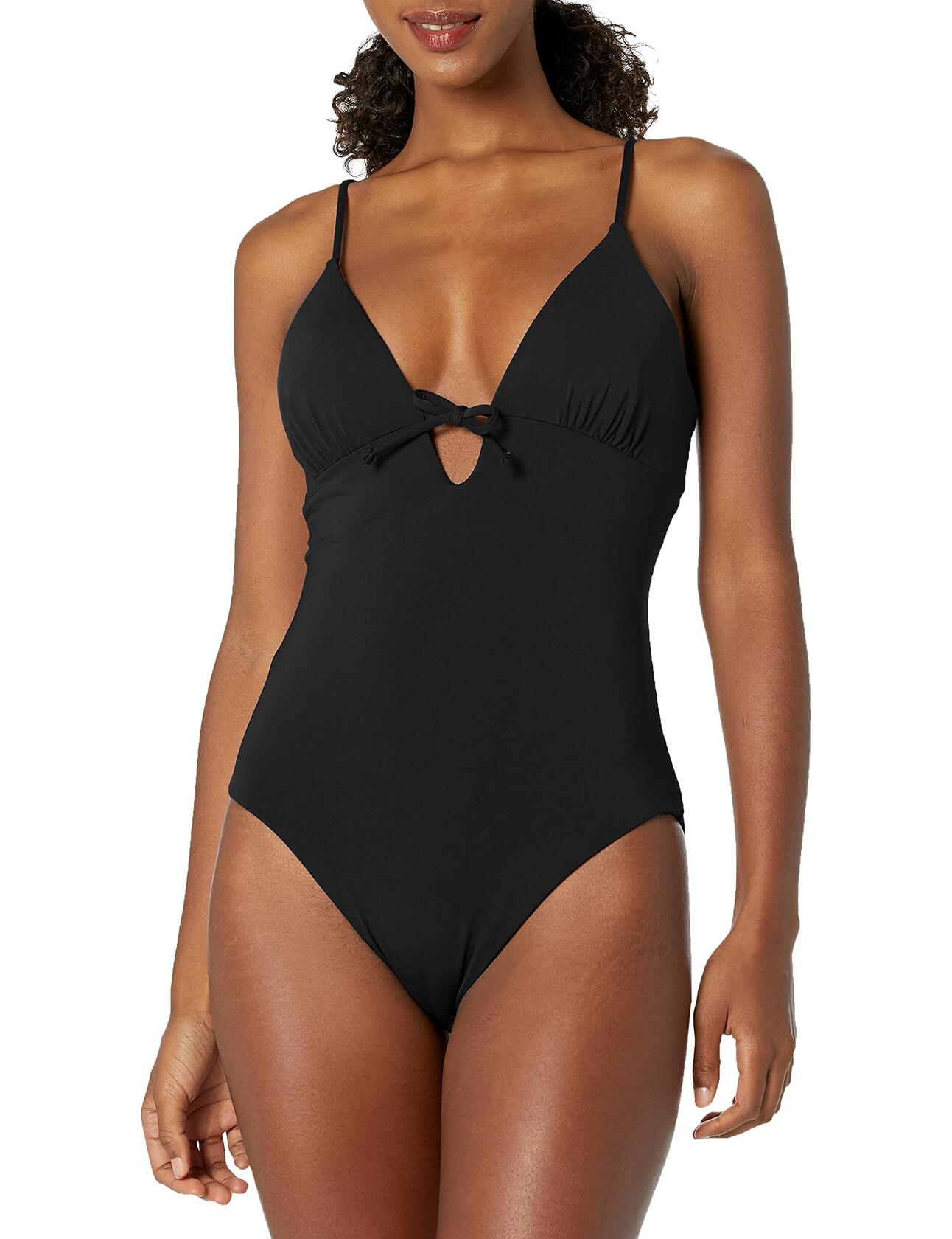 UPF 50 fabrication protects skin during outdoor activity by blocking harmful Ultraviolet A and Ultraviolet B rays (UVA and UVB). Plunging V-neckline with adjustable tie straps. Feature adjustable crisscross straps at back for a personalized fit. Medium rear coverage. 82% nylon, 18% spandex. Machine wash, line dry. Imported.