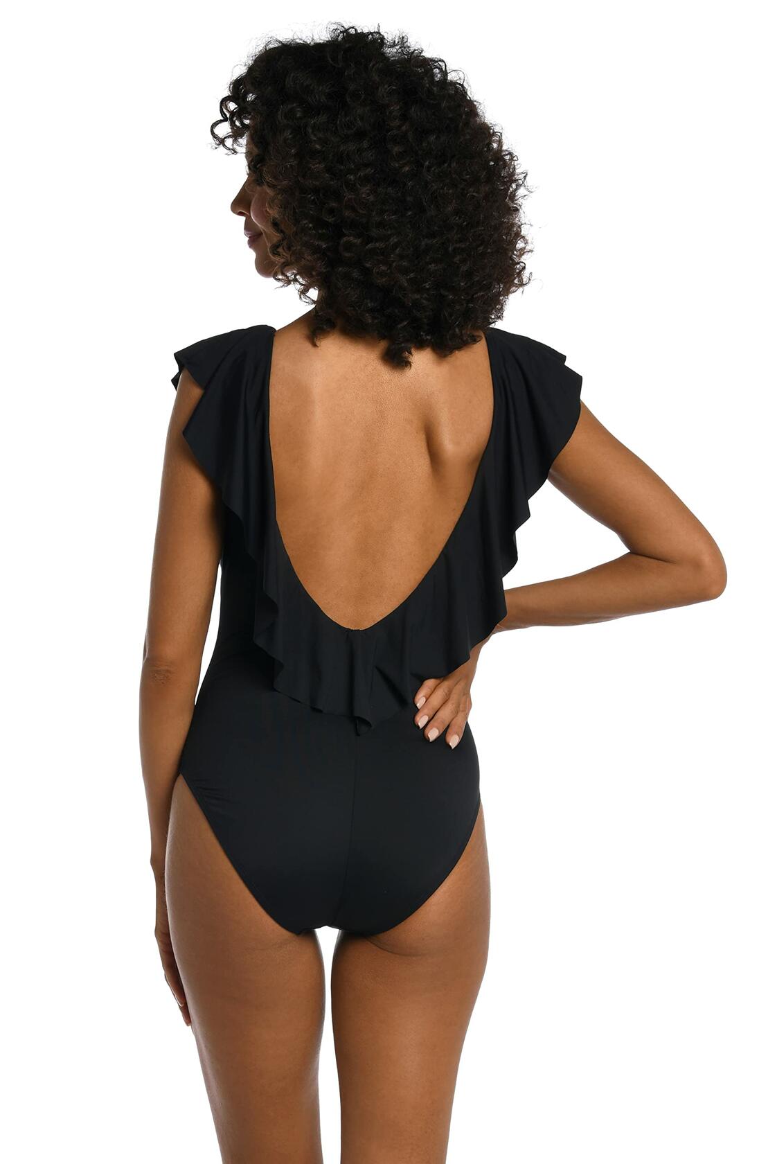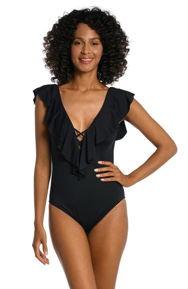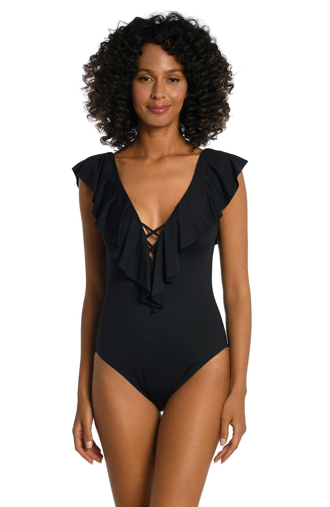 La Blanca Women's Island Goddess Shoulder Ruffle Plunge One Piece, Black, 10