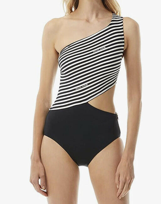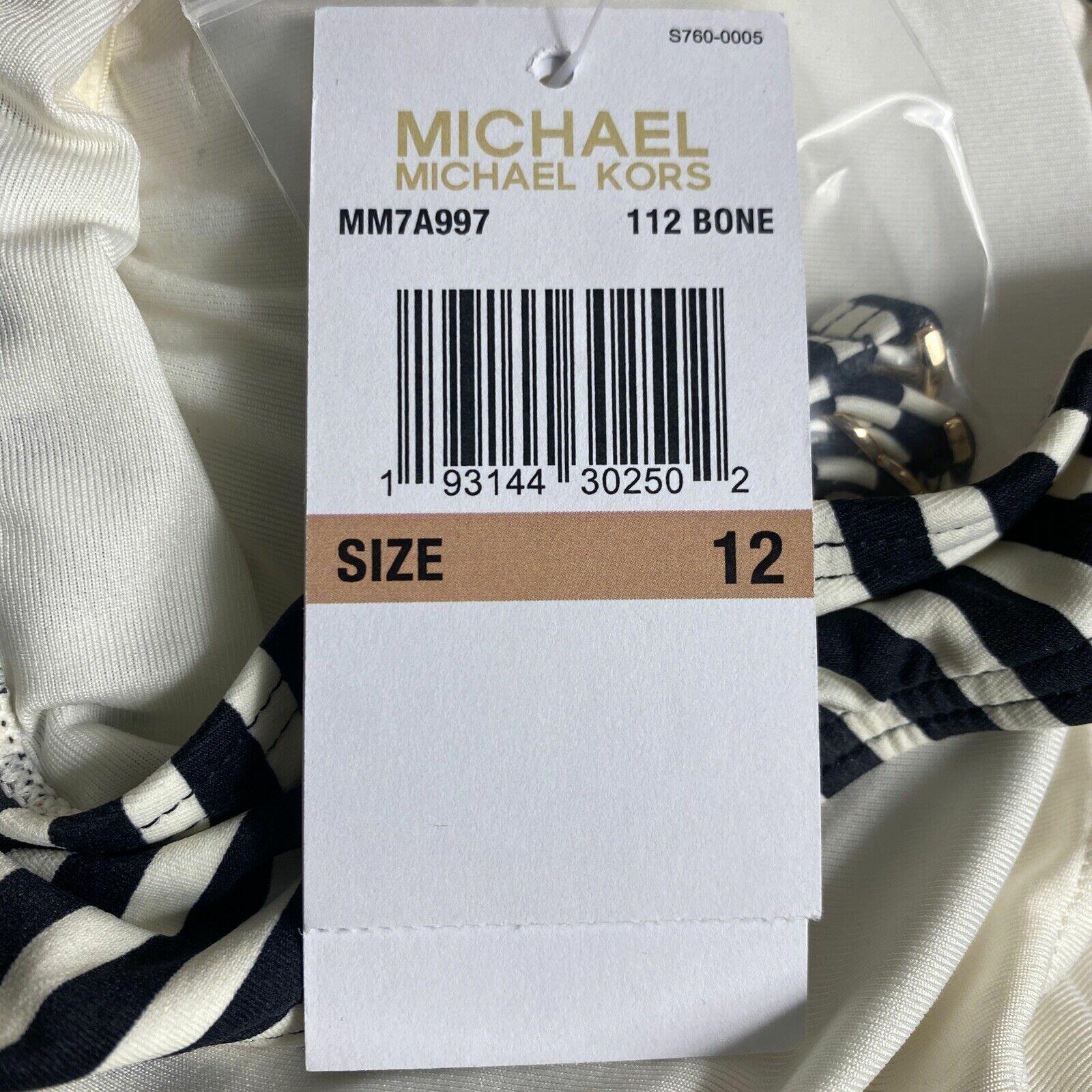 NWD Michael Kors Logo Stripe One Shoulder Cutout w/Zipper Side Bottom Size 12. Condition is New with defect. Swimsuit has faint white streaks. Shipped with USPS First Class.Spandex,Nylon