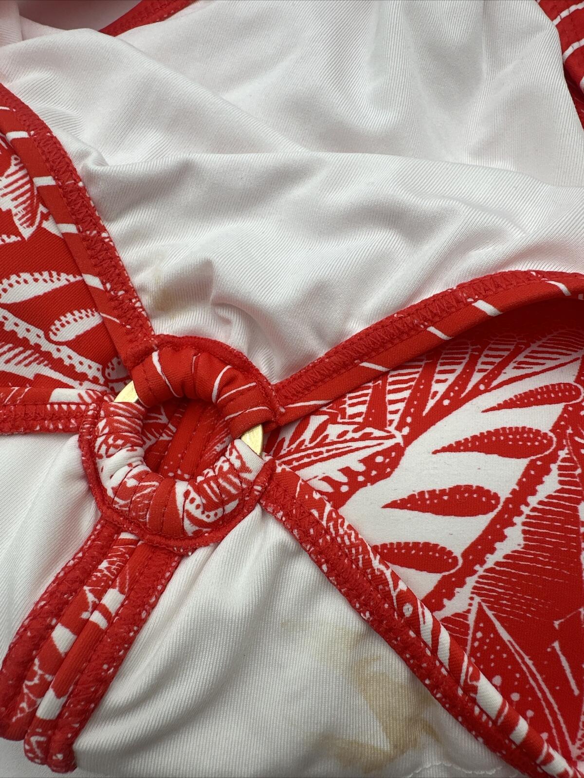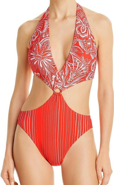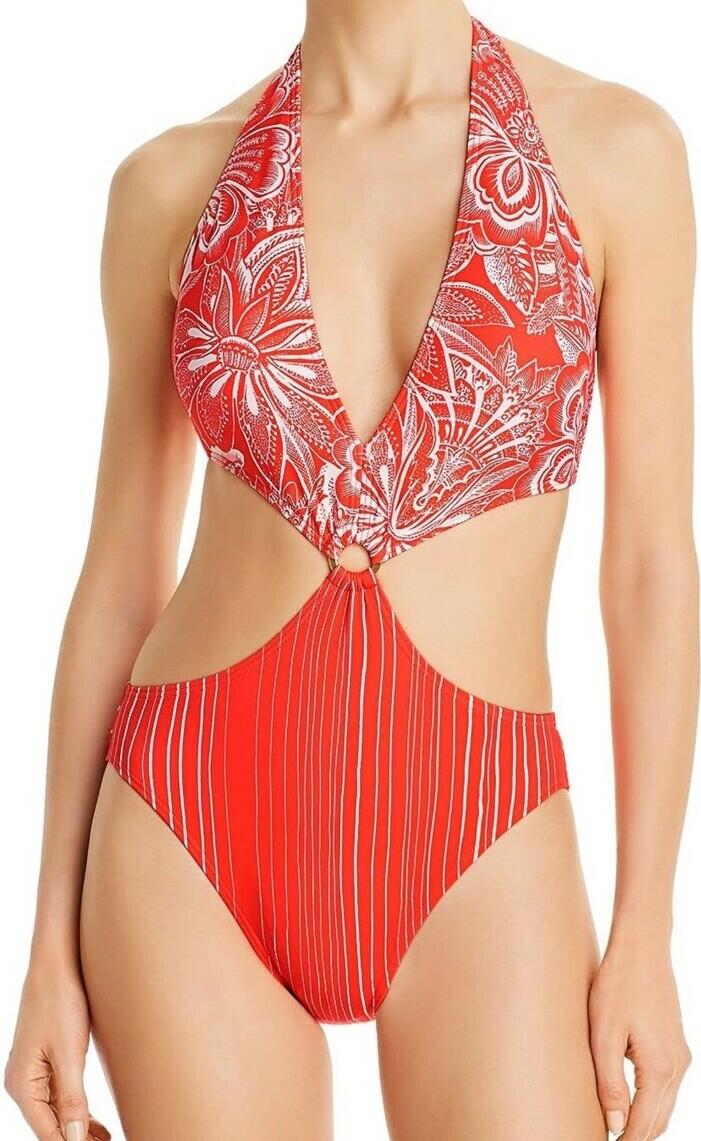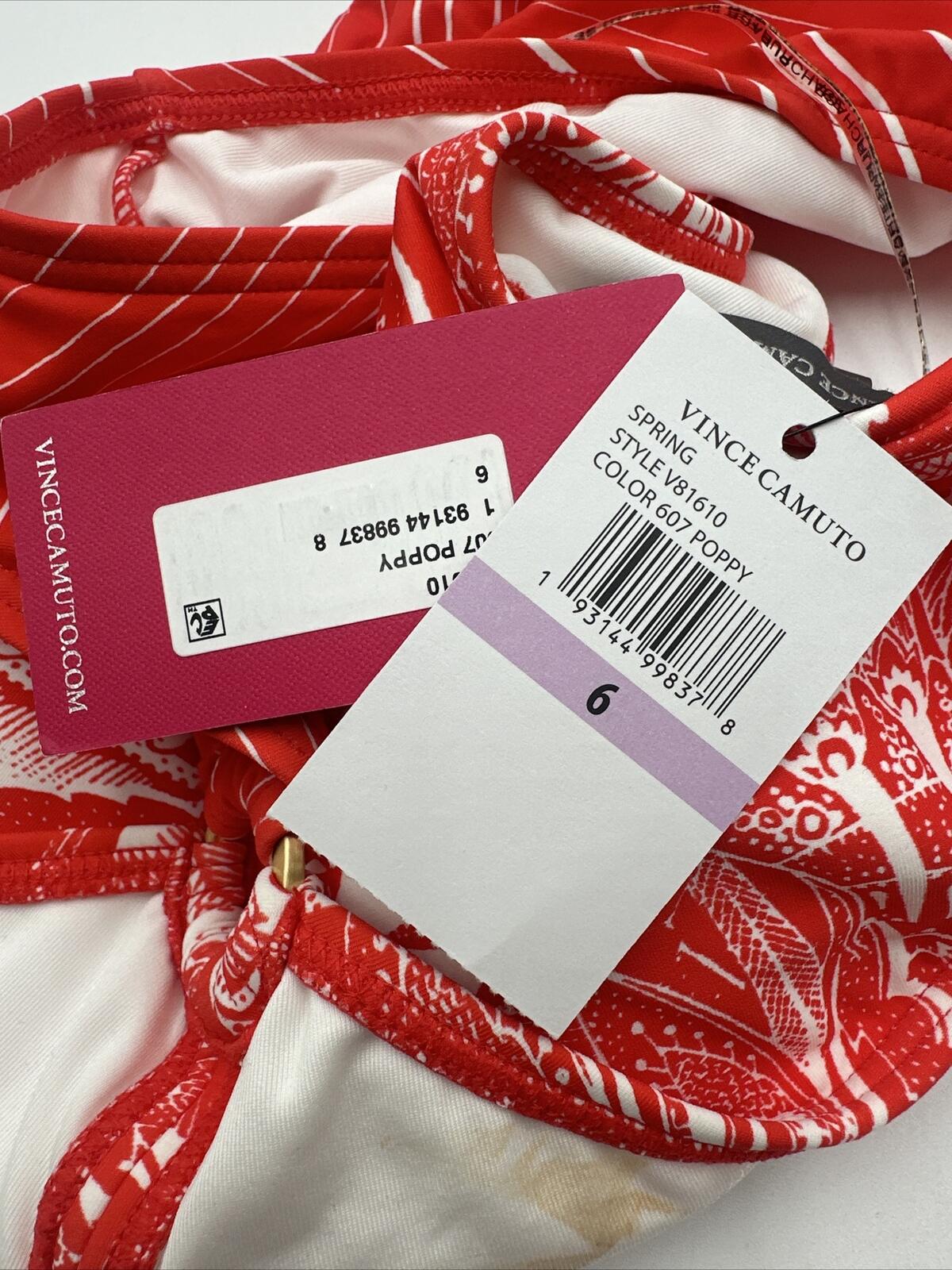 Make a statement with this gorgeous Vince Camuto Riviera Dei Fiori Ring Mixed Print Monokini in Poppy. This stunning swimsuit in size 6 features a solid red color with a beautiful marine theme that is perfect for your beach vacation. The halter strap accentuates your neckline while the bikini bottom style adds a touch of sexiness to your swimwear.Made of spandex material with removable pads, this one-piece swimsuit offers both comfort and style. The triangle swim top style comes with a strap accent that adds an extra touch of elegance. Whether you are lounging by the pool or taking a dip in the ocean, this Vince Camuto swimsuit is the perfect addition to your swimwear collection.