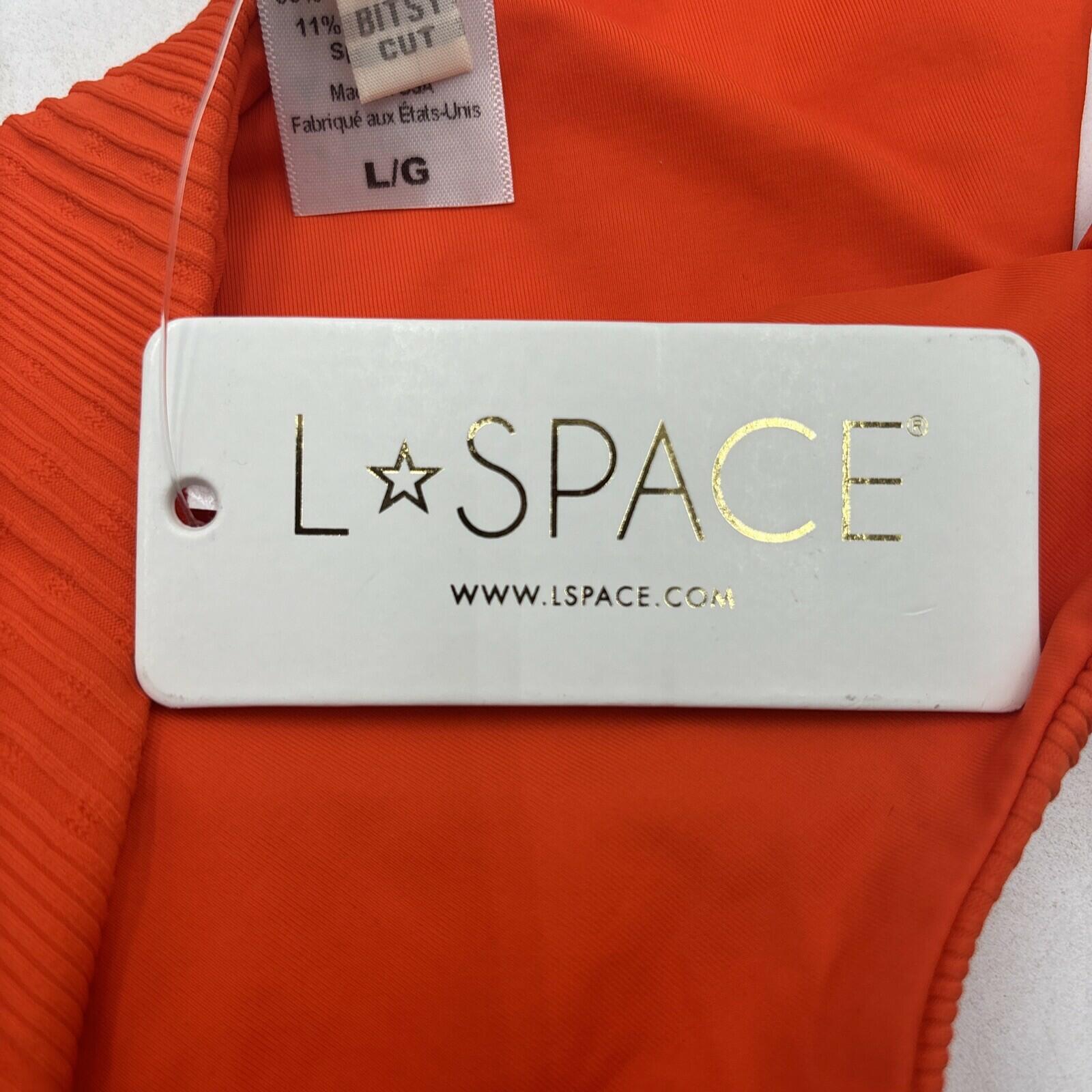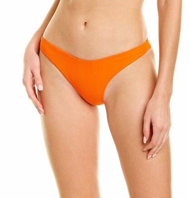 Introducing the NWT LSpace Pointelle Rib Cabana Bitsy Bottoms in Poppy, size L. These designer bottoms are made from a lightweight and stretchy blend of nylon and spandex, ensuring a comfortable and flattering fit for all body types. The vibrant orange color and solid pattern make them the perfect addition to any beach-themed outfit, while the cheeky swim bottom style adds a touch of playfulness.