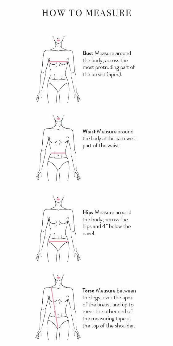 • SIZING: Order a swimsuit in your usual size for the most comfortable and slimming fit. Sizing up is suggested depending on your fit preference or if you prefer a less snug fit. For bust, measure across the fullest part of the breast. For waist, measure the narrowest part of your waist, above your belly button. For hip, measure across the hips about 4 inches below your belly button. For torso, measure between your legs and over the top of the shoulder. REFER TO SIZE CHART ON LEFT.