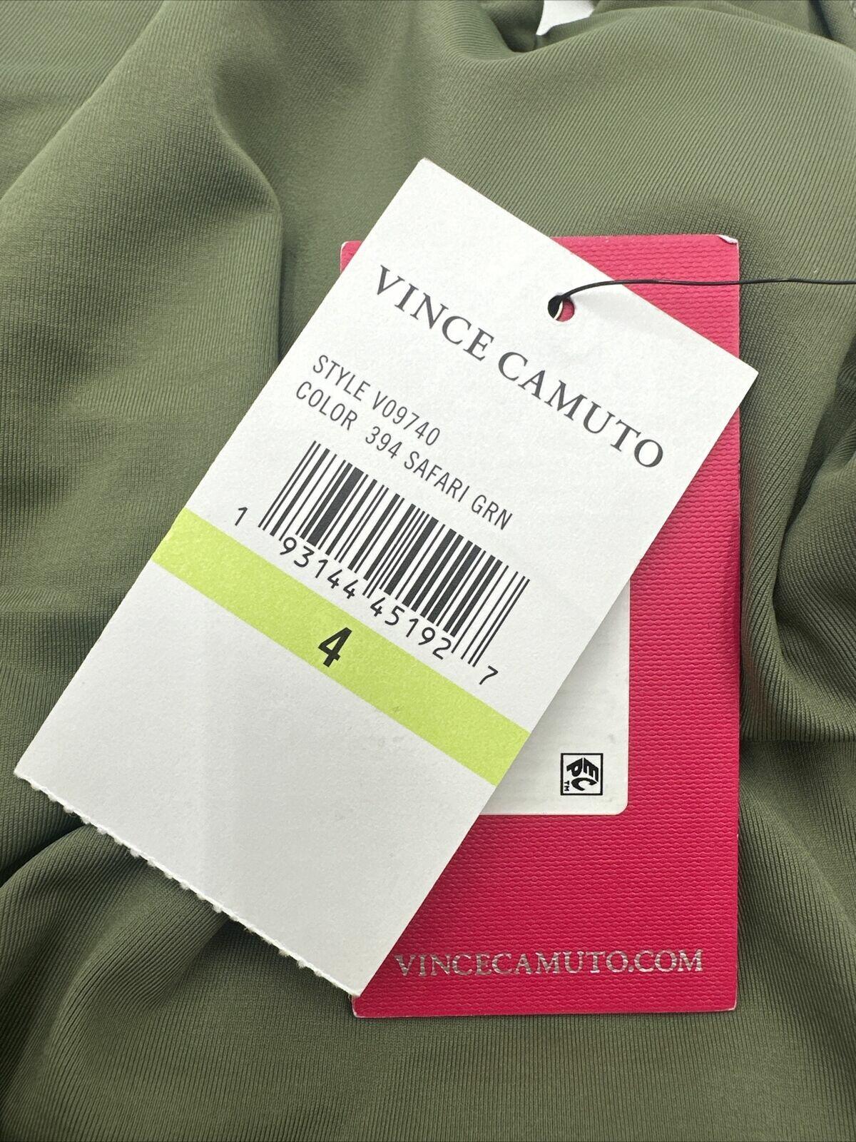 This stunning one-piece swimsuit from Vince Camuto is perfect for any beach or pool day. The beautiful safari green color and solid pattern make it a stylish choice. The halter strap and bandeau style swim top provide a comfortable fit, while the ring cutout adds a unique accent. Made from high-quality spandex, it also features stretch and is suitable for regular size women. The swimsuit includes a Vince Camuto logo and is brand new with tags.