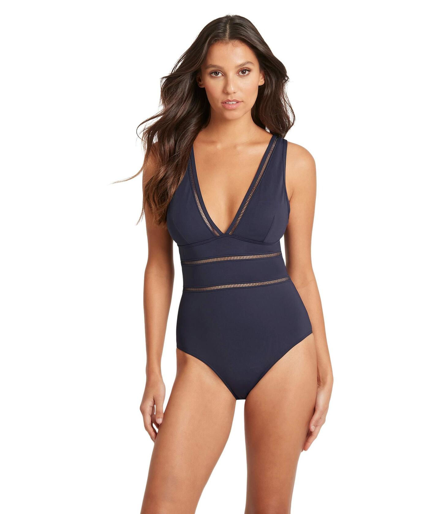 Get ready for a pool party or a day at the beach side wearing the gorgeous SEA LEVEL SWIM Essentials Spliced One-Piece. Deep V-neckline. Adjustable and convertible straps. Removable soft cups. Stretch ladder trim. Power-mesh support at front and back. Eyelet cutout detailing on the neckline and waist. Square back. 85% recycled nylon, 15% elastane. Hand wash cold.
