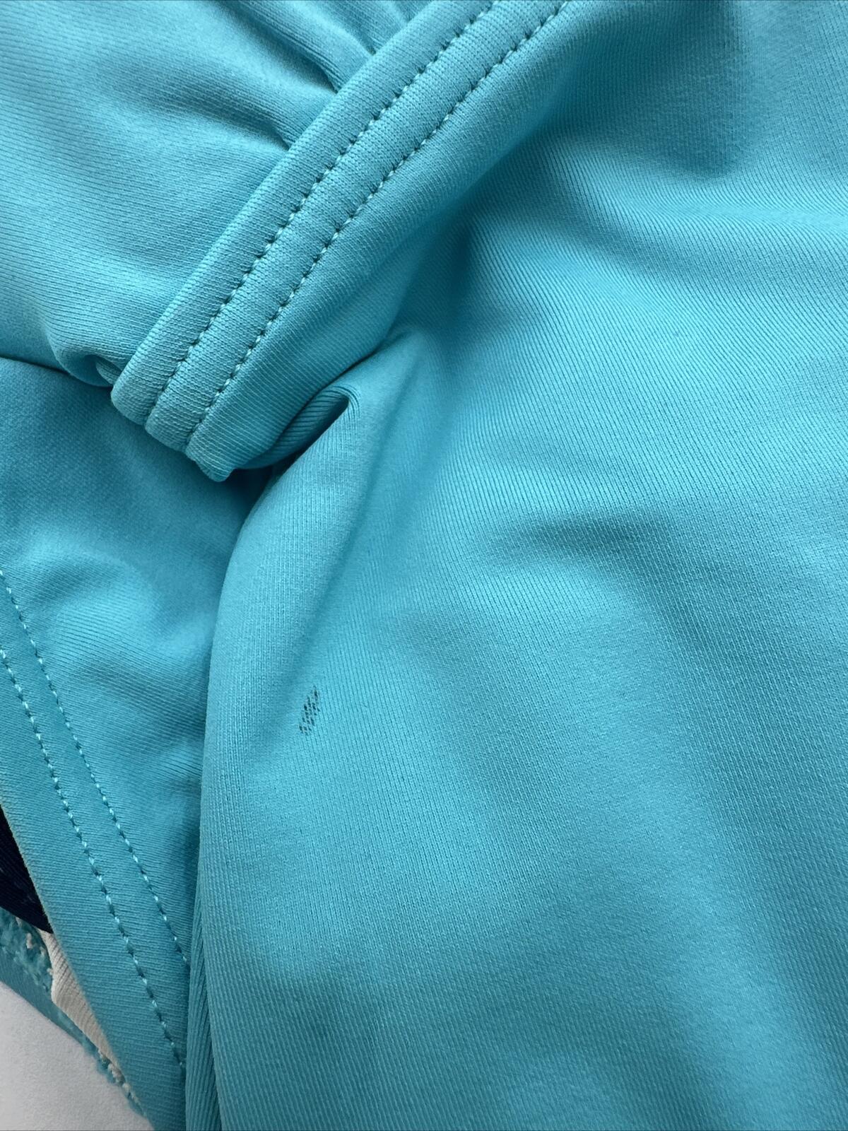 This stunning Vince Camuto one-piece swimsuit in deep sea blue is sure to turn heads at the beach or pool. The bandeau-style swim top features a halter strap and removable soft cups for added comfort and support. The colorblock pattern with blue accents and stretchy spandex material make this one piece not only stylish but also comfortable to wear. The bikini-style swim bottom completes the look and is perfect for those who want more coverage than a traditional bikini.The Vince Camuto swimsuit is available in size 12 and is suitable for women of all ages, shapes, and sizes. The colorful theme and attractive accents make this one-piece swimsuit perfect for any summer outing. So, make a statement with this stunning swimsuit that is not only fashionable but also comfortable to wear.