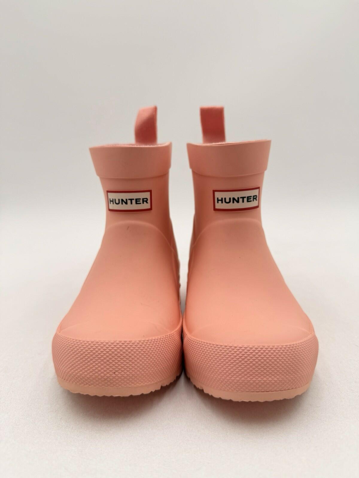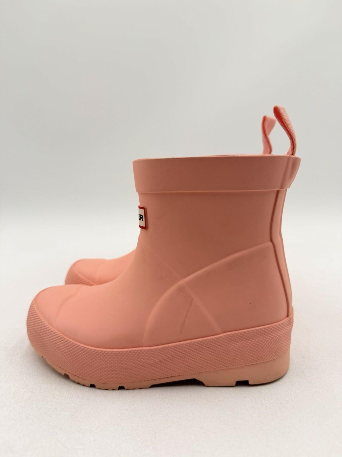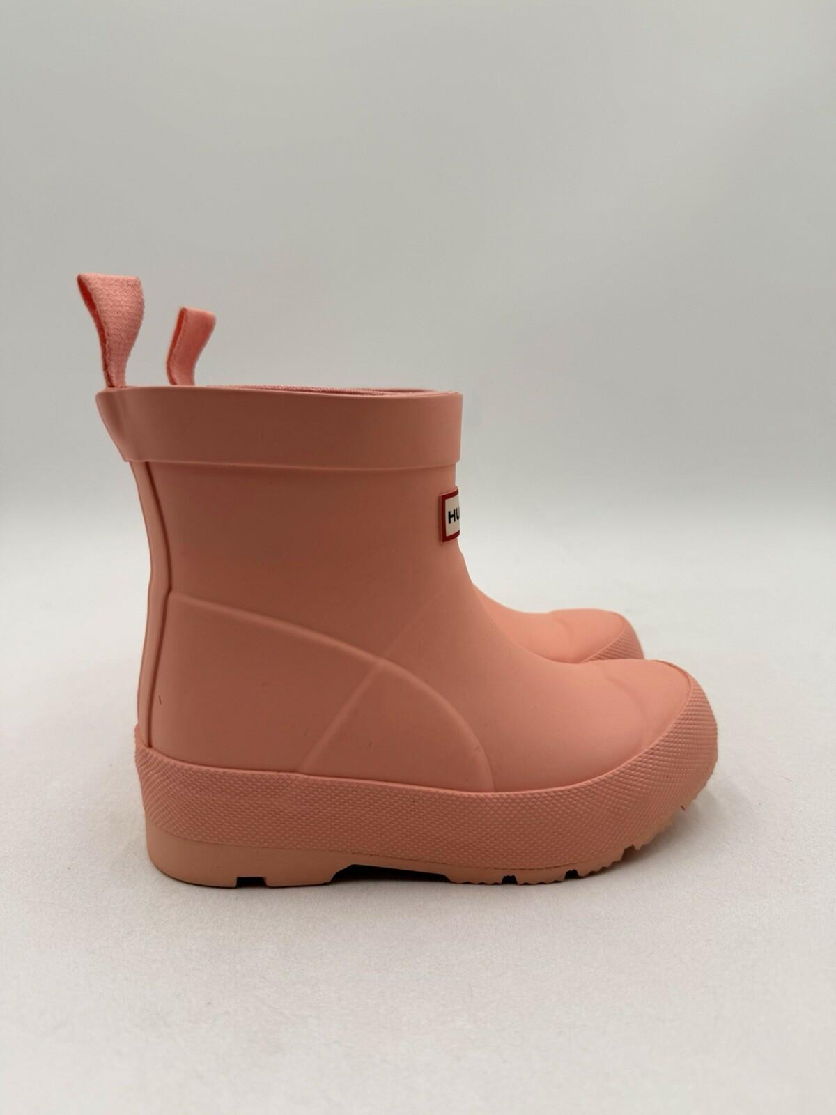 Small stain on the rubberThe Hunter Play Rain Boot in Salmon Pink is a stylish and functional choice for kids. With a round toe and ankle shaft style, these waterproof boots are both lightweight and comfortable. Perfect for casual wear or outdoor activities, these boots feature a pull-on closure and a rubber outsole for durability. Designed by Hunter, a trusted brand in outdoor footwear, these boots are sure to keep your little one dry and stylish in any season.