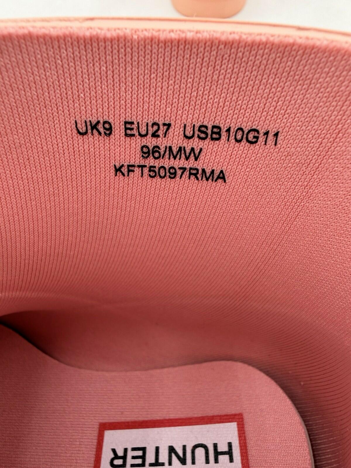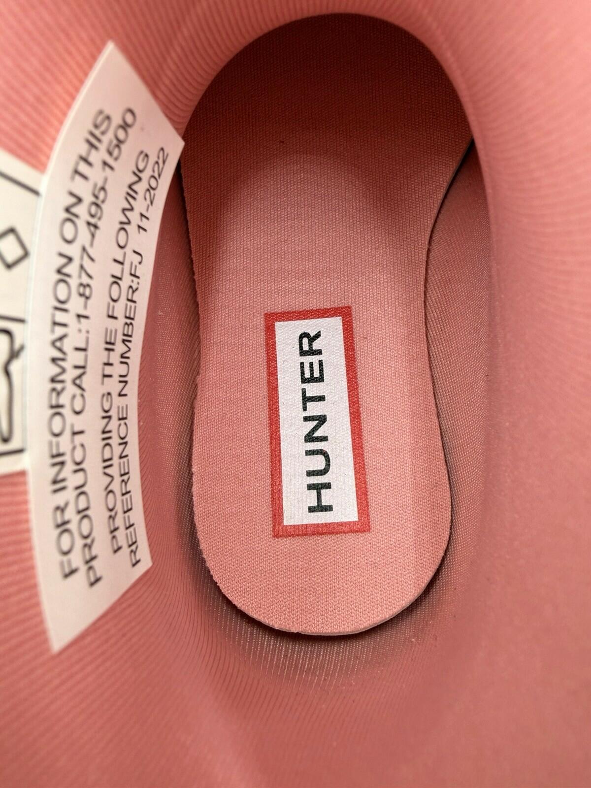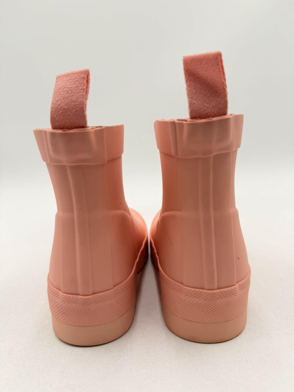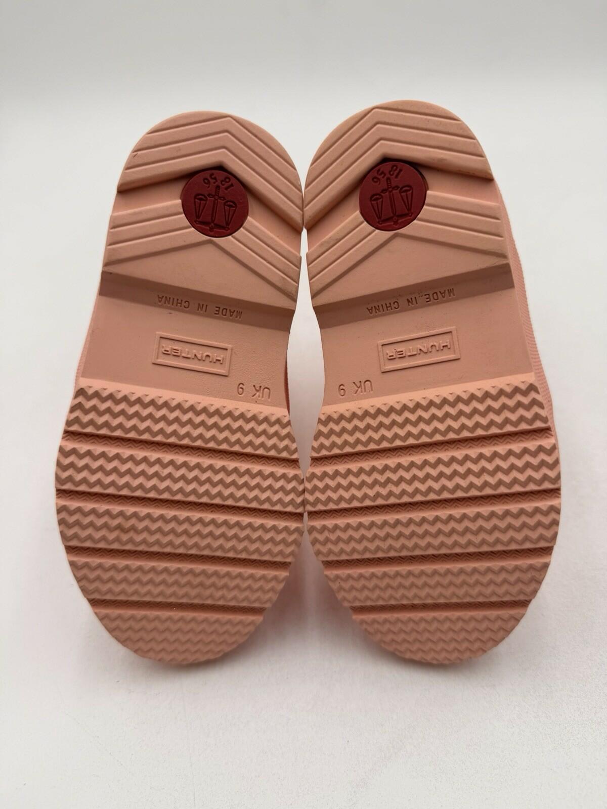 Small stain on the rubberThe Hunter Play Rain Boot in Salmon Pink is a stylish and functional choice for kids. With a round toe and ankle shaft style, these waterproof boots are both lightweight and comfortable. Perfect for casual wear or outdoor activities, these boots feature a pull-on closure and a rubber outsole for durability. Designed by Hunter, a trusted brand in outdoor footwear, these boots are sure to keep your little one dry and stylish in any season.