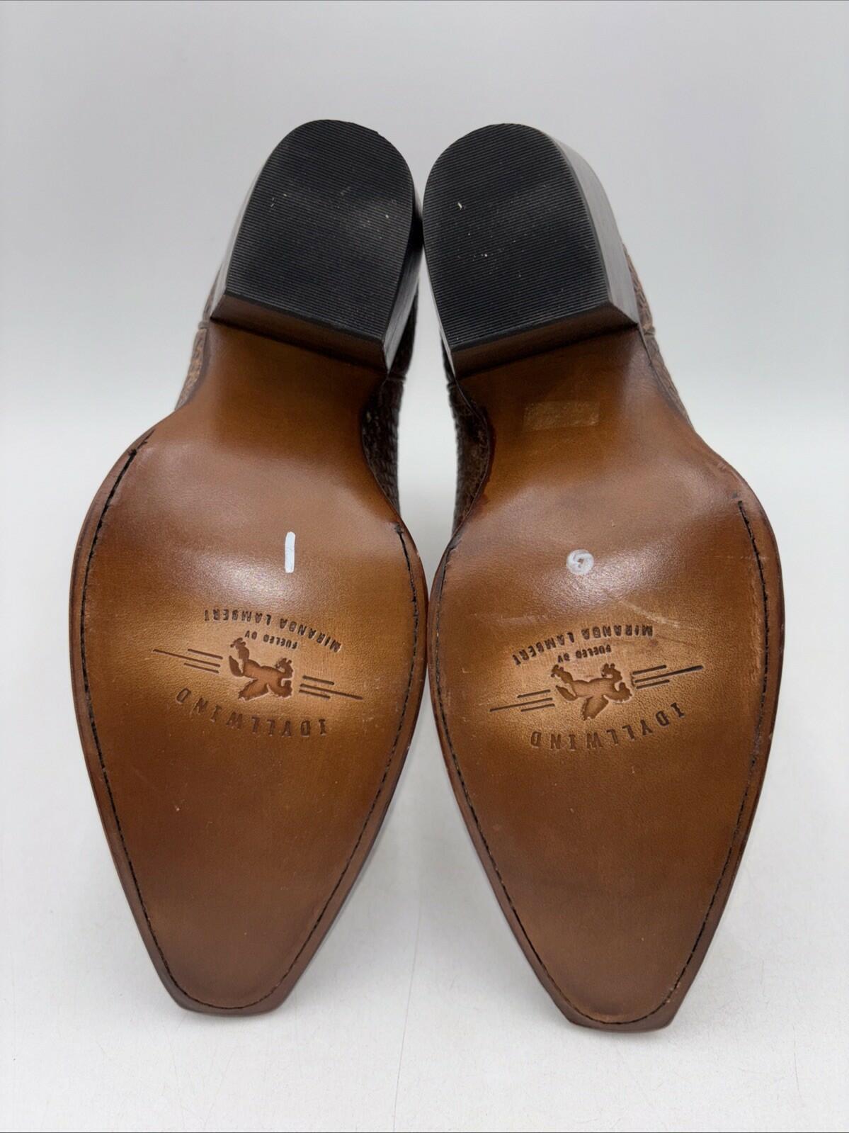 The Idyllwind Miranda Lambert Brown Western Snake Leather Booties in size 6.5 are stylish ankle boots perfect for various occasions such as travel, parties, or casual wear. With a round toe, low block heel, zip closure, and lined for comfort, these boots are a trendy addition to any wardrobe. Featuring a Western style with animal print accents and a hint of bohemian, grunge, and cowgirl themes, these booties are crafted from high-quality leather with a leather lining and insole. Ideal for the fall, winter, and spring seasons, these unique boots from the Miranda Lambert collection are sure to make a statement.- bottom soles are slightly worn