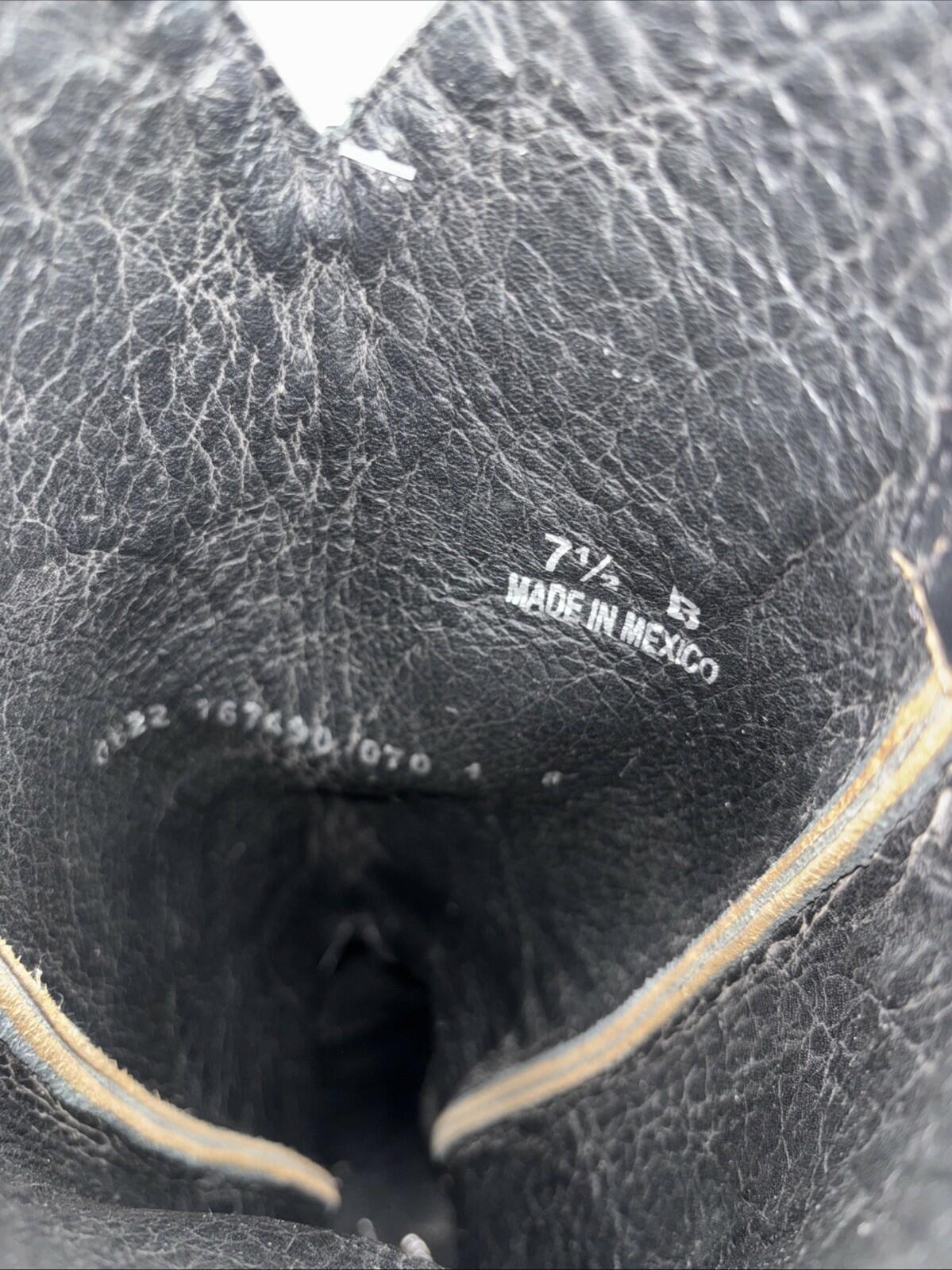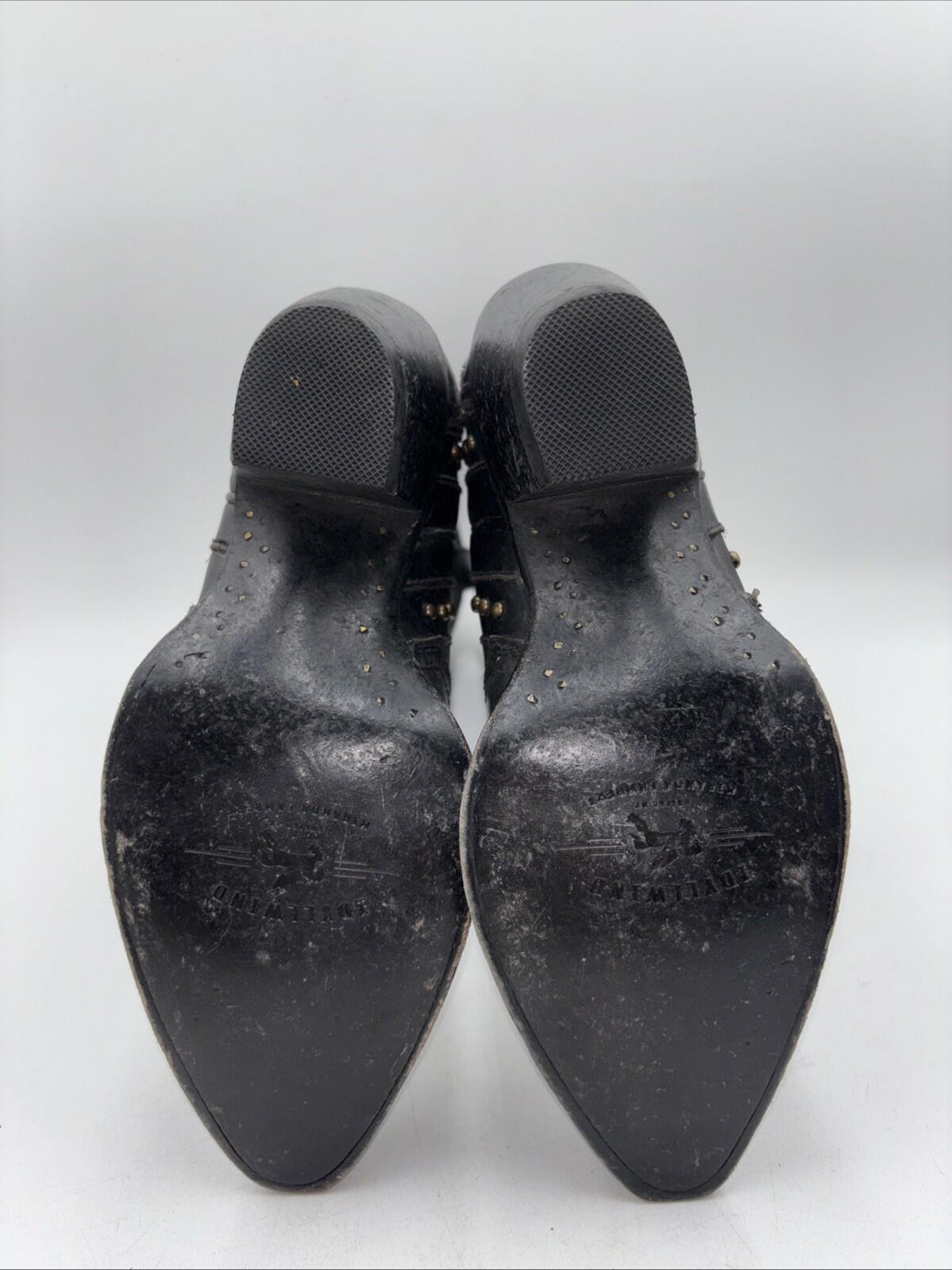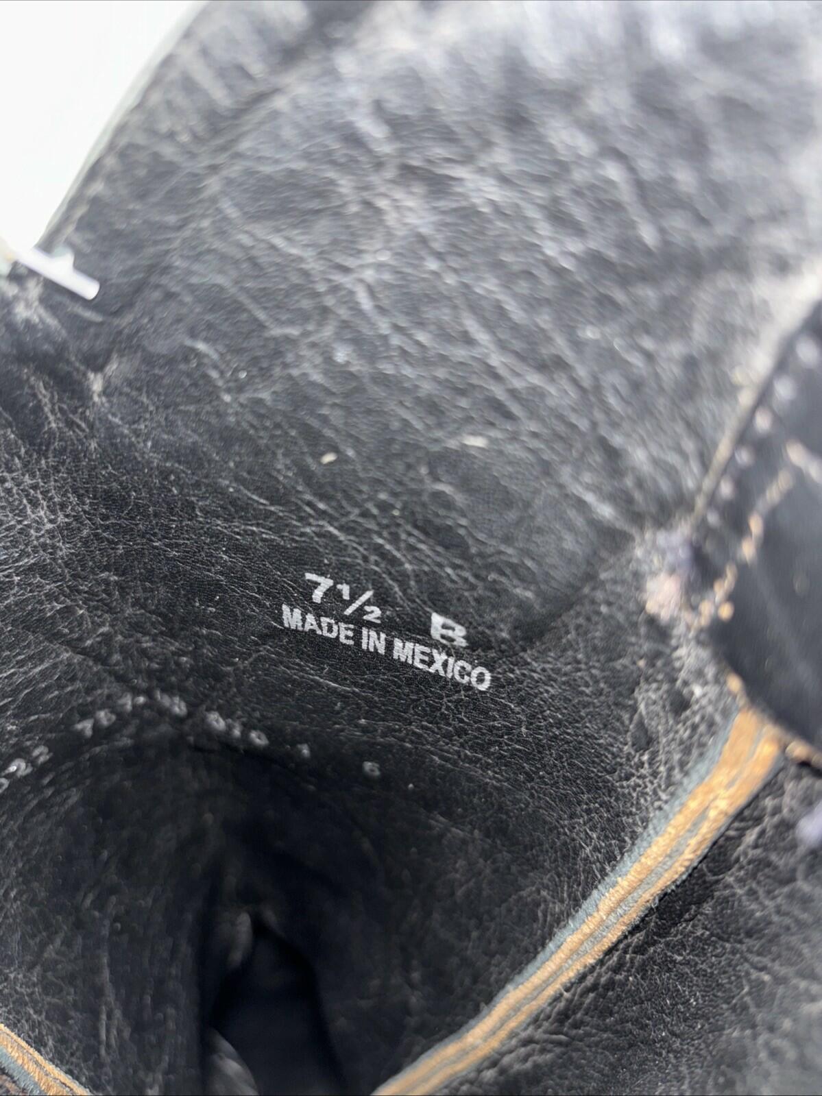 The Idyllwind Walk This Way Women's Cowgirl Black Boots in size 7.5 B offer a stylish and comfortable option for casual occasions. These mid-calf boots feature a pointed toe, studded accents, and a low block heel for added flair. Made of leather with a comfortable leather lining and insole, these boots are perfect for those who appreciate a Western cowboy theme in their footwear. The pull-on closure and solid black color make them versatile for everyday wear.- bottom soles are slightly worn