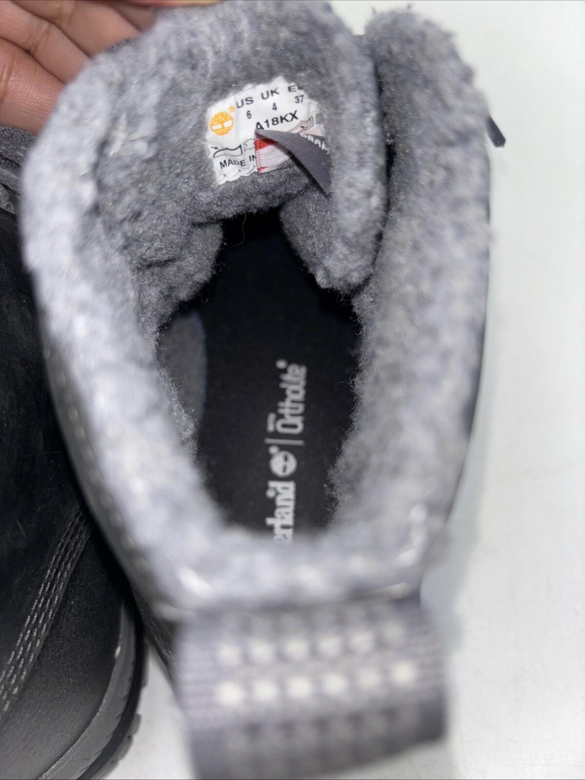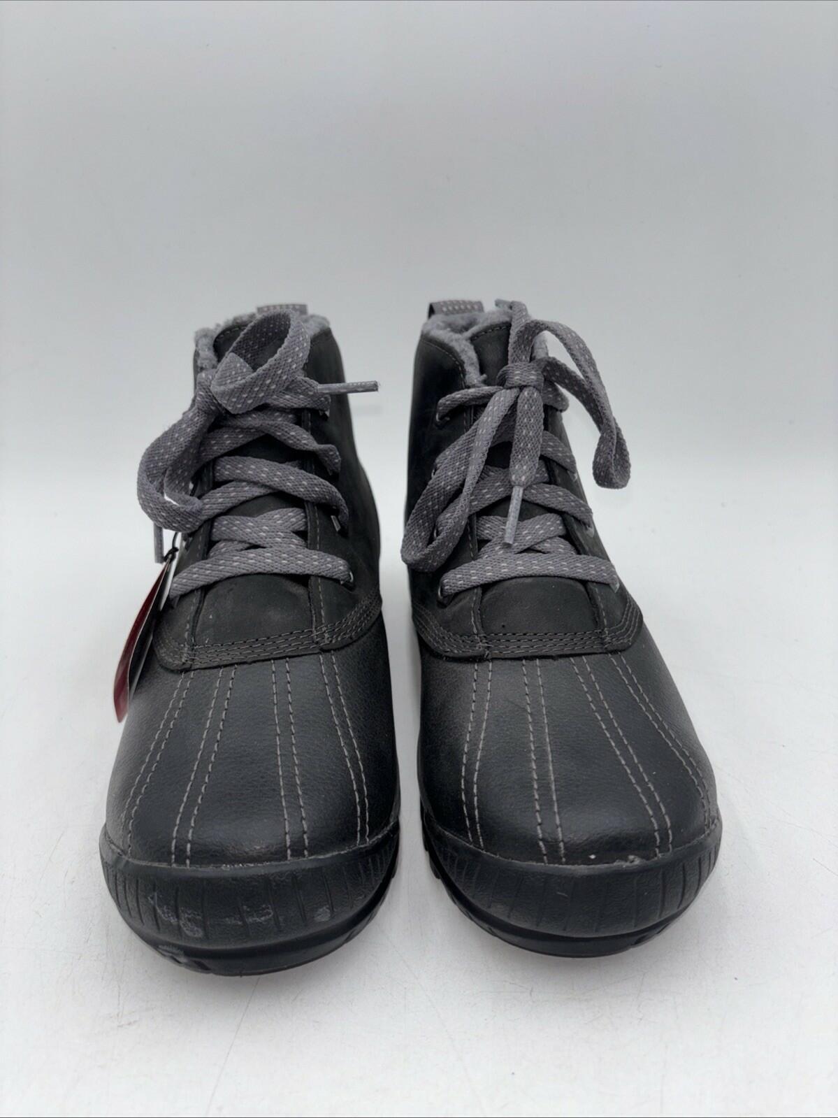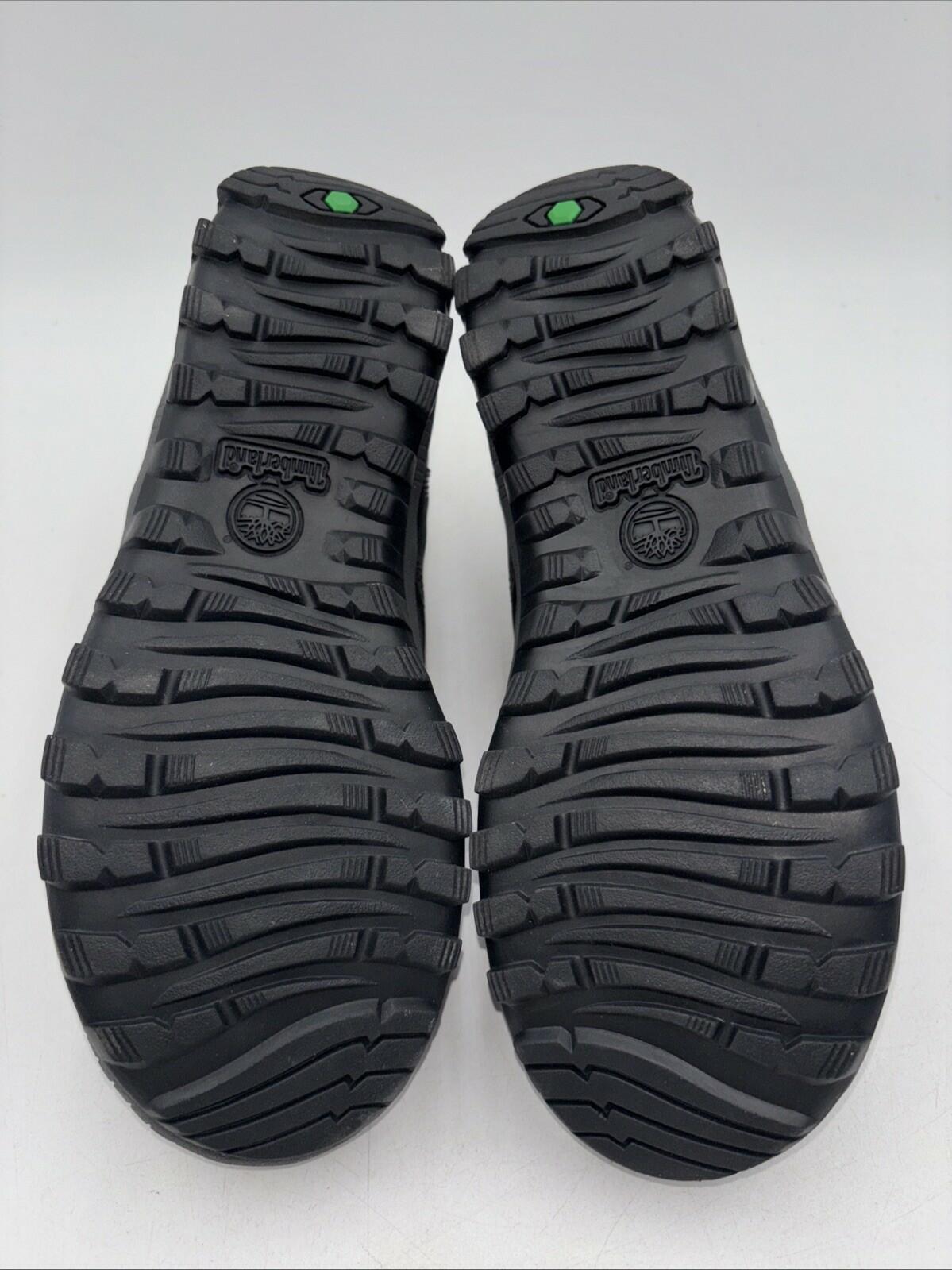 The Timberland Mt Hayes Womens Waterproof Lace Up Boots in size 6 are a durable and stylish choice for casual outdoor occasions. With a round toe and low heel, these ankle boots feature a waterproof design with Primaloft lining for added warmth. The black leather upper and rubber outsole provide long-lasting wear, making them a practical and fashionable option for any active woman. The lace-up closure and solid pattern give these boots a versatile look that can be worn in various settings, from everyday wear to outdoor adventures.- bottom soles are slightly worn